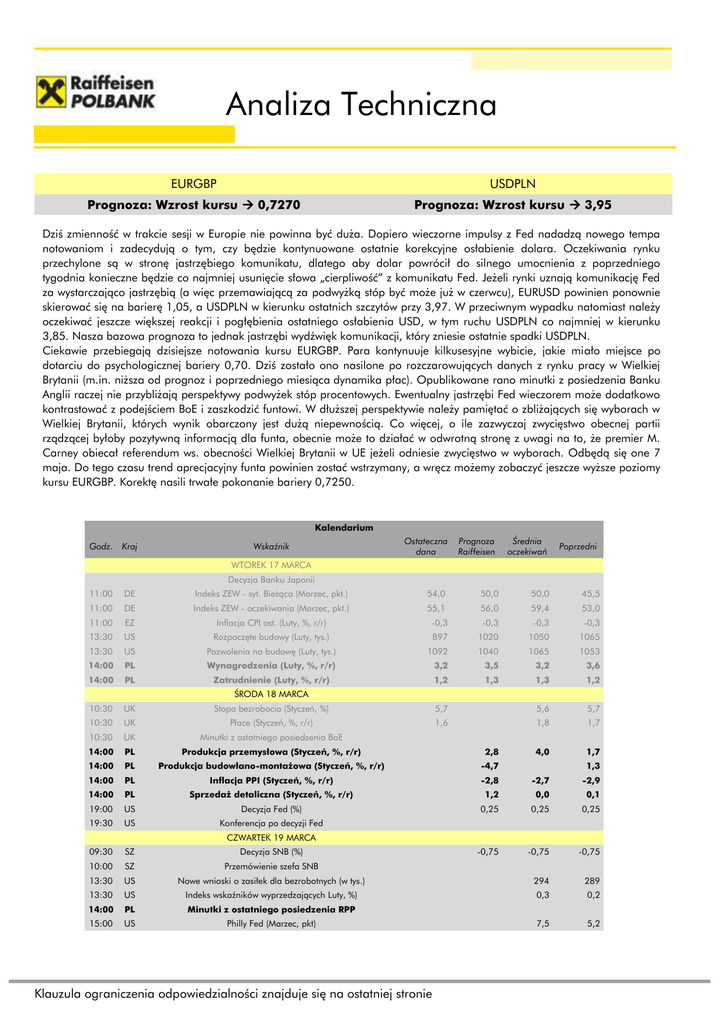 Analiza Techniczna EURGBP USDPLN Prognoza: Wzrost kursu 0,7270 Prognoza: Wzrost kursu 3,95 Dziś zmienność w trakcie sesji w Europie nie powinna być duża. Dopiero wieczorne impulsy z Fed nadadzą nowego tempa notowaniom i zadecydują o tym, czy będzie kontynuowane ostatnie korekcyjne osłabienie dolara. Oczekiwania rynku przechylone są w stronę jastrzębiego komunikatu, dlatego aby dolar powrócił do silnego umocnienia z poprzedniego tygodnia konieczne będzie co najmniej usunięcie słowa „cierpliwość” z komunikatu Fed. Jeżeli rynki uznają komunikację Fed za wystarczająco jastrzębią (a więc przemawiającą za podwyżką stóp być może już w czerwcu), EURUSD powinien ponownie skierować się na barierę 1,05, a USDPLN w kierunku ostatnich szczytów przy 3,97. W przeciwnym wypadku natomiast należy oczekiwać jeszcze większej reakcji i pogłębienia ostatniego osłabienia USD, w tym ruchu USDPLN co najmniej w kierunku 3,85. Nasza bazowa prognoza to jednak jastrzębi wydźwięk komunikacji, który zniesie ostatnie spadki USDPLN. Ciekawie przebiegają dzisiejsze notowania kursu EURGBP. Para kontynuuje kilkusesyjne wybicie, jakie miało miejsce po dotarciu do psychologicznej bariery 0,70. Dziś zostało ono nasilone po rozczarowujących danych z rynku pracy w Wielkiej Brytanii (m.in. niższa od prognoz i poprzedniego miesiąca dynamika płac). Opublikowane rano minutki z posiedzenia Banku Anglii raczej nie przybliżają perspektywy podwyżek stóp procentowych. Ewentualny jastrzębi Fed wieczorem może dodatkowo kontrastować z podejściem BoE i zaszkodzić funtowi. W dłuższej perspektywie należy pamiętać o zbliżających się wyborach w Wielkiej Brytanii, których wynik obarczony jest dużą niepewnością. Co więcej, o ile zazwyczaj zwycięstwo obecnej partii rządzącej byłoby pozytywną informacją dla funta, obecnie może to działać w odwrotną stronę z uwagi na to, że premier M. Carney obiecał referendum ws. obecności Wielkiej Brytanii w UE jeżeli odniesie zwycięstwo w wyborach. Odbędą się one 7 maja. Do tego czasu trend aprecjacyjny funta powinien zostać wstrzymany, a wręcz możemy zobaczyć jeszcze wyższe poziomy kursu EURGBP. Korektę nasili trwałe pokonanie bariery 0,7250. Kalendarium Godz. Kraj Wskaźnik Ostateczna dana Prognoza Raiffeisen Średnia oczekiwań Poprzedni WTOREK 17 MARCA Decyzja Banku Japonii 11:00 DE Indeks ZEW - syt. Bieżąca (Marzec, pkt.) 54,0 50,0 50,0 45,5 11:00 DE Indeks ZEW - oczekiwania (Marzec, pkt.) 55,1 56,0 59,4 53,0 11:00 EZ Inflacja CPI ost. (Luty, %, r/r) -0,3 -0,3 -0,3 -0,3 13:30 US Rozpoczęte budowy (Luty, tys.) 897 1020 1050 1065 13:30 US Pozwolenia na budowę (Luty, tys.) 1092 1040 1065 1053 14:00 PL Wynagrodzenia (Luty, %, r/r) 3,2 3,5 3,2 3,6 14:00 PL Zatrudnienie (Luty, %, r/r) 1,2 1,3 1,3 1,2 ŚRODA 18 MARCA 10:30 UK Stopa bezrobocia (Styczeń, %) 5,7 5,6 5,7 10:30 UK Płace (Styczeń, %, r/r) 1,6 1,8 1,7 10:30 UK Minutki z ostatniego posiedzenia BoE 14:00 PL Produkcja przemysłowa (Styczeń, %, r/r) 2,8 4,0 1,7 14:00 PL Produkcja budowlano-montażowa (Styczeń, %, r/r) -4,7 14:00 PL Inflacja PPI (Styczeń, %, r/r) -2,8 -2,7 -2,9 14:00 PL Sprzedaż detaliczna (Styczeń, %, r/r) 1,2 0,0 0,1 19:00 US Decyzja Fed (%) 0,25 0,25 0,25 19:30 US Konferencja po decyzji Fed 09:30 SZ Decyzja SNB (%) -0,75 -0,75 -0,75 10:00 SZ Przemówienie szefa SNB 13:30 US Nowe wnioski o zasiłek dla bezrobotnych (w tys.) 294 289 13:30 US Indeks wskaźników wyprzedzających Luty, %) 0,3 0,2 14:00 PL Minutki z ostatniego posiedzenia RPP 15:00 US Philly Fed (Marzec, pkt) 7,5 5,2 1,3 CZWARTEK 19 MARCA Klauzula ograniczenia odpowiedzialności znajduje się na ostatniej stronie EURGBP USDPLN Prognoza: Wzrost kursu 0,7270 Prognoza: Wzrost kursu 3,95 Opór Kurs Wsparcie 0,7400 0,7350 0,7250 0,7230 0,7100 0,7000 0,6800 Po odbiciu od najniższego poziomu od 2007 roku i psychologicznej bariery 0,70, kurs EURGBP od kilku sesji rośnie i dziś zbliża się do istotnej bariery 0,7250. Przebiegają tu zniesienia średnio- i długoterminowych trendów spadkowych, dlatego jego pokonanie będzie istotnym impulsem do utrwalenia kilkusesyjnego odbicia. Dziś jeszcze bariera ta może być testowana, ale niekoniecznie pokonana. P EURGBP USDPLN Prognoza: Wzrost kursu 0,7270 Prognoza: Wzrost kursu 3,95 3,9700 Opór 3,9500 3,9170 Kurs Wsparcie 3,9020 3,9000 3,8710 3,8500 W ramach korekty ostatniego wybicia kursu USDPLN para wróciła do okolic 3,90, gdzie konsoliduje się w oczekiwaniu na nowe impulsy. Istotne w ostatnich dniach było to, że udało się wrócić pod 3,95. Poziom ten stanowi 50% skali wzrostów z 2008 i 2009r. po naniesieniu tego ruchu na wybicie jakie miało miejsce w ubiegłym roku z poziomu 3,0. Tym istotniejsze będzie więc trwałe pokonanie okolic 3,95, które otworzy drogę do dalszych dynamicznych wzrostów kursu. Klauzula ograniczenia odpowiedzialności znajduje się na ostatniej stronie P Raiffeisen Polbank ul. Piękna 20, 00-549 Warszawa www.raiffeisenpolbank.com Departament Sprzedaży Rynków Finansowych Telefon: + 48 22 585 37 86 Faks: + 48 22 585 33 68 W razie pytań lub uwag dotyczących powyższej publikacji proszę o kontakt: [email protected] Dealing: Bydgoszcz tel.: (22) 585 37 73 Poznań tel.: (61) 655 47 51 Gdańsk tel.: (22) 585 37 71 Rzeszów tel.: (22) 585 37 75 Katowice tel.: (22) 585 37 69 Szczecin tel.: (22) 585 37 71 Kielce tel.: (22) 585 37 70 Toruń tel.: (22) 585 37 72 Kraków tel.: (22) 585 37 70 Warszawa tel.: (22) 585 37 79 Lublin tel.: (22) 585 37 75 Wrocław tel.: (22) 585 37 74 Łódź tel.: (22) 585 37 75 Zielona Góra tel.: (22) 585 37 73 Klauzula Ograniczenia Odpowiedzialności: Niniejsza wiadomość została przesłana zgodnie z Pani/Pana zleceniem. Informujemy, że zgoda na otrzymywanie informacji może zostać w każdej chwili odwołana. Jeżeli nie życzy sobie Pani/ Pan dalszego otrzymywania materiałów przygotowanych przez Zespół Analiz Ekonomicznych Raiffeisen Bank Polska S.A (