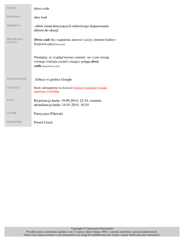 HASŁO dress code WYMOWA dres kod DEFINICJA «zbiór PRZYKŁADY UŻYCIA Dress code bez wątpienia stanowi ważny element kultury korporacyjnej (praca.pl). zasad dotyczących właściwego dopasowania ubioru do okazji» Pamiętaj, że wygląd można zmienić, na czym żerują rożnego rodzaju oszuści znający potęgę dress codu (pracosfera.com). WIZUALIZACJE Zobacz w grafice Google LICENCJA Hasło udostępnione na licencji Creative Commons Uznanie autorstwa 3.0 Polska DATA Rejestracja hasła: 19.09.2014, 22.34, ostatnia aktualizacja hasła: 14.01.2015, 10.54 AUTOR Patrycjusz Pilawski REDAKTOR Paweł Ciach Copyright © Uniwersytet Warszawski Wszelkie prawa zastrzeżone zgodnie z art.17 ustawy z dnia 4 lutego 1994 r. o prawie autorskim i prawach pokrewnych. Teksty oraz zdjęcia zawarte w tym dokumencie nie mogą być publikowane bez wiedzy i zgody właściciela praw autorskich. Powered by TCPDF (www.tcpdf.org)