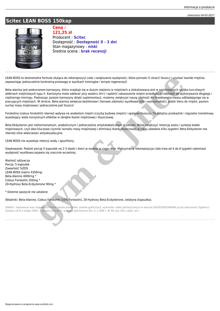 Informacje o produkcie Utworzono 04-03-2017 Scitec LEAN BOSS 150kap Cena : 121,25 zł Producent : Scitec Dostępność : Dostępność 0 - 3 dni Stan magazynowy : niski Średnia ocena : brak recenzji ju ic e LEAN BOSS to ekstremalna formuła służąca do rekompozycji ciała i zwiększania wydajności, która pomoże Ci stracić tłuszcz i uzyskać twarde mięśnie, zapewniając jednocześnie konkretną przewagę w wynikach treningów i tempie regeneracji! Beta-alanina jest prekursorem karnozyny, która znajduje się w dużym stężeniu w mięśniach a zlokalizowana jest w najsilniejszych szybko kurczliwych włóknach mięśniowych typu II. Karnozyna może odebrać jony wodoru (H+) i opóźnić zakwaszenie mięśni przedłużając zdolność do wykonywania długiego i ciężkiemgo treningu. Podnosząc poziom karnozyny dzięki suplementacji, możemy zwiększyć naszą zdolność do likwidowania kwasu odkładającego się w pracujących mięśniach. W skrócie, Beta-alanina zwiększa beztlenowe i tlenowe zdolności wysiłkowe (siła i wytrzymałość), pobór tlenu do mięśni, poziom suchej masy mięśniowej i jednocześnie pali tłuszcz! Forskolina (coleus forskohlii) również wpływa na anabolizm mięśni (czystą budowę mięśni) i spalanie tłuszczu. To potężny przekaźnik i regulator komórkowy wywołujący wiele korzystnych efektów w obrębie tkanki mięśniowej i tłuszczowej. Beta-Ekdysteron jest niehormonalnym, anabolicznym i jednocześnie antykatabolicznym środkiem. Może zwiększyć retencję azotu i syntezę białek mięśniowych, czyli dwa kluczowe czynniki wzrostu masy mięśniowej i eliminacji tkanki tłuszczowej w ciągu zaledwie kilku tygodni! Beta-Ekdysteron ma również silne właściwości antyoksydacyjne. LEAN BOSS nie wywołuje retencji wody i opuchlizny. m Wartość odżywcza Porcja: 5 kapsułek Zawartość %ZDS LEAN BOSS matrix 4350mg: Beta-Alanine 4000mg * Coleus Forskohlii 250mg * 20-Hydroxy Beta-Ecdysterone 90mg * & Dawkowanie: Podziel porcję 5 kapsułek na 2-3 dawki i bierz je osobno w ciągu dnia. Maksymalna rekompozycja ciała trwa od 4 do 6 tygodni natomiast wydajność wysiłkowa pojawia się znacznie wcześniej. gy * Dzienne spożycie nie ustalone Składniki: Beta-Alanine, Coleus Forskohlii (10% Forskolin), 20-Hydroxy Beta-Ecdysterone, żelatyna (kapsułka). UWAGA - kopiowanie oraz rozpowszechnianie opisów produktów, znaków graficznych, wykresów i tabel zamieszczonych w witrynie SKLEPZODZYWKAMI.pl jest zabronione! Zgodnie z Ustawą z dnia 4 lutego 1994 r. o prawie autorskim i prawach pokrewnych (Dz. U. z 2006 r. Nr 90, poz. 631 z późn. zm.) Wygenerowano w programie www.oscGold.com