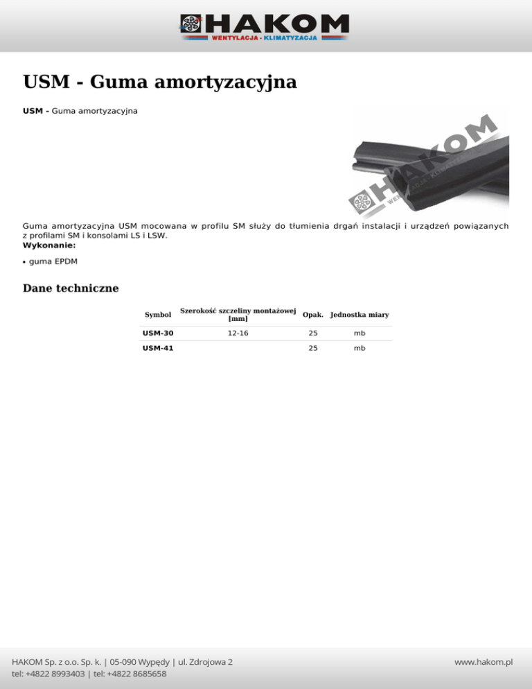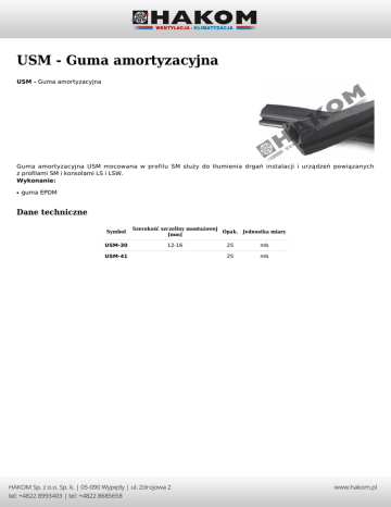 USM - Guma amortyzacyjna USM - Guma amortyzacyjna Guma amortyzacyjna USM mocowana w profilu SM służy do tłumienia drgań instalacji i urządzeń powiązanych z profilami SM i konsolami LS i LSW. Wykonanie: ● guma EPDM Dane techniczne Symbol USM-30 USM-41 Szerokość szczeliny montażowej Opak. Jednostka miary [mm] 12-16 25 mb 25 mb
