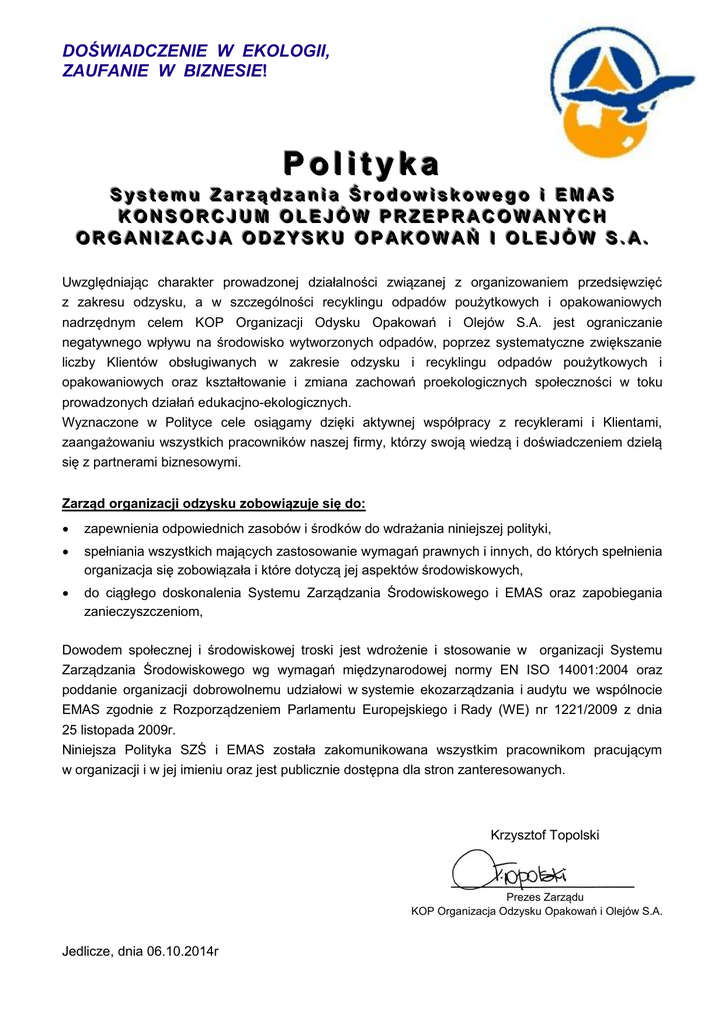 DOŚWIADCZENIE W EKOLOGII, ZAUFANIE W BIZNESIE! Polityka S S yyss tt ee m m uu ZZ aa rr zz ąą dd zz aa nn ii aa Ś Ś rr oo dd oo w w ii ss kk oow w ee gg oo ii E EM MA AS S K KO ON NS SO OR RC C JJ U UM M O O LL E E JJ Ó ÓW W P PR R ZZ E EP PR RA AC CO OW WA AN NY YC CH H O OR RG GA AN N II ZZ A AC C JJ A A O OD D ZZ Y YS SK KU U O OP PA AK KO OW WA AŃ Ń II O O LL E E JJ Ó ÓW W S S .. A A.. Uwzględniając charakter prowadzonej działalności związanej z organizowaniem przedsięwzięć z zakresu odzysku, a w szczególności recyklingu odpadów poużytkowych i opakowaniowych nadrzędnym celem KOP Organizacji Odysku Opakowań i Olejów S.A. jest ograniczanie negatywnego wpływu na środowisko wytworzonych odpadów, poprzez systematyczne zwiększanie liczby Klientów obsługiwanych w zakresie odzysku i recyklingu odpadów poużytkowych i opakowaniowych oraz kształtowanie i zmiana zachowań proekologicznych społeczności w toku prowadzonych działań edukacjno-ekologicznych. Wyznaczone w Polityce cele osiągamy dzięki aktywnej współpracy z recyklerami i Klientami, zaangażowaniu wszystkich pracowników naszej firmy, którzy swoją wiedzą i doświadczeniem dzielą się z partnerami biznesowymi. Zarząd organizacji odzysku zobowiązuje się do: zapewnienia odpowiednich zasobów i środków do wdrażania niniejszej polityki, spełniania wszystkich mających zastosowanie wymagań prawnych i innych, do których spełnienia organizacja się zobowiązała i które dotyczą jej aspektów środowiskowych, do ciągłego doskonalenia Systemu Zarządzania Środowiskowego i EMAS oraz zapobiegania zanieczyszczeniom, Dowodem społecznej i środowiskowej troski jest wdrożenie i stosowanie w organizacji Systemu Zarządzania Środowiskowego wg wymagań międzynarodowej normy EN ISO 14001:2004 oraz poddanie organizacji dobrowolnemu udziałowi w systemie ekozarządzania i audytu we wspólnocie EMAS zgodnie z Rozporządzeniem Parlamentu Europejskiego i Rady (WE) nr 1221/2009 z dnia 25 listopada 2009r. Niniejsza Polityka SZŚ i EMAS została zakomunikowana wszystkim pracownikom pracującym w organizacji i w jej imieniu oraz jest publicznie dostępna dla stron zanteresowanych. Krzysztof Topolski Prezes Zarządu KOP Organizacja Odzysku Opakowań i Olejów S.A. Jedlicze, dnia 06.10.2014r