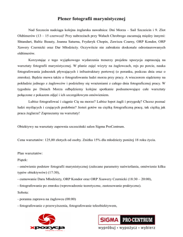 Plener fotografii marynistycznej Nad Szczecin nadciąga kolejna żeglarska nawałnica: Dni Morza – Sail Szczeicin i 9. Zlot Oldtimerów (13 – 15 czerwca)! Przy nabrzeżach przy Wałach Chrobrego zacumują między innymi: Shtandart, Baltic Beauty, Joanna Saturna, Fryderyk Chopin, Zawisza Czarny, ORP Kondor, ORP Xawery Czernicki oraz Dar Młodzieży. Oczywiście nie zabraknie doskonale odrestaurowanych oldtimerów. Korzystając z tego wyjątkowego wydarzenia trenerzy projektu xpozycja zapraszają na warsztaty fotografii marynistycznej. W planie zajęć wizyty na żaglowcach, rejs po porcie, nauka fotografowania jednostek pływających i infrastruktury portowej (o poranku, podczas dnia oraz o zmroku). Będzie mowa także o fotografowaniu ludzi morza przy pracy. A wieczorem siądziemy na pokładzie jednego z żaglowców i podzielmy się wrażeniami z całego dnia fotograficznej pracy. W tygodniu po Dniach Morza odbędziemy kolejne spotkanie podsumowujące całe warsztaty połączone z pokazem zdjęć i ich szczegółowym omówieniem. Lubisz fotografować i ciągnie Cię na morze? Lubisz łopot żagli i przygodę? Chcesz poznać ludzi myślących i czujących podobnie? Jesteś gotów na ciężką fotograficzną pracę, tak ciężką jak praca żeglarza? Zapraszamy na warsztaty! Obiektywy na warsztaty zapewnia szczeciński salon Sigma ProCentrum. Cena warsztatów: 125,00 złotych od osoby. Zniżka 15% dla młodzieży poniżej 18 roku życia. Plan warsztatów: Piątek: - omówienie podstaw fotografii marynistycznej (zalecane parametry naświetlania, omówienie kilku typów obiektywów) (17:30), - cumowanie Daru Młodzieży, ORP Kondor oraz ORP Xsawery Czernicki (18:30 – 20:00), - fotografowanie po zmroku (wprowadzenie teoretyczne, zastosowanie praktyczne). Sobota: - poranna zaprawa na żaglowcu (08:00) - fotografowanie z przewyższenia, fotografowanie teleobiektywem, - rejs oldtimerem, fotografowanie żaglowców z wody oraz infrastruktury portowej i stoczniowej (11:00 – 13:00), - samodzielne fotografowanie, - wieczorne spotkanie na żaglowcu, omówienie dnia (od 21:00), - fotografia nocna – pokaz ogni sztucznych (24:00) Niedziela: - fotografowanie o wschodzie słońca (od 04:00), - fotografia marynistyczna, oldtimery – detal (od 08:00), - fotografowanie odcumowania, wyjście z portu (od 17:00) (Stacja Pilotów Skolwin lub Wały Chrobrego). Dzień w tygodniu: - spotkanie podsumowujące, pokaz i omówienie zdjęć, dyskusja (od 18:00).