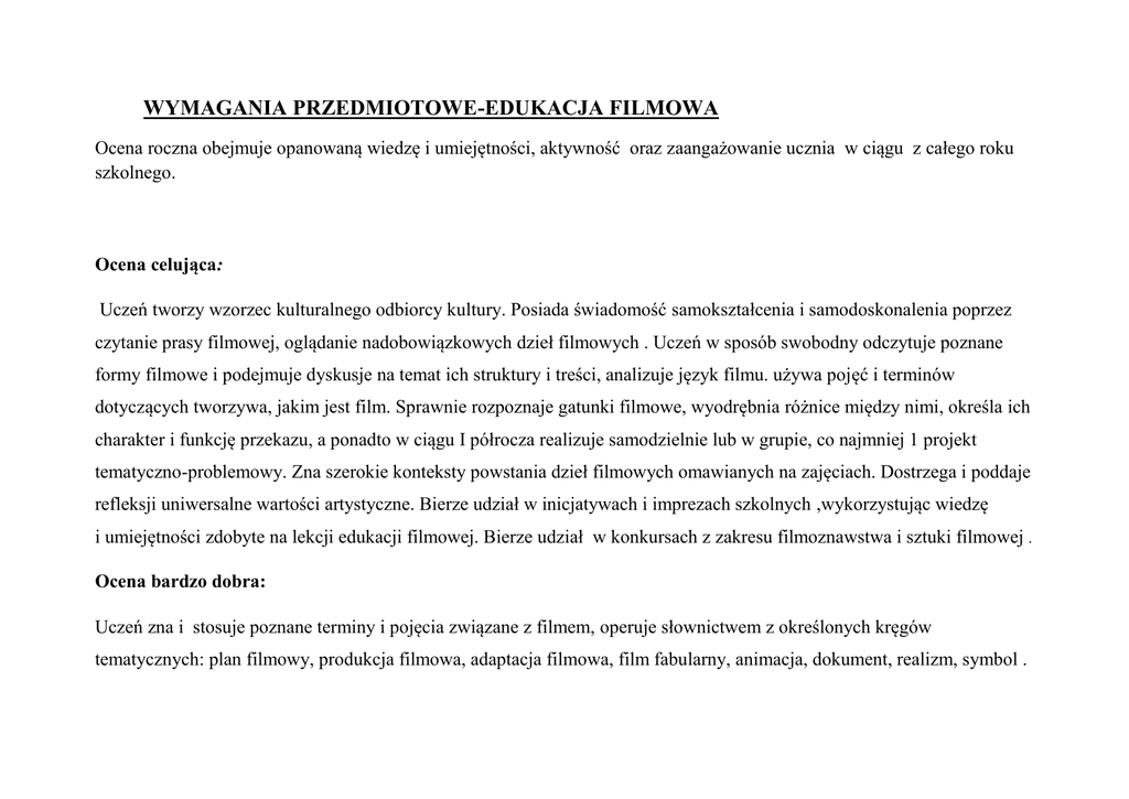 WYMAGANIA PRZEDMIOTOWE-EDUKACJA FILMOWA Ocena roczna obejmuje opanowaną wiedzę i umiejętności, aktywność oraz zaangażowanie ucznia w ciągu z całego roku szkolnego. Ocena celująca: Uczeń tworzy wzorzec kulturalnego odbiorcy kultury. Posiada świadomość samokształcenia i samodoskonalenia poprzez czytanie prasy filmowej, oglądanie nadobowiązkowych dzieł filmowych . Uczeń w sposób swobodny odczytuje poznane formy filmowe i podejmuje dyskusje na temat ich struktury i treści, analizuje język filmu. używa pojęć i terminów dotyczących tworzywa, jakim jest film. Sprawnie rozpoznaje gatunki filmowe, wyodrębnia różnice między nimi, określa ich charakter i funkcję przekazu, a ponadto w ciągu I półrocza realizuje samodzielnie lub w grupie, co najmniej 1 projekt tematyczno-problemowy. Zna szerokie konteksty powstania dzieł filmowych omawianych na zajęciach. Dostrzega i poddaje refleksji uniwersalne wartości artystyczne. Bierze udział w inicjatywach i imprezach szkolnych ,wykorzystując wiedzę i umiejętności zdobyte na lekcji edukacji filmowej. Bierze udział w konkursach z zakresu filmoznawstwa i sztuki filmowej . Ocena bardzo dobra: Uczeń zna i stosuje poznane terminy i pojęcia związane z filmem, operuje słownictwem z określonych kręgów tematycznych: plan filmowy, produkcja filmowa, adaptacja filmowa, film fabularny, animacja, dokument, realizm, symbol . Jest aktywny i zaangażowany w przedmiot w toku lekcji, rozpoznaje gatunki filmowe, rozmawia na temat ich budowy i treści, podejmuje próby analizy języka omawianych filmów. Omawia na podstawie poznanych dzieł filmowych podstawowe, ponadczasowe zagadnienia egzystencjalne np. miłość, przyjaźń, śmierć, cierpienie, lęk, nadzieja, wiara religijna, samotność, inność, poczucie wspólnoty, solidarność, sprawiedliwość; dostrzega i poddaje refleksji uniwersalne wartości humanistyczne .Świadomie, odpowiedzialnie, selektywnie korzysta (jako odbiorca i nadawca) z elektronicznych środków przekazywania informacji, w tym z Internetu, wyszukując informacje potrzebne na lekcjach. Posiada świadomość samokształcenia i samodoskonalenia poprzez oglądanie nadobowiązkowych dzieł filmowych i czytanie literatury specjalistycznej Uczestniczy w realizacji projektu uczniowskiego, potrafi pracować w grupie. Ocena dobra: Uczeń rozumie poznane terminy i pojęcia, włącza poznaną terminologię do języka czynnego, jest aktywny na lekcji, samodzielnie dociera do informacji o historii filmów, ich twórcach– w książkach, prasie, mediach elektronicznych . Opisuje odczucia, które budzi w nim dzieło filmowe. Rozpoznaje i omawia problematykę utworu, uwzględnia w interpretacji potrzebne konteksty, np. biograficzny, historyczny. Charakteryzuje środki muzyczne w filmie. Tworzy spójną charakterystykę postaci filmowej, scenariusz filmowy. prelekcję do filmu lub prezentację na jego temat w postaci referatu, prezentacji multimedialnej. Uczestniczy w dyskusji, uzasadnia własne zdanie. Stosuje zasady etykiety językowej – wie, w jaki sposób zwracać się do rozmówcy w dyskusji nad problemem, potrafi zasadnie formułować krytykę dzieła filmowego. Uczestniczy w projekcie uczniowskim. Ocena dostateczna Uczeń zna podstawowe terminy i pojęcia nauczane na zajęciach, wykazuje zmienne zaangażowanie na zajęciach. Opisuje odczucia, które budzi w nim dzieło filmowe. Rozpoznaje problematykę utworu Samodzielnie dociera do informacji o filmach i ich twórcach– w książkach, prasie ,Internecie. Zna treść dzieł filmowych zaproponowanych przez nauczyciela, rozpoznaje problematykę utworu, rozpoznaje podstawowe konteksty np.: historyczny, biograficzny, które są podstawą stworzenia dzieła filmowego. Tworzy spójną charakterystykę postaci filmowej; Dokonuje oceny dzieła filmowego. Podejmuje próbę napisania scenariusza filmowego, recenzji filmu. Rozpoznaje odmiany gatunkowe filmu fabularnego: komedia, dramat . Ocena dopuszczająca Uczeń rozumie wybrane pojęcia i terminy, z pomocą nauczyciela tworzy ich definicję i wskazuje cechy podstawowych gatunków filmowych. Zna treść dzieł filmowych zaproponowanych przez nauczyciela Przedstawia najistotniejsze treści wypowiedzi w takim porządku, w jakim występują one w filmie. charakteryzuje postacie występujące filmie . Przypisuje czytany scenariusz filmowy do właściwego rodzaju filmowego (film fabularny, dokumentalny, animowany) . Pisze recenzję z obejrzanego filmu . Bierze udział w realizowanym projekcie uczniowskim Ocena niedostateczna Uczeń nie opanował wymagań na ocenę dopuszczającą. .