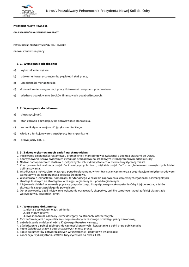 News \ Poszukiwany Pełnomocnik Prezydenta Nowej Soli ds. Odry PREZYDENT MIASTA NOWA SÓL OGŁASZA NABÓR NA STANOWISKO PRACY PE?NOMOCNIKA PREZYDENTA NOWEJ SOLI DS. ODRY nazwa stanowiska pracy 1. 1. Wymagania niezbędne: a) wykształcenie wyższe, b) udokumentowany co najmniej pięcioletni staż pracy, c) umiejętności menadżerskie, d) doświadczenie w organizacji pracy i kierowaniu zespołem pracowników, e) wiedza o pozyskiwaniu środków finansowych pozabudżetowych. 1. 2. Wymagania dodatkowe: a) dyspozycyjność, b) stan zdrowia pozwalający na sprawowanie stanowiska, c) komunikatywna znajomość języka niemieckiego, d) wiedza o funkcjonowaniu współpracy trans granicznej, e) prawo jazdy kat. B. 1. 3. Zakres wykonywanych zadań na stanowisku: 2. Inicjowanie działalności reklamowej, promocyjnej i marketingowej związanej z żeglugą statkami po Odrze. 3. Koordynowanie spraw związanych z żeglugą śródlądową na środkowym i transgranicznym odcinku Odry. 4. Nadzór nad operatorem statków turystycznych i ich wykorzystaniem w ofercie turystycznej miasta. 5. Koordynowanie i realizacja projektów inwestycyjnych i tzw. ,,miękkich projektów” z uwzględnieniem zewnętrznych źródeł dofinansowania. 6. Współpraca z instytucjami o zasięgu ponadregionalnym, w tym transgranicznym oraz z organizacjami międzynarodowymi zajmującymi się nadodrzańską żeglugą śródlądową. 7. Współpraca z jednostkami samorządu terytorialnego w zakresie zapewnienia wzajemnych zgodności poszczególnych strategii lokalnych ze strategiami o zasięgu regionalnym i ponadregionalnym. 8. Inicjowanie działań w zakresie poprawy gospodarczego i turystycznego wykorzystania Odry i jej dorzecza, a także skuteczniejszego zapobiegania powodziom. 9. Opracowywanie, bądź inicjowanie wykonania opracowań, ekspertyz, opinii o tematyce nadodrzańskiej dla potrzeb województwa, powiatów i gmin. 1. 4. Wymagane dokumenty: 1. oferta z wnioskiem o zatrudnienie; 2. list motywacyjny; 3. kwestionariusz osobowy –wzór dostępny na stronach internetowych; 2. CV z informacjami o wykształceniu i opisem dotychczasowego przebiegu pracy zawodowej; 3. zaświadczenie o niekaralności z Krajowego Rejestru Karnego; 4. oświadczenie o pełnej zdolności do czynności prawnych i korzystaniu z pełni praw publicznych; 5. kopie świadectw pracy z dotychczasowych miejsc pracy; 6. kopie dokumentów potwierdzających wykształcenie i dodatkowe kwalifikacje; 7. koncepcja wykorzystania statków turystycznych na okres 4 lat. News \ Poszukiwany Pełnomocnik Prezydenta Nowej Soli ds. Odry Wymagane dokumenty aplikacyjne należy składać w Sekretariacie Urzędu na adres: ul. Marsz. J. Piłsudskiego 12, 67-100 Nowa Sól z dopiskiem: „Oferta pracy- Pełnomocnik Prezydenta Miasta ds. Odry” w terminie do dnia 12 października 2012 r. Aplikacje, które wpłyną do Urzędu po wyżej określonym terminie nie będą rozpatrywane. Urząd Miejski zaprosi telefonicznie kandydatów wybranych spośród ofert na rozmowy kwalifikacyjne. Informacja o wyniku naboru będzie umieszczona na stronie internetowej Biuletynu Informacji Publicznej (http://www.bip.nowasol.mserwer.pl) oraz na tablicy informacyjnej Urzędu Miejskiego przy ul. M. J. Piłsudskiego 12. Wymagane dokumenty aplikacyjne: list motywacyjny, szczegółowe CV (z uwzględnieniem dokładnego przebiegu kariery zawodowej), powinny być opatrzone klauzulą: „Wyrażam zgodę na przetwarzanie moich danych osobowych zawartych w ofercie pracy dla potrzeb niezbędnych do realizacji procesu rekrutacji zgodnie z ustawą z dnia 29.08.1997 o ochronie danych osobowych (Dz. U. z 2002 r. Nr 101, poz. 926) oraz ustawą z dn. 22.03.1999 o pracownikach samorządowych (Dz. U. z 2001 r Nr 142, poz. 1593 ze zm.)”. Prezydent Miasta Wadim Tyszkiewicz Powered by TCPDF (www.tcpdf.org)