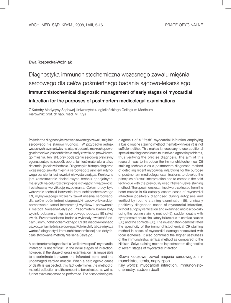 ARCH. MED. SĄD. KRYM., 2008, LVIII, 5-16 PRACE ORYGINALNE Ewa Rzepecka-Woźniak Diagnostyka immunohistochemiczna wczesnego zawału mięśnia sercowego dla celów pośmiertnego badania sądowo-lekarskiego Immunohistochemical diagnostic management of early stages of myocardial infarction for the purposes of postmortem medicolegal examinations Z Katedry Medycyny Sądowej Uniwersytetu Jagiellońskiego Collegium Medicum Kierownik: prof. dr hab. med. M. Kłys Pośmiertna diagnostyka zaawansowanego zawału mięśnia sercowego nie stanowi trudności. W przypadku jednak wczesnych faz martwicy na etapie badania makroskopowego niemożliwe jest odróżnienie strefy zawału od prawidłowego mięśnia. Ten fakt, przy podejrzeniu sercowej przyczyny zgonu, rzutuje na sposób pobrania i ilość materiału, a także determinuje dalsze badania. Diagnostyka histopatologiczna wczesnego zawału mięśnia sercowego z użyciem rutynowego barwienia jest również niewystarczająca. Konieczne jest zastosowanie dodatkowych technik specjalnych, mających na celu rozstrzygnięcie istniejących wątpliwości i ostateczną weryfikację rozpoznania. Celem pracy było wdrożenie techniki barwienia immunohistochemicznego C9, wykrywającego wczesny zawał mięśnia sercowego, dla celów pośmiertnej diagnostyki sądowo-lekarskiej, opracowanie zasad interpretacji wyników i porównanie z metodą Nielsena-Selye’go. Przedmiotem badań były wycinki pobrane z mięśnia sercowego podczas 90 sekcji zwłok. Przeprowadzone badania wykazały swoistość odczynu immunohistochemicznego C9 dla niedokrwiennego uszkodzenia mięśnia sercowego. Potwierdziły także większą wartość diagnostyki immunohistochemicznej nad dotychczas stosowaną metodą Nielsena-Selye’go. A postmortem diagnosis of a “well developed” myocardial infarction is not difficult. In the initial stages of infarction, however, at the stage of gross examination it is impossible to discriminate between the infarcted zone and the undamaged cardiac muscle. When a cardiogenic cause of death is suspected, this fact determines the method of material collection and the amount to be collected, as well as further examinations to be performed. The histopathological diagnosis of a “fresh” myocardial infarction employing a basic routine staining method (hematoxylin/eosin) is not sufficient either. This makes it necessary to use additional special staining techniques to resolve diagnostic problems, thus verifying the precise diagnosis. The aim of this research was to introduce the immunohistochemical C9 staining technique as a postmortem diagnostic method of detecting recent myocardial infarctions for the purpose of postmortem medicolegal examinations, to develop the principles of result interpretation and to compare the said technique with the previously used Nielsen-Selye staining method. The specimens examined were collected from the heart muscle in 90 autopsy cases: cases of myocardial infarction positively diagnosed during autopsies and verified by routine staining examination (5); clinically positively diagnosed cases of myocardial infarction, without autopsy verification and examined microscopically using the routine staining method (5); sudden deaths with symptoms of acute circulatory failure due to cardiac causes (50) and the controls (30). The investigation demonstrated the specificity of the immunohistochemical C9 staining method in cases of myocardial damage associated with focal ischemia. It also confirmed the higher usefulness of the immunohistochemical method as compared to the Nielsen–Selye staining method in postmortem diagnostics of recent stages of myocardial infarction. Słowa kluczowe: zawał mięśnia sercowego, immunohistochemia, nagły zgon Key words: myocardial infarction, immunohistochemistry, sudden death 6 Ewa Rzepecka-Woźniak WSTĘP Z praktyki sądowo-lekarskiej wynika, że znaczną grupę wśród zgonów nagłych stanowią zgony w mechanizmie ostrej niewydolności krążenia na podłożu zmian chorobowych serca, najczęściej miażdżycy. Nagła śmierć sercowa jest przykładem nieoczekiwanej śmierci, która postępuje szybko, zwykle w przeciągu 1 godziny od momentu pojawienia się objawów lub może być wcale nie poprzedzona objawami. W części przypadków właśnie nagły zgon sercowy jest pierwszym objawem choroby niedokrwiennej mięśnia serca. Ostatecznym mechanizmem nagłej śmierci sercowej jest prawie zawsze arytmia (asystolia lub migotanie komór). Jedną z przyczyn wiodących ku temu może być zawał mięśnia sercowego [1, 2]. Diagnostyka makro- i mikroskopowa zaawansowanego zawału nie stanowi trudności, jednak jego wczesne fazy pozostają zwykle nieuchwytne w ocenie makroskopowej, a także niejednokrotnie są niewidoczne mikroskopowo lub trudne do jednoznacznej interpretacji. Rutynowe barwienie hematoksyliną i eozyną, uwidaczniające zmiany zaawansowane, jest zwykle niewystarczające w ocenie zmian wczesnych. Wynika stąd konieczność zastosowania, w ramach poszerzenia diagnostyki mikroskopowej, innych metod barwienia [3, 4]. Istotne jest również to, aby zastosowana technika cechowała się specyficznością dla uszkodzenia niedokrwiennego komórek mięśnia sercowego i była przydatna w ocenie materiału pośmiertnego. Tym bardziej, że potrzebę poszerzenia diagnostyki pośmiertnej uzasadniają nie tylko wymóg precyzyjnego ustalenia przyczyny zgonu, ale i wynikające ze śmierci następstwa opiniodawcze. Najistotniejsze z nich to opiniowanie o wypadkach przy pracy, domniemanie błędu medycznego, kwestie ubezpieczeniowe lub rozstrzygnięcia w przypadkach śmierci za kierownicą. Zgodne z zasadami opiniowanie wymaga nie tylko przeprowadzenia pełnej sekcji zwłok, ale i wykonania badań dodatkowych: histopatologicznych i toksykologicznych (rutynowych – wykrywanie alkoholu etylowego, a w uzasadnionych przypadkach poszerzonych). Konieczne jest także zapoznanie się z okolicznościami śmierci i wywiadem ch