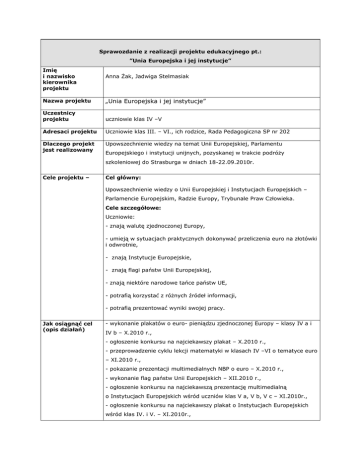 Sprawozdanie z realizacji projektu edukacyjnego pt.: ”Unia Europejska i jej instytucje” Imię i nazwisko kierownika projektu Anna Żak, Jadwiga Stelmasiak Nazwa projektu „Unia Europejska i jej instytucje” Uczestnicy projektu uczniowie klas IV –V Adresaci projektu Uczniowie klas III. – VI., ich rodzice, Rada Pedagogiczna SP nr 202 Dlaczego projekt jest realizowany Upowszechnienie wiedzy na temat Unii Europejskiej, Parlamentu Europejskiego i instytucji unijnych, pozyskanej w trakcie podróży szkoleniowej do Strasburga w dniach 18-22.09.2010r. Cele projektu – Cel główny: Upowszechnienie wiedzy o Unii Europejskiej i Instytucjach Europejskich – Parlamencie Europejskim, Radzie Europy, Trybunale Praw Człowieka. Cele szczegółowe: Uczniowie: - znają walutę zjednoczonej Europy, - umieją w sytuacjach praktycznych dokonywać przeliczenia euro na złotówki i odwrotnie, - znają Instytucje Europejskie, - znają flagi państw Unii Europejskiej, - znają niektóre narodowe tańce państw UE, - potrafią korzystać z różnych źródeł informacji, - potrafią prezentować wyniki swojej pracy. Jak osiągnąć cel (opis działań) - wykonanie plakatów o euro- pieniądzu zjednoczonej Europy – klasy IV a i IV b – X.2010 r., - ogłoszenie konkursu na najciekawszy plakat – X.2010 r., - przeprowadzenie cyklu lekcji matematyki w klasach IV –VI o tematyce euro – XI.2010 r., - pokazanie prezentacji multimedialnych NBP o euro – X.2010 r., - wykonanie flag państw Unii Europejskich – XII.2010 r., - ogłoszenie konkursu na najciekawszą prezentację multimedialną o Instytucjach Europejskich wśród uczniów klas V a, V b, V c – XI.2010r., - ogłoszenie konkursu na najciekawszy plakat o Instytucjach Europejskich wśród klas IV. i V. – XI.2010r., - ogłoszenie dnia 10.01.2011r. DNIEM EUROPEJSKIM; zaproszenie gości: IEU, delegacja klas III. i VI., rodziców, podsumowanie wszystkich działań, wręczenie nagród, pokaz tańców europejskich w wykonaniu uczniów klasy V. Czas realizacji projektu 10.01.2011r. Przewidywany efekt (rezultat) W projekcie powstały: - plakaty o euro i instytucjach europejskich, - scenariusze lekcji dla klas IV-VI, - prezentacje multimedialne o instytucjach europejskich, - artykuł w gazetce szkolnej, - flagi państw UE, - informacje dot. w/w projektu na szkolnej stronie internetowej. Proponowana forma - wystawa plakatów, rozpowszechnienia rezultatów - scenariusze lekcji matematyki przekazane nauczycielom, którzy nie uczestniczyli w projekcie - prezentacja najlepszych prezentacji multimedialnych na godzinach wychowawczych i stronie internetowej szkoły, - opis pobytu w Strasburgu i opis projektu na stronie internetowej szkoły, - artykuł w gazetce szkolnej, - zorganizowanie DNIA EUROPEJSKIEGO z pokazem tańców wybranych krajów UE. Ewaluacja projektu Ewaluacja miała charakter ustrukturyzowanej rozmowy na temat projektu z uczniami realizującymi poszczególne zadania. Poniżej najczęstsze i najbardziej charakterystyczne odpowiedzi. Co było dla mnie ważne? - ciekawe informacje o innych krajach - prezentacje multimedialne - układanie choreografii tańców - poznanie nowych koleżanek i kolegów - ciekawe lekcje matematyki - próby tańca Co było problemem? - nie wszyscy jednakowo pracowali, niektórzy nie robili nic - Parlament Europejski oglądaliśmy tylko na zdjęciach Szkoła podstawowa nr 202 im. Jana Pawła II w Łodzi