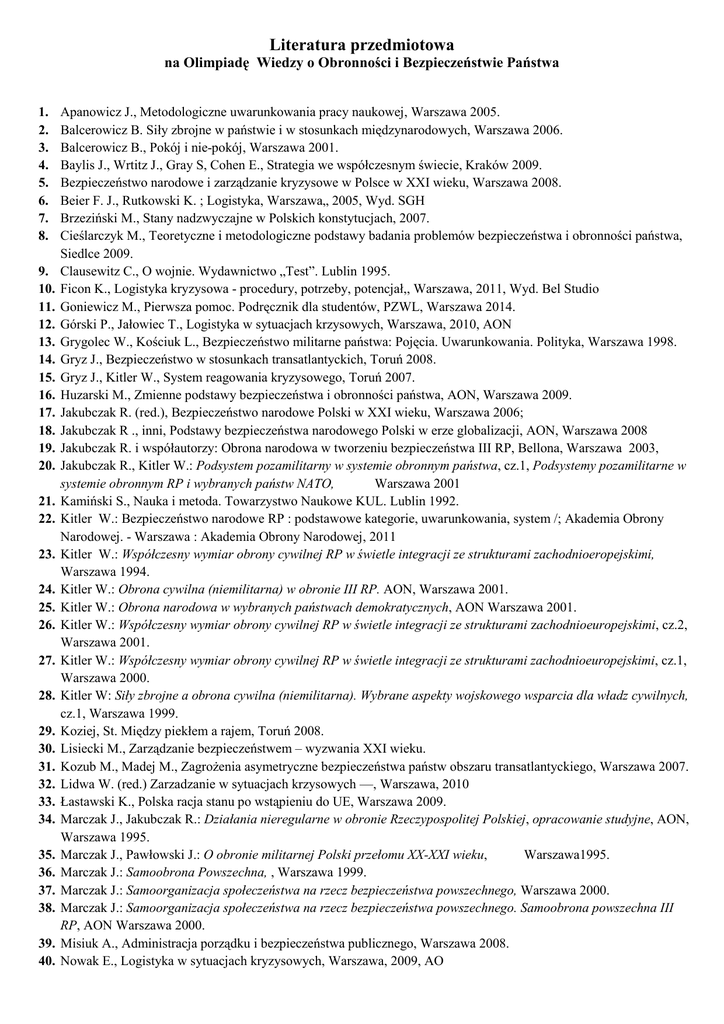 Literatura przedmiotowa na Olimpiadę Wiedzy o Obronności i Bezpieczeństwie Państwa 1. 2. 3. 4. 5. 6. 7. 8. 9. 10. 11. 12. 13. 14. 15. 16. 17. 18. 19. 20. 21. 22. 23. 24. 25. 26. 27. 28. 29. 30. 31. 32. 33. 34. 35. 36. 37. 38. 39. 40. Apanowicz J., Metodologiczne uwarunkowania pracy naukowej, Warszawa 2005. Balcerowicz B. Siły zbrojne w państwie i w stosunkach międzynarodowych, Warszawa 2006. Balcerowicz B., Pokój i nie-pokój, Warszawa 2001. Baylis J., Wrtitz J., Gray S, Cohen E., Strategia we współczesnym świecie, Kraków 2009. Bezpieczeństwo narodowe i zarządzanie kryzysowe w Polsce w XXI wieku, Warszawa 2008. Beier F. J., Rutkowski K. ; Logistyka, Warszawa„ 2005, Wyd. SGH Brzeziński M., Stany nadzwyczajne w Polskich konstytucjach, 2007. Cieślarczyk M., Teoretyczne i metodologiczne podstawy badania problemów bezpieczeństwa i obronności państwa, Siedlce 2009. Clausewitz C., O wojnie. Wydawnictwo „Test”. Lublin 1995. Ficon K., Logistyka kryzysowa - procedury, potrzeby, potencjał,, Warszawa, 2011, Wyd. Bel Studio Goniewicz M., Pierwsza pomoc. Podręcznik dla studentów, PZWL, Warszawa 2014. Górski P., Jałowiec T., Logistyka w sytuacjach krzysowych, Warszawa, 2010, AON Grygolec W., Kościuk L., Bezpieczeństwo militarne państwa: Pojęcia. Uwarunkowania. Polityka, Warszawa 1998. Gryz J., Bezpieczeństwo w stosunkach transatlantyckich, Toruń 2008. Gryz J., Kitler W., System reagowania kryzysowego, Toruń 2007. Huzarski M., Zmienne podstawy bezpieczeństwa i obronności państwa, AON, Warszawa 2009. Jakubczak R. (red.), Bezpieczeństwo narodowe Polski w XXI wieku, Warszawa 2006; Jakubczak R ., inni, Podstawy bezpieczeństwa narodowego Polski w erze globalizacji, AON, Warszawa 2008 Jakubczak R. i współautorzy: Obrona narodowa w tworzeniu bezpieczeństwa III RP, Bellona, Warszawa 2003, Jakubczak R., Kitler W.: Podsystem pozamilitarny w systemie obronnym państwa, cz.1, Podsystemy pozamilitarne w systemie obronnym RP i wybranych państw NATO, Warszawa 2001 Kamiński S., Nauka i metoda. Towarzystwo Naukowe KUL. Lublin 1992. Kitler W.: Bezpieczeństwo narodowe RP : podstawowe kategorie, uwarunkowania, system /; Akademia Obrony Narodowej. - Warszawa : Akademia Obrony Narodowej, 2011 Kitler W.: Współczesny wymiar obrony cywilnej RP w świetle integracji ze strukturami zachodnioeropejskimi, Warszawa 1994. Kitler W.: Obrona cywilna (niemilitarna) w obronie III RP. AON, Warszawa 2001. Kitler W.: Obrona narodowa w wybranych państwach demokratycznych, AON Warszawa 2001. Kitler W.: Współczesny wymiar obrony cywilnej RP w świetle integracji ze strukturami zachodnioeuropejskimi, cz.2, Warszawa 2001. Kitler W.: Współczesny wymiar obrony cywilnej RP w świetle integracji ze strukturami zachodnioeuropejskimi, cz.1, Warszawa 2000. Kitler W: Siły zbrojne a obrona cywilna (niemilitarna). Wybrane aspekty wojskowego wsparcia dla władz cywilnych, cz.1, Warszawa 1999. Koziej, St. Między piekłem a rajem, Toruń 2008. Lisiecki M., Zarządzanie bezpieczeństwem – wyzwania XXI wieku. Kozub M., Madej M., Zagrożenia asymetryczne bezpieczeństwa państw obszaru transatlantyckiego, Warszawa 2007. Lidwa W. (red.) Zarzadzanie w sytuacjach krzysowych —, Warszawa, 2010 Łastawski K., Polska racja stanu po wstąpieniu do UE, Warszawa 2009. Marczak J., Jakubczak R.: Działania nieregularne w obronie Rzeczypospolitej Polskiej, opracowanie studyjne, AON, Warszawa 1995. Marczak J., Pawłowski J.: O obronie militarnej Polski przełomu XX-XXI wieku, Warszawa1995. Marczak J.: Samoobrona Powszechna, , Warszawa 1999. Marczak J.: Samoorganizacja społeczeństwa na rzecz bezpieczeństwa powszechnego, Warszawa 2000. Marczak J.: Samoorganizacja społeczeństwa na rzecz bezpieczeństwa powszechnego. Samoobrona powszechna III RP, AON Warszawa 2000. Misiuk A., Administracja porządku i bezpieczeństwa publicznego, Warszawa 2008. Nowak E., Logistyka w sytuacjach kryzysowych, Warszawa, 2009, AO 41. 42. 43. 44. 45. 46. 47. 48. 49. 50. 51. 52. 53. 54. 55. 56. 57. 58. 59. 60. 61. 62. 63. 64. 65. 66. 67. 68. 69. 70. 71. 72. Nowak E.; Zarządzanie logistyczne w sytuacjach kryzysowych, Warszawa, 2008, AON Olszewski R., Bezpieczeństwo współczesnego świata, Toruń 2006. Pawłowski J. Strategiczne problemy i dylematy we współczesnym świecie, Toruń 2004. Polska w transatlantyckiej przestrzeni bezpieczeństwa, Warszawa, AON, 2009. Słownik terminów z zakresu bezpieczeństwa narodowego. AON, Warszawa 2002. Ratajewski J., Elementy naukoznawstwa i główne kierunki rozwoju nauki europejskiej. Uniwersytet Śląski. Katowice 1993. Skrabacz A., Kitler W., Bezpieczeństwo ludności cywilnej. Pojęcie, organizacja i zadania w czasie pokoju, kryzysu i wojny, TWO, Warszawa 2010. Skrabacz A., Bezpieczeństwo społeczne. Podstawy teoretyczne i praktyczne, Dom Wydawniczy Elipsa, Warszawa 2012. Skrabacz A.: Organizacje pozarządowe w tworzeniu bezpieczeństwa narodowego III RP ( w świetle integracji z Unią Europejską), „Zeszyt Problemowy TWO” 2003, nr 2(33). Skrzyp J.: Geostrategiczne aspekty bezpieczeństwa Polski, Warszawa1999. Stańczyk J., Współczesne pojmowanie bezpieczeństwa, Instytut Studiów Politycznych PAN, Warszawa 1996 Stefański M., Prewencyjno-edukacyjne działania Policji w systemie bezpieczeństwa publicznego, Słupsk 2012. Sulowski St. Bezpieczeństwo wewnętrzne państwa. Wybrane zagadnienia. Warszawa 2009. Szeremietiew R.: Strategia narodowego bezpieczeństwa, Warszawa 2000 . Szymonik A.; Logistyka w bezpieczenstwie, Warszawa, 2010, Wyd. Difin Szyndel B.: Tadeusz Kościuszko 1746-1817, Warszawa 1991. Ścibiorek Z.: Wojna czy pokój, Wrocław 1999. Wirtualny Podręcznik Pierwszej Pomocy 2007-2012. Wojnarowski J., System obronności państwa, AON, Warszawa 2005. Zięba R., Bezpieczeństwo międzynarodowe po zimnej wojnie, Warszawa 2008. Zięba R., Wstęp do teorii polityki zagranicznej państwa, Toruń 2006. Konstytucja Rzeczpospolitej Polskiej. Ustawa z dnia 6 kwietnia 1990 r. o Policji 