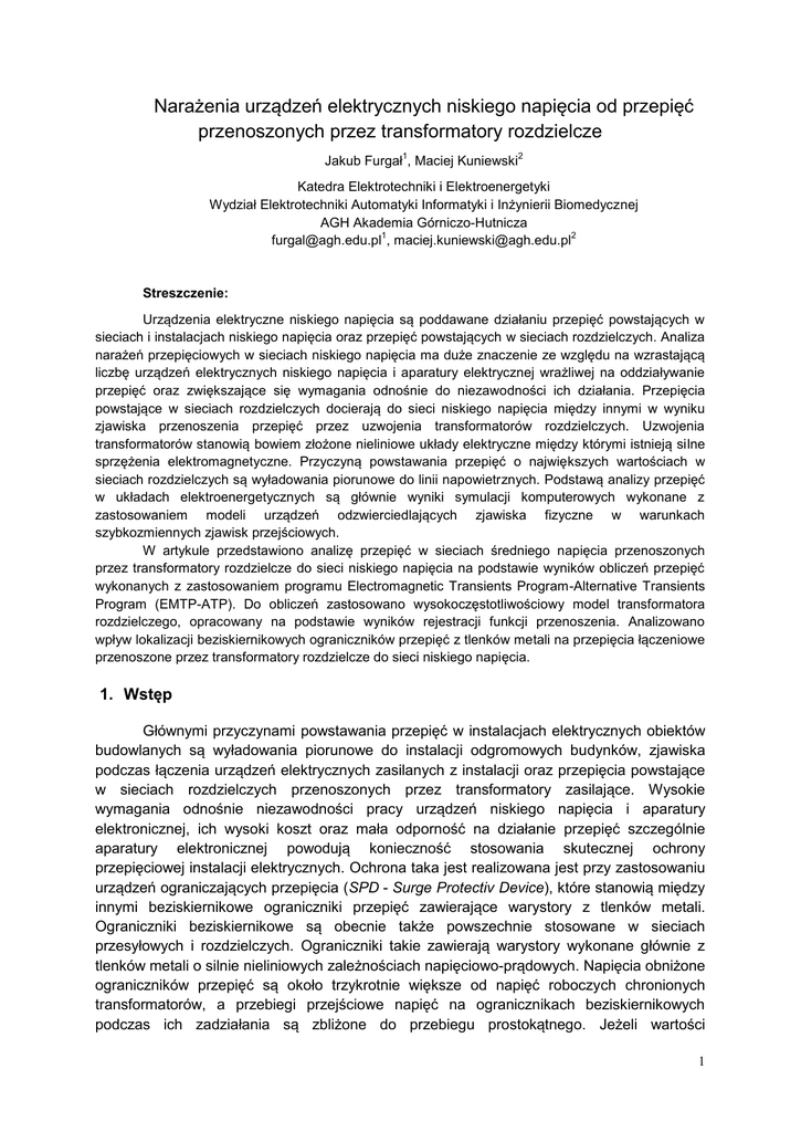 Narażenia urządzeń elektrycznych niskiego napięcia od przepięć przenoszonych przez transformatory rozdzielcze 1 Jakub Furgał , Maciej Kuniewski 2 Katedra Elektrotechniki i Elektroenergetyki Wydział Elektrotechniki Automatyki Informatyki i Inżynierii Biomedycznej AGH Akademia Górniczo-Hutnicza 1 2 [email protected] , [email protected] Streszczenie: Urządzenia elektryczne niskiego napięcia są poddawane działaniu przepięć powstających w sieciach i instalacjach niskiego napięcia oraz przepięć powstających w sieciach rozdzielczych. Analiza narażeń przepięciowych w sieciach niskiego napięcia ma duże znaczenie ze względu na wzrastającą liczbę urządzeń elektrycznych niskiego napięcia i aparatury elektrycznej wrażliwej na oddziaływanie przepięć oraz zwiększające się wymagania odnośnie do niezawodności ich działania. Przepięcia powstające w sieciach rozdzielczych docierają do sieci niskiego napięcia między innymi w wyniku zjawiska przenoszenia przepięć przez uzwojenia transformatorów rozdzielczych. Uzwojenia transformatorów stanowią bowiem złożone nieliniowe układy elektryczne między którymi istnieją silne sprzężenia elektromagnetyczne. Przyczyną powstawania przepięć o największych wartościach w sieciach rozdzielczych są wyładowania piorunowe do linii napowietrznych. Podstawą analizy przepięć w układach elektroenergetycznych są głównie wyniki symulacji komputerowych wykonane z zastosowaniem modeli urządzeń odzwierciedlających zjawiska fizyczne w warunkach szybkozmiennych zjawisk przejściowych. W artykule przedstawiono analizę przepięć w sieciach średniego napięcia przenoszonych przez transformatory rozdzielcze do sieci niskiego napięcia na podstawie wyników obliczeń przepięć wykonanych z zastosowaniem programu Electromagnetic Transients Program-Alternative Transients Program (EMTP-ATP). Do obliczeń zastosowano wysokoczęstotliwościowy model transformatora rozdzielczego, opracowany na podstawie wyników rejestracji funkcji przenoszenia. Analizowano wpływ lokalizacji beziskiernikowych ograniczników przepięć z tlenków metali na przepięcia łączeniowe przenoszone przez transformatory rozdzielcze do sieci niskiego napięcia. 1. Wstęp Głównymi przyczynami powstawania przepięć w instalacjach elektrycznych obiektów budowlanych są wyładowania piorunowe do instalacji odgromowych budynków, zjawiska podczas łączenia urządzeń elektrycznych zasilanych z instalacji oraz przepięcia powstające w sieciach rozdzielczych przenoszonych przez transformatory zasilające. Wysokie wymagania odnośnie niezawodności pracy urządzeń niskiego napięcia i aparatury elektronicznej, ich wysoki koszt oraz mała odporność na działanie przepięć szczególnie aparatury elektronicznej powodują konieczność stosowania skutecznej ochrony przepięciowej instalacji elektrycznych. Ochrona taka jest realizowana jest przy zastosowaniu urządzeń ograniczających przepięcia (SPD - Surge Protectiv Device), które stanowią między innymi beziskiernikowe ograniczniki przepięć zawierające warystory z tlenków metali. Ograniczniki beziskiernikowe są obecnie także powszechnie stosowane w sieciach przesyłowych i rozdzielczych. Ograniczniki takie zawierają warystory wykonane głównie z tlenków metali o silnie nieliniowych zależnościach napięciowo-prądowych. Napięcia obniżone ograniczników przepięć są około trzykrotnie większe od napięć roboczych chronionych transformatorów, a przebiegi przejściowe napięć na ogranicznikach beziskiernikowych podczas ich zadziałania są zbliżone do przebiegu prostokątnego. Jeżeli wartości 1 maksymalne przepięć są mniejsze od napięcia zadziałania ogranicznika, to ograniczniki z tlenków metali pracują na początkowych, praktycznie prostoliniowych fragmentach charakterystyk napięciowo-prądowych i przepięcia takie nie są zmniejszane przez ograniczniki. Przepięcia o niewielkich wartościach maksymalnych, zawierające zwykle składowe oscylacyjne o zróżnicowanych częstotliwościach, są generowane zwykle w układach elektroenergetycznych podczas czynności łączeniowych lub niektórych stanów awaryjnych takich jak na przykład zwarcia [1-3]. Przepięcia powstające w sieciach rozdzielczych docierają do zacisków transformatorów i propagują przez uzwojenia, narażając układy izolacyjne uzwojeń i urządzeń niskiego napięcia połączonych z transformatorami [48]. Przepięcia są przenoszone przez transformatory w wyniku sprzężeń indukcyjnych i pojemnościowych między uzwojeniami o innym napięciu znamionowym [9]. Przykładowy schemat zastępczy uzwojeń jednej fazy transformatora przedstawiono na rysunku 1. Rys. 1. Schemat zastępczy uzwojeń jednej fazy transformatora: Cgn, Cdn - pojemności wejściowe odpowiednio uzwojenia górnego napięcia (gn) i uzwojenia dolnego napięcia (dn), Cg,Cd - pojemności doziemne odpowiednio uzwojenia górnego napięcia i uzwojenia dolnego napięcia, Cgd - pojemność między uzwojeniami uzwojenia górnego napięcia i dolnego napięcia, Lg, Ld, Lgd - indukcyjności własne odpowiednio uzwojenia górnego napięcia i uzwojenia dolnego napięcia oraz indukcyjność wzajemna między uzwojeniami [10]. Przepięcie powstające na zaciskach wejściowych jednego uzwojenia transformatora jest przenoszone do innych uzwojeń. Wartości maksymalne i przebiegi przepięć przenoszonych przez transformatory rozdzielcze są zależne od przebiegów przepięć powstających w sieciach średniego napięcia, zjawisk przejściowych w transformatorach , zjawisk w układach zasilanych niskiego napięcia i zastosowanej ochrony przepięciowej [5]. Dodatkowy wpływ na przepięcia przenoszone mogą mieć zjawiska rezonansowe wewnątrz transformatorów. Przepięcie indukowane w uzwojeniach sprzężonych posiada odmienny kształt od przepięcia wymuszającego. Zmiana kształtu przepięcia przenoszonego wynika z nieliniowej charakterystyki częs