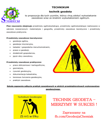TECHNIKUM technik geodeta to propozycja dla tych uczniów, którzy chcą zdobyć wykształcenie zawodowe wraz ze średnim wykształceniem ogólnym. Plan nauczania obejmuje przedmioty ogólnokształcące, przedmioty ogólnokształcące realizowane w zakresie rozszerzonym: matematyka i geografia, przedmioty zawodowe teoretyczne i przedmioty zawodowe praktyczne. Przedmioty zawodowe teoretyczne: geodezja ogólna, geodezja inżynieryjna, kataster i gospodarka nieruchomościami, prawo w geodezji, działalność gospodarcza, język obcy zawodowy. Przedmioty zawodowe praktyczne: prace obliczeniowe i kartograficzne, geomatyka, rysunek geodezyjny, dokumentacja katastralna, terenowe ćwiczenia geodezyjne, praktyki zawodowe. Szkoła zapewnia odbycie praktyk zawodowych w ełckich przedsiębiorstwach wykonawstwa geodezyjnego. TECHNIK GEODETA – MIERZYMY W SUKCES ! Zapraszamy na fb.com/GeodezjaChemiak Plan nauczania obejmuje: * Przedmioty ogólnokształcące. * Przedmioty ogólnokształcące realizowane w zakresie rozszerzonym: matematyka i geografia. * Przedmioty zawodowe teoretyczne: geodezja ogólna, geodezja inżynieryjna, kataster i gospodarka nieruchomościami, prawo w geodezji, działalność gospodarcza, język obcy zawodowy. * Przedmioty zawodowe praktyczne: prace obliczeniowe i kartograficzne, geomatyka, rysunek geodezyjny, dokumentacja katastralna, terenowe ćwiczenia geodezyjne, praktyki zawodowe. W zawodzie technik geodeta uczniowie zdają egzaminy potwierdzające kwalifikacje w zawodzie w zakresie: B.34. Wykonywanie pomiarów sytuacyjnych i wysokościowych oraz opracowanie wyników pomiarów. B.35. Obsługa geodezyjna inwestycji budowlanych. B.36. Wykonywanie prac geodezyjnych związanych z katastrem i gospodarką nieruchomościami. Ukończenie szkoły umożliwia uzyskanie świadectwa dojrzałości oraz dyplomu potwierdzającego kwalifikacje w zawodzie, honorowanego przez kraje UE. Ponadto absolwenci zostają przygotowani pod względem teoretycznym i praktycznym do wykonywania zawodu oraz otrzymują świetne podstawy do dalszego kształcenia na wyższych uczelniach (także w Ełku na kierunku Geodezja i Kartografia na Wydziale Studiów Technicznych i Społecznych Uniwersytetu Warmińsko-Mazurskiego). Ukończenie technikum daje wiele możliwości dalszego kształcenia i rozwoju zawodowego. Uczniowie poznają tajniki wykonywania pomiarów najnowocześniejszymi, wysokiej klasy instrumentami geodezyjnymi. Znaczna część zajęć ma charakter praktyczny (w tym ćwiczenia terenowe, zajęcia komputerowe, prace obliczeniowe i kartograficzne). Wykwalifikowani geodeci należą do grupy specjalistów bardzo poszukiwanych na rynku pracy w kraju i za granicą. Absolwenci technikum geodezyjnego znajdują zatrudnienie w: * firmach geodezyjnych, * firmach budowlanych i deweloperskich, biurach projektowych, * firmach zajmujących się obrotem i zarządzaniem nieruchomościami, wyceną nieruchomości, rolnictwem itp.; * organach administracji państwowej i samorządowej; * albo prowadzą własną działalność gospodarczą. Nasi uczniowie: pracują w doskonale wyposażonych pracowniach: 13 nowoczesnych stanowisk komputerowych ze specjalistycznym oprogramowaniem (m.in. Winkalk, Mikromap, C-Geo, EW-Mapa), wykonują pomiary najnowocześniejszym sprzętem pomiarowym: odbiorniki satelitarne GPS/RTK, tachimetry elektroniczne, niwelator kodowy, teodolity elektroniczne, wykrywacz instalacji podziemnych i wiele innych, uczestniczą w bezpłatnych szkoleniach prowadzonych przez firmy zewnętrzne, takich jak obsługa geodezyjnych programów komputerowych, obsługa odbiorników satelitarnych (projekt „Nowoczesna Edukacja – Kompetentny Pracownik”), uczestniczą w wyjazdach studyjnych, konkursach przedmiotowych i innych, wykazują się dużą aktywnością w środowisku szkolnym i lokalnym, uzyskują bardzo wysokie wyniki egzaminów zawodowych – prawie 100% zdawalność, co roku nasi uczniowie uzyskują wyniki znacznie przekraczające średnią wojewódzką i ogólnopolską, uzyskują bardzo wysokie wyniki nauczania (Stypendium Prezesa Rady Ministrów, Stypendia Jana Pawła II), otrzymują ciekawą, dobrze płatną pracę wakacyjną w lokalnych firmach geodezyjnych, otrzymując bardzo pozytywne opinie pracodawców.