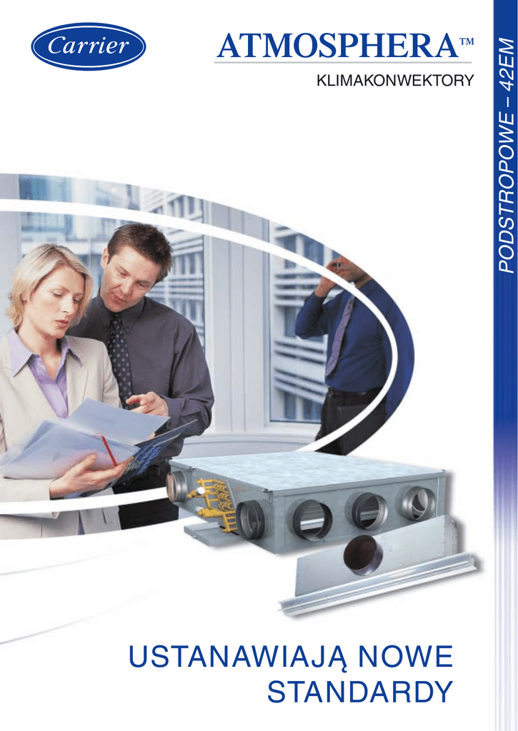 KLIMAKONWEKTORY USTANAWIAJĄ NOWE STANDARDY PODSTROPOWE – 42EM ATMOSPHERA TM ŚWIAT POTRZEB Celem spełnienia wymagań stawianych przez profesjonalistów, Carrier dostosowuje zakres oferowanych rozwiązań do wszystkich możliwych zastosowań i rodzajów systemów. Przed wprowadzeniem do oferty nowego urządzenia Carrier przeprowadza gruntowne badanie rynkowe, po którym następuje ocena techniczna przeprowadzana przez zespół instalatorów, użytkowników oraz niezależne organizacje certyfikujące (wszystkie produkty Carrier posiadają certyfikat Eurovent). Carrier, jako światowy lider w dziedzinie klimatyzacji, dokładnie dopracowuje każdy aspekt poszczególnych elementów proponowanego rozwiązania (agregat chłodniczy + klimakonwektor + kanał + dyfuzor + sterownik): prostotę instalacji i obsługi, komfort, estetykę, jakość dostarczanego powietrza, energooszczędność. Uwzględniane są oczekiwania każdego uczestnika projektu: inwestora, projektantów, instalatorów, kadry zarządzającej i użytkowników. Laboratorium testowe stanowi kolejną unikalną cechę Carrier: Możemy tutaj symulować warunki środowiskowe i indywidualne wymagania każdego projektu. Wszystko po to, aby upewnić się, że oferowane rozwiązanie spełnia założenia projektowe oraz spełnia wymagania klientów w jak najszerszym stopniu. Dzięki temu projektant może oszczędzić czas i cieszyć się spokojem ducha. SKONCENTROWANE OSIĄGI EFEKTYWNIEJSZA FILTRACJA Standardowo instalowane filtry typu G3 zapewniają bardzo wysoką filtrację powietrza. Do zastosowań specjalnych dostępne są jako opcja filtry o jeszcze wyższej efektywności. ZWIĘKSZONA WYDAJNOŚĆ CIEPLNA – Dziki nachylonej konstrukcji wymienników Carrier optymalizuje powierzchnię wymiany ciepła. Wymiennik tego typu posiada więcej rurek niż wymiennik pionowy, co oznacza większą wydajność przy identycznych wymiarach zewnętrznych urządzenia. – Wentylator sześciobiegowy – trzy wybrane biegi okablowane fabrycznie – pozwala na optymalne dopasowanie wydajności cieplnej, wydatku tłoczonego powietrza i mocy akustycznej urządzenia, zgodnie z preferencjami klienta. STAŁA KONTROLA JAKOŚCI POWIETRZA Klimakonwektory Carrier są wyposażone w czujnik CO2*, dzięki któremu stale analizują skład powietrza w pomieszczeniu i kontrolują dopływ jego świeżego wydatku, w zależności od zajętości pomieszczenia. Taka kontrola daje konkretne oszczędności zarówno czasu jak i energii. * Czujnik CO2 jako opcja PEŁNA ELASTYCZNOŚĆ UPRASZCZAJĄCA INSTALACJĘ Celem spełnienia wymagań i uwarunkowań każdej instalacji, Carrier oferuje obecnie następujące modele: KONFIGURACJA LINIOWA • Wersja kompaktowa (o optymalizowanej długości od 810 mm) 810 mm KONFIGURACJA MODUŁOWA • Wersje modułowe (konfiguracja S, U oraz I) Elastyczność w sposobie podłączania kanałów powietrznych 770 mm Dostępne króćce podłączeniowe z boku (o średnicy 200 mm) Konfiguracja wybierana w miejscu instalacji 1050 mm DOSTĘPNE KONFIGURACJE I S* U* * Wyłącznie w konfiguracji modułowej INTELIGENTNE STEROWANIE Klimakonwektory Carrier mogą być wyposażone w kilka różnych sterowników, przystosowanych do wszelkich wymagań dotyczących jakości powietrza, komfortu i zakładanej efektywności kosztowej instalacji. Od wersji najprostszej (termostatu ściennego) do najbardziej zaawansowanej (podłączenie do szyny komunikacyjnej), Carrier zawsze oferuje odpowiednie rozwiązanie. MODUBOOT: WYDAJNOŚĆ+ Dyfuzor sufitowy Moduboot kieruje strumień powietrza wzdłuż sufitu przy dużej prędkości, co sprzyja szybkiemu mieszaniu powietrza dopływającego z powietrzem w pomieszczeniu. Brak efektu „zimnego prysznica”; powietrze nie jest również zbyt ciepłe dla osób przebywających w pomieszczeniu. Cicha, dyskretna integracja z wystrojem sufitu. Carrier dopracowuje każdy detal, aby zapewnić zadowolenie swoich klientów. Dyfuzor sufitowy Moduboot można instalować w wielu różnych konfiguracjach. MAKSYMALNA REDUKCJA HAŁASU Każdy element klimakowektora Carrier jest zaprojektowany pod kątem optymalnych osiągów akustycznych: – Wentylator ma o wiele większą moc niż wymagana. Wszystko po to, aby zapewnić swobodny dopływ wymaganej ilości powietrza przy niskim poziomie hałasu i długiej żywotności. – Konstrukcja urządzenia i dobór materiałów izolacyjnych ograniczają poziom przenoszonych wibracji. MODELE O OPTYMALNYCH JEDNOLITYCH WYMIARACH Podstawową cechą klimakonwektorów Carrier, przyjętą już na etapie projektowania, jest prosta instalacja i obsługa w miejscu instalacji. Wszystkie modele mają taką samą wysokość (250 mm), a kompaktowe wymiary zapewniają zmniejszenie wymaganej przestrzeni międzystropowej. Jednolita konstrukcja modeli pozwala zracjonalizować prace instalacyjne, zmniejszając ilość koniecznych do wykonania pomiarów i eliminując ich potencjalne błędy. Prześwit: dodatkowe 35 mm (250 – 215 = 35) Taca skroplin ma zawsze tę samą wysokość, a odpływ skroplin jest zapewniony bez utraty dostępnego miejsca. DANE TECHNICZNE 42EM Nominalny przepływ powietrza przy średniej prędkości l/s Ilość króćców dopływu i powrotu powietrza*** 1.0 2.0 2.1 2.2 2.3 3.0 3.1 3.2 3.3 120 140 150 195 264 140 150 195 264 2+2 3+3 3+3 3+3 3+3 3+3 3+3 3+3 3+3 Dostępne ciśnienie statyczne przy nominalnym przepływie Pa 50 50 50 50 50 50 50 50 50 Całkowita wydajność chłodnicza, wymiennik wody zimnej* kW 2.86 3.56 3.75 4.72 5.97 4.22 4.48 5.69 5.23 Jawna wydajność chłodnicza kW 2.17 2.64 2.81 3.56 4.65 2.95 3.14 3.99 5.23 Wydajność grzewcza, wymiennik wody gorącej ** kW 2.43 3.28 3 3.6 4.46 2.88 3.04 3.74 4.75 Dostępna moc bez wentylatora (+5/-10%) W 500 1000 1000 2000 2000 1000 1000 2000 2000 Moc wentylatora przy 230 V W Nagrzewnica elektryczna 119 110 128 182 229 110 128 182 229 V6/V2/V1 V6/V2/V1 V5/V2/V1 V6/V3/V1 V6/V3/V1 V6/V2/V1 V5/V2/V1 V6/V3/V1 V6/V3/V1 dB(A) 36/47/51 30/47/51 34/44
