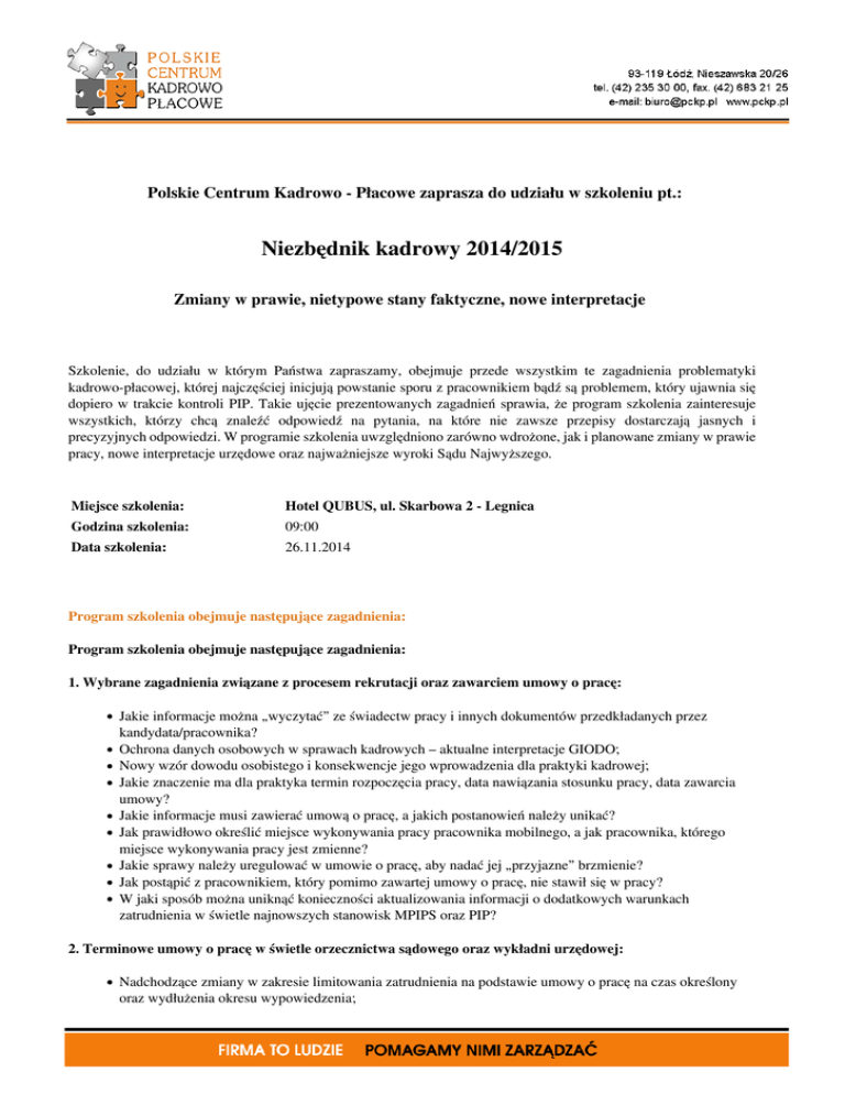 Polskie Centrum Kadrowo - Płacowe zaprasza do udziału w szkoleniu pt.: Niezbędnik kadrowy 2014/2015 Zmiany w prawie, nietypowe stany faktyczne, nowe interpretacje Szkolenie, do udziału w którym Państwa zapraszamy, obejmuje przede wszystkim te zagadnienia problematyki kadrowo-płacowej, której najczęściej inicjują powstanie sporu z pracownikiem bądź są problemem, który ujawnia się dopiero w trakcie kontroli PIP. Takie ujęcie prezentowanych zagadnień sprawia, że program szkolenia zainteresuje wszystkich, którzy chcą znaleźć odpowiedź na pytania, na które nie zawsze przepisy dostarczają jasnych i precyzyjnych odpowiedzi. W programie szkolenia uwzględniono zarówno wdrożone, jak i planowane zmiany w prawie pracy, nowe interpretacje urzędowe oraz najważniejsze wyroki Sądu Najwyższego. Miejsce szkolenia: Hotel QUBUS, ul. Skarbowa 2 - Legnica Godzina szkolenia: 09:00 Data szkolenia: 26.11.2014 Program szkolenia obejmuje następujące zagadnienia: Program szkolenia obejmuje następujące zagadnienia: 1. Wybrane zagadnienia związane z procesem rekrutacji oraz zawarciem umowy o pracę: Jakie informacje można „wyczytać” ze świadectw pracy i innych dokumentów przedkładanych przez kandydata/pracownika? Ochrona danych osobowych w sprawach kadrowych – aktualne interpretacje GIODO; Nowy wzór dowodu osobistego i konsekwencje jego wprowadzenia dla praktyki kadrowej; Jakie znaczenie ma dla praktyka termin rozpoczęcia pracy, data nawiązania stosunku pracy, data zawarcia umowy? Jakie informacje musi zawierać umową o pracę, a jakich postanowień należy unikać? Jak prawidłowo określić miejsce wykonywania pracy pracownika mobilnego, a jak pracownika, którego miejsce wykonywania pracy jest zmienne? Jakie sprawy należy uregulować w umowie o pracę, aby nadać jej „przyjazne” brzmienie? Jak postąpić z pracownikiem, który pomimo zawartej umowy o pracę, nie stawił się w pracy? W jaki sposób można uniknąć konieczności aktualizowania informacji o dodatkowych warunkach zatrudnienia w świetle najnowszych stanowisk MPIPS oraz PIP? 2. Terminowe umowy o pracę w świetle orzecznictwa sądowego oraz wykładni urzędowej: Nadchodzące zmiany w zakresie limitowania zatrudnienia na podstawie umowy o pracę na czas określony oraz wydłużenia okresu wypowiedzenia; Kwalifikacja prawna umowy o pracę na czas określony w świetle uchwały Sądu Najwyższego z dnia 23 września 2014 r. (sygn. akt III PZP 2/14); Skutki przekształcenia umowy na czas określony w umowę na czas nieokreślony w przypadku zatrudnienia, które już ustało, oraz zatrudnienia, które w dalszym ciągu jest kontynuowane; Jakie roszczenia mogą podnieść pracownicy w oparciu o wskazaną uchwałę Sądu Najwyższego i jak się przed nimi uchronić? Test na prawidłową kwalifikację umowy o pracę na czas określony, czyli jak sprawdzać z jaką umową mamy w istocie do czynienia; Niuanse i szczegóły, o których trzeba pamiętać zawierając umowę na zastępstwo; Ile umów na zastępstwo można zawrzeć z jednym pracownikiem? W jakich sytuacjach możemy przedłużyć bądź zawrzeć kilka umów o pracę na okres próbny z jednym pracownikiem? 3. Zmiana treści oraz rozwiązanie stosunku pracy: Czy wszystkie warunki pracy można zmienić w drodze wypowiedzenia zmieniającego? Możliwość zmiany warunków zatrudnienia jednostronną decyzją pracodawcy; Na co należy zwrócić szczególną uwagę formułując porozumienie zmieniające umowę o pracę? Błędy związane z ustaleniem długości oraz biegu okresu wypowiedzenia przy różnych typach umów o pracę; Jak prawidłowo złożyć oświadczenie o wypowiedzeniu bądź rozwiązaniu umowy o pracę? Czy można rozwiązać umowę bądź zmienić warunki zatrudnienia pracownika, który korzysta z urlopów rodzicielskich? Jak poprawnie rozwiązać stosunek pracy z pracownikiem, z którym nie mamy kontaktu? Zwolnienie pracownika, który ma przeciwwskazania lekarskie do wykonywania pracy na zajmowanym stanowisku; Postępowanie wobec pracownika, który naruszył obowiązek terminowego usprawiedliwienia nieobecności w pracy. 4. Czas pracy po zmianach: Ile godzin można dodatkowo powierzyć pracownikowi w dobie, tygodniu czy okresie rozliczeniowym? W jakich sytuacjach nie trzeba sporządzać harmonogramów czasu pracy? Rodzaje dni wolnych i inne informacje, które powinniśmy określić w harmonogramie czasu pracy; W jakich sytuacjach można przerwać odpoczynek dobowy i tygodniowy pracownika? W jakich sytuacjach podczas podróży służbowej wystąpi praca nadliczbowa? W jaki sposób należy udzielać zgody na wyjście prywatne, aby nie narazić się na konieczność zapłaty za pracę nadliczbową? W jakich przypadkach wyjście prywatne nie może zostać odpracowane przez pracownika? Rozliczenie czasu pracy pracownika, który brał udział w szkoleniu przypadającym poza rozkładem czasu pracy bądź w dniu wolnym od pracy; Projekt zmian prawnych w zakresie zasad rekompensowania pracy wykonywanej w dniu wolnym z tytułu przeciętnie 5-dniowego tygodnia pracy. 5. Urlopy wypoczynkowe, inne zwolnienia od pracy: Udzielenie urlopu wypoczynkowego pracownikowi, który przebywa w podróży służbowej; Udzielenie urlopu wypoczynkowego oraz zwalnianie z obowiązku świadczenia pracy w okresie wypowiedzenia w świetle aktualnego orzecznictwa Sądu Najwyższego; Koniec umowy a prawo do ekwiwalentu za niewykorzystany urlop wypoczynkowy; Ustalanie uprawnień urlopowych pracownika, którego wymiar urlopu wypoczynkowego zmienił się w wyniku przedstawienia dokumentów z opóźnieniem; Czy zawsze należy pomniejszać wymiar urlopu wypoczynkowego w przypadku korzystania przez pracownika np. z urlopu bezpłatnego? Błędy związane z ustaleniem uprawnień urlopowych pracowników niepełnosprawnych i zatrudnionych w niepełnym wymiarze czasu pracy; W jakim czasie od zdarzenia pracownik może domagać się udzielenia zwolnienia okolicznościowego? Proble