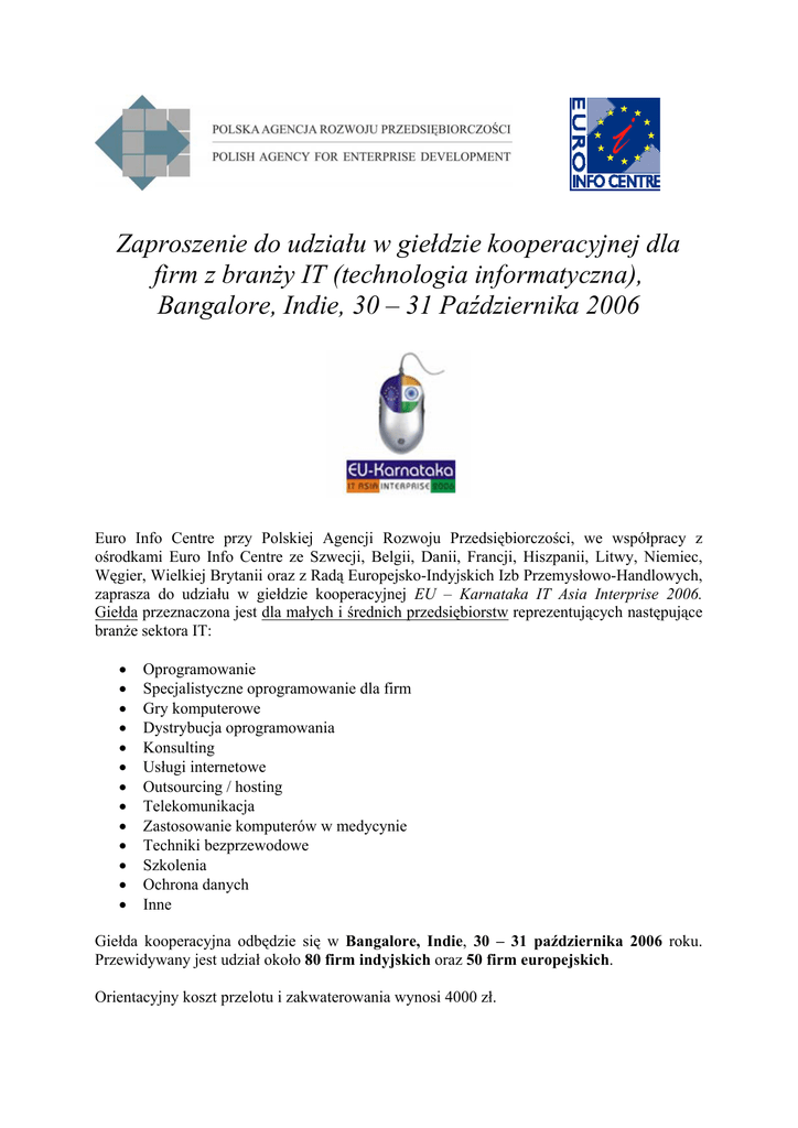 Zaproszenie do udziału w giełdzie kooperacyjnej dla firm z branży IT (technologia informatyczna), Bangalore, Indie, 30 – 31 Października 2006 Euro Info Centre przy Polskiej Agencji Rozwoju Przedsiębiorczości, we współpracy z ośrodkami Euro Info Centre ze Szwecji, Belgii, Danii, Francji, Hiszpanii, Litwy, Niemiec, Węgier, Wielkiej Brytanii oraz z Radą Europejsko-Indyjskich Izb Przemysłowo-Handlowych, zaprasza do udziału w giełdzie kooperacyjnej EU – Karnataka IT Asia Interprise 2006. Giełda przeznaczona jest dla małych i średnich przedsiębiorstw reprezentujących następujące branże sektora IT: • • • • • • • • • • • • • Oprogramowanie Specjalistyczne oprogramowanie dla firm Gry komputerowe Dystrybucja oprogramowania Konsulting Usługi internetowe Outsourcing / hosting Telekomunikacja Zastosowanie komputerów w medycynie Techniki bezprzewodowe Szkolenia Ochrona danych Inne Giełda kooperacyjna odbędzie się w Bangalore, Indie, 30 – 31 października 2006 roku. Przewidywany jest udział około 80 firm indyjskich oraz 50 firm europejskich. Orientacyjny koszt przelotu i zakwaterowania wynosi 4000 zł. Firmom polskim, które zdecydują się na udział w imprezie organizatorzy zapewniają dofinansowanie kosztów przelotu z Polski do Indii w wysokości 250 Euro. Program EU – Karnataka IT Asia – Interprise 2006: • • • • 29 października – program turystyczny 30 października – oficjalne otwarcie giełdy, spotkania biznesowe, lunch, wieczór galowy 31 października – spotkania biznesowe 1 – 3 listopada – możliwość wizyty na targach IT - BangaloreIT.in Fair Uczestnicy giełdy na około miesiąc przed imprezą otrzymają płytę CD z katalogiem innych uczestników EU – Karnataka IT Asia – Interprise 2006 (w języku angielskim). Na podstawie informacji tam zawartych, będą mogli dokonać wyboru firm, z jakimi chcieliby się spotkać. Każde spotkanie z wybraną firmą będzie trwało około 25 minut. Językiem oficjalnym giełdy będzie język angielski. Organizatorzy zapewniają obsługę tłumaczy (wyłącznie na j. angielski) w trakcie rozmów biznesowych. Poprzednie edycje giełd kooperacyjnych pokazały, iż imprezy tego typu są bardzo owocne jeżeli chodzi o nawiązywanie nowych kontaktów biznesowych. Według statystyk, ok. 30 % rozmów odbywających się podczas giełd kooperacyjnych kończy się podpisaniem kontraktu pomiędzy uczestnikami. Wszystkich zainteresowanych uczestnictwem w EU – Karnataka IT Asia – Interprise 2006 uprzejmie prosimy o pobranie formularza zgłoszeniowego ze strony www.euroinfo.org.pl i przesłanie go mailem na adres [email protected]. Po otrzymaniu Państwa zgłoszenia skontaktujemy się w celu ustalenia szczegółów dotyczących udziału firmy w Giełdzie. Termin nadsyłania zgłoszeń upływa 30 czerwca 2006. Liczba miejsc ograniczona. Decyduje kolejność zgłoszeń. EU – Karnataka IT Asia – Interprise 2006 współfinansowana jest przez komisję Europejską ze środków programu Asia – Invest. Dodatkowych informacji udziela Tomasz Piętka pod numerem tel. 22 4328705, e-mail: [email protected] Niniejsza ulotka ma charakter informacyjny; zawarta w niej oferta nie jest ofertą w sensie prawnym.