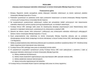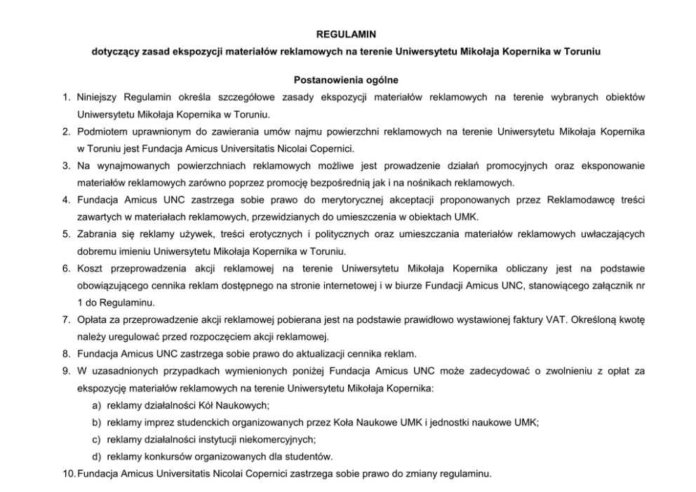 REGULAMIN dotyczący zasad ekspozycji materiałów reklamowych na terenie Uniwersytetu Mikołaja Kopernika w Toruniu Postanowienia ogólne 1. Niniejszy Regulamin określa szczegółowe zasady ekspozycji materiałów reklamowych na terenie wybranych obiektów Uniwersytetu Mikołaja Kopernika w Toruniu. 2. Podmiotem uprawnionym do zawierania umów najmu powierzchni reklamowych na terenie Uniwersytetu Mikołaja Kopernika w Toruniu jest Fundacja Amicus Universitatis Nicolai Copernici. 3. Na wynajmowanych powierzchniach reklamowych możliwe jest prowadzenie działań promocyjnych oraz eksponowanie materiałów reklamowych zarówno poprzez promocję bezpośrednią jak i na nośnikach reklamowych. 4. Fundacja Amicus UNC zastrzega sobie prawo do merytorycznej akceptacji proponowanych przez Reklamodawcę treści zawartych w materiałach reklamowych, przewidzianych do umieszczenia w obiektach UMK. 5. Zabrania się reklamy używek, treści erotycznych i politycznych oraz umieszczania materiałów reklamowych uwłaczających dobremu imieniu Uniwersytetu Mikołaja Kopernika w Toruniu. 6. Koszt przeprowadzenia akcji reklamowej na terenie Uniwersytetu Mikołaja Kopernika obliczany jest na podstawie obowiązującego cennika reklam dostępnego na stronie internetowej i w biurze Fundacji Amicus UNC, stanowiącego załącznik nr 1 do Regulaminu. 7. Opłata za przeprowadzenie akcji reklamowej pobierana jest na podstawie prawidłowo wystawionej faktury VAT. Określoną kwotę należy uregulować przed rozpoczęciem akcji reklamowej. 8. Fundacja Amicus UNC zastrzega sobie prawo do aktualizacji cennika reklam. 9. W uzasadnionych przypadkach wymienionych poniżej Fundacja Amicus UNC może zadecydować o zwolnieniu z opłat za ekspozycję materiałów reklamowych na terenie Uniwersytetu Mikołaja Kopernika: a) reklamy działalności Kół Naukowych; b) reklamy imprez studenckich organizowanych przez Koła Naukowe UMK i jednostki naukowe UMK; c) reklamy działalności instytucji niekomercyjnych; d) reklamy konkursów organizowanych dla studentów. 10. Fundacja Amicus Universitatis Nicolai Copernici zastrzega sobie prawo do zmiany regulaminu. Reklama tradycyjna 11. Na każdym wydziale zostały wydzielone tablice do wewnętrznego użytku studentów. Za umieszczanie na nich ogłoszeń studenckich opłaty nie są pobierane. Na tablicach studenckich zabrania się umieszczania ogłoszeń dotyczących komercyjnych treści reklamowych podmiotów gospodarczych. 12. Materiały reklamowe, które pojawią się na terenie UMK bez wcześniejszych ustaleń z Fundacją będą usuwane, a Fundacja Amicus UNC będzie wystawiała faktury zgodne z cennikiem stanowiącym Załącznik nr 1 do Regulaminu z tytułu umieszczenia treści reklamowych na terenie UMK jednocześnie zamykając drogę do dalszej współpracy na tym polu z Fundacją Amicus UNC. 13. Nadzór nad akcją reklamową, w szczególności nad materiałami reklamowymi umieszczonymi na terenie Uniwersytetu Mikołaja Kopernika sprawują serwisanci reklamowi Fundacji Amicus UNC. 14. Do obowiązków serwisantów reklamowych należy codzienny (prócz weekendów i dni świątecznych) nadzór nad tablicami reklamowymi na terenie przydzielonych im obiektów UMK. Reklama multimedialna 15. Spot reklamowy musi być zgodny ze standardami graficznymi i wymogami Fundacji Amicus UNC. Materiały reklamowe dostarcza Reklamodawca. Materiał reklamowy powinien być dostarczony w następujących formatach plików multimedialnych: WMA (Windows Media Video), AVI (Audio Video Interleave), MPEG (Moving Picture Experts Group). Długość spotu reklamowego wynosi 15 sek. Format spotu reklamowego powinien być wykonany w proporcji obrazu: 16:9 lub 16:10. Emisja spotu nie zawiera dźwięku. 16. Reklamodawca ponosi pełną odpowiedzialność za treść publikowanego spotu reklamowego i oświadcza, że posiada wszelkie prawa autorskie oraz prawa do znaków towarowych zawartych w materiale emisyjnym, a także, że treść i forma spotu reklamowego nie naruszają jakichkolwiek praw osób trzecich. 17. Fundacja Amicus UNC może odmówić emisji spotu reklamowego, jeżeli jej zdaniem nie spełnia on wymagań technicznych, jest niezgodny ze specyfikacją z zamówienia, nie odpowiada poziomowi lub charakterowi systemu albo jest sprzeczny z prawem lub zasadami współżycia społecznego. W związku z powyższym, z tytułu odmowy Reklamodawcy nie przysługują prawa do żadnych roszczeń odszkodowawczych względem Fundacji Amicus UNC. W tej sytuacji Fundacja Amicus UNC może wyznaczyć Reklamodawcy nowy termin dostarczenia spotu reklamowego wolnego od powyższych wad. 18. Reklamodawca ponosi wyłączną odpowiedzialność za naruszenie praw osób trzecich, w szczególności praw własności intelektualnej, w tym do nazw handlowych, wzorów, znaków towarowych związanych z opublikowaniem spotu reklamowego. Załącznik nr 1. Cennik reklam na terenie Uniwersytetu Mikołaja Kopernika w Toruniu 1. Cennik ekspozycji plakatów w wybranych obiektach UMK 2. Cennik ekspozycji plakatów na słupach reklamowych na terenie campusu UMK 3. Cennik ekspozycji i kolportażu ulotek na terenie UMK 4. Koszt stoiska promocyjnego na terenie poszczególnych obiektów UMK 5. Pozostałe formy reklamy 6. Promocje 7. Reklama multimedialna Cennik obowiązujący od 01.01.2012 r. 1. Cennik ekspozycji plakatów na tablicach / w gablotach, ceny netto w PLN za 1 plakat Miejsce Format liczba studentów liczba tablic / gablot Tablica A2 / B2 Cena za 4, 3, 2 i 1 tydz. Tablica A3 / A4 / B3 / B4 Cena za 4, 3, 2 i 1 tydz. Gablota A2 / B2 Cena za 4, 3, 2 i 1 tydz. Gablota A3 / A4 / B3 / B4 Cena za 4, 3, 2 i 1 tydz. Biblioteka Główna 29000 3G _______________ ______________ 120, 90, 65, 35 100, 70, 50, 30 Collegium Humanisticum 1400 2G _______________ ______________ 100, 75, 55, 30 85, 60, 45, 25 Studium Praktycznej Nauki Języków Obcych 15000 1T, 1G 85, 60, 45, 25 70, 45, 35, 15 100, 75, 55, 30 85, 60, 45, 25 Studium Wychowania Fizycznego i Sportu 