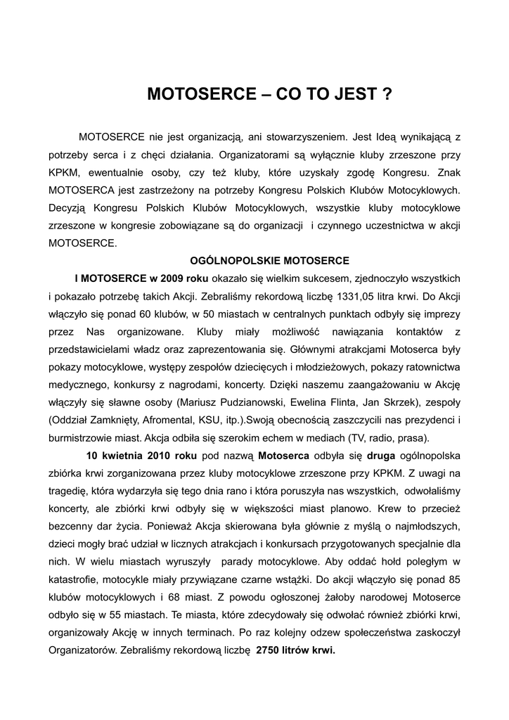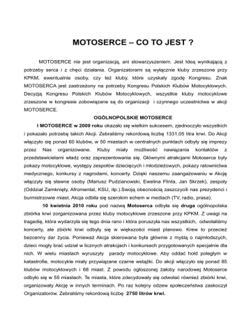 MOTOSERCE – CO TO JEST ? MOTOSERCE nie jest organizacją, ani stowarzyszeniem. Jest Ideą wynikającą z potrzeby serca i z chęci działania. Organizatorami są wyłącznie kluby zrzeszone przy KPKM, ewentualnie osoby, czy też kluby, które uzyskały zgodę Kongresu. Znak MOTOSERCA jest zastrzeżony na potrzeby Kongresu Polskich Klubów Motocyklowych. Decyzją Kongresu Polskich Klubów Motocyklowych, wszystkie kluby motocyklowe zrzeszone w kongresie zobowiązane są do organizacji i czynnego uczestnictwa w akcji MOTOSERCE. OGÓLNOPOLSKIE MOTOSERCE I MOTOSERCE w 2009 roku okazało się wielkim sukcesem, zjednoczyło wszystkich i pokazało potrzebę takich Akcji. Zebraliśmy rekordową liczbę 1331,05 litra krwi. Do Akcji włączyło się ponad 60 klubów, w 50 miastach w centralnych punktach odbyły się imprezy przez Nas organizowane. Kluby miały możliwość nawiązania kontaktów z przedstawicielami władz oraz zaprezentowania się. Głównymi atrakcjami Motoserca były pokazy motocyklowe, występy zespołów dziecięcych i młodzieżowych, pokazy ratownictwa medycznego, konkursy z nagrodami, koncerty. Dzięki naszemu zaangażowaniu w Akcję włączyły się sławne osoby (Mariusz Pudzianowski, Ewelina Flinta, Jan Skrzek), zespoły (Oddział Zamknięty, Afromental, KSU, itp.).Swoją obecnością zaszczycili nas prezydenci i burmistrzowie miast. Akcja odbiła się szerokim echem w mediach (TV, radio, prasa). 10 kwietnia 2010 roku pod nazwą Motoserca odbyła się druga ogólnopolska zbiórka krwi zorganizowana przez kluby motocyklowe zrzeszone przy KPKM. Z uwagi na tragedię, która wydarzyła się tego dnia rano i która poruszyła nas wszystkich, odwołaliśmy koncerty, ale zbiórki krwi odbyły się w większości miast planowo. Krew to przecież bezcenny dar życia. Ponieważ Akcja skierowana była głównie z myślą o najmłodszych, dzieci mogły brać udział w licznych atrakcjach i konkursach przygotowanych specjalnie dla nich. W wielu miastach wyruszyły parady motocyklowe. Aby oddać hołd poległym w katastrofie, motocykle miały przywiązane czarne wstążki. Do akcji włączyło się ponad 85 klubów motocyklowych i 68 miast. Z powodu ogłoszonej żałoby narodowej Motoserce odbyło się w 55 miastach. Te miasta, które zdecydowały się odwołać również zbiórki krwi, organizowały Akcję w innych terminach. Po raz kolejny odzew społeczeństwa zaskoczył Organizatorów. Zebraliśmy rekordową liczbę 2750 litrów krwi. 16 kwietnia 2011 roku odbyła się trzecia edycja Akcji Motoserca. Po raz pierwszy akcja odbyła się też po za granicami naszego kraju. Klub ŻUBR FG przy pomocy polskiego konsulatu zorganizował MOTOSERCE w Brukseli. W Polsce Akcja odbyła się w 70 miastach, a nad jej organizacją pracowało ponad 80 klubów zrzeszonych przy KPKM. Jej efekt to 3368 litrów krwi. 21 kwietnia 2012 roku – to już czwarta edycja naszej Akcji. Ponad 90 klubów motocyklowych pracowało w 84 miastach nad sukcesem Motoserca. Efekt naszej Akcji to – 4301 litrów krwi. 20 kwietnia 2013 roku – V jubileuszowa akcja – 3110 litrów krwi. 18 kwietnia 2014 roku – 3423 litrów krwi Ogólnopolskie podsumowanie Akcji Motoserce: 1331(2009) + 2750(2010) + 3368(2011)+ 4301(2012) + 3110(2013) + 3423(2014) = 18283 tyle litrów krwi udało nam się zebrać w ciągu sześciu edycji MOTOSERCA. MOTOSERCE CIECHANÓW O naszym przedsięwzięciu można było przeczytać w prasie, portalach internetowych, a także zobaczyć krótką relację w telewizji TVP Info. W trakcie imprezy zebraliśmy 23 litry krwi, a do ogólnopolskiej bazy dawców komórek macierzystych DKMS dołączyło 43 potencjalnych dawców szpiku kostnego. Fundacja DKMS objęła imprezę swoim patronatem, kierując do rekrutacji swoich wolontariuszy. W trakcie imprezy zbierana była również karma dla bezdomnych zwierząt, którą przekazaliśmy dla Schroniska dla Bezdomnych Zwierząt w Pawłowie. Promowaliśmy adopcję bezdomnych zwierząt i opowiadaliśmy o działalności Schroniska. W imprezie wzięli udział ciechanowscy Harcerze, którzy przeprowadzali szkolenia pierwszej pomocy przedmedycznej. Impreza obfitowała w atrakcje dla najmłodszych. Dzięki uprzejmości i pomocy sponsorów można było nieodpłatnie skorzystać z placu zabaw, mobilnego orlika i strzelnicy paintball. Wolontariusze organizowali atrakcje takie jak malowanie twarzy czy wspólne rysowanie. Dla dzieci organizowane były również konkursy z nagrodami. Atrakcje, z których mogły skorzystać osoby biorące udział w imprezie to również: –symulator dachowania, –symulator „niezapiętych pasów bezpieczeństwa” - uświadamiający jak istotnym faktem jest bezpieczne podróżowanie samochodem, –„alkogogle” - okulary, po włożeniu których uczestnik mógł przekonać się jak niebezpieczne jest wsiadanie za kierownicę pod wpływem alkoholu. Niewątpliwie atrakcją były również pokazy stuntu motocyklowego w wykonaniu Krystiana „Kocura” Jóźwiaka. Akcja Motoserce Ciechanów miała głównie na celu zbiórkę krwi, rejestrację dawców komórek macierzystych do bazy DKMS Polska, zbiórkę karmy dla zwierząt ale również wspólną zabawę. W trakcie imprezy wystąpiły zespoły dziecięce i młodzieżowe z PCKiS w Ciechanowie, a także zespoły: „Jutro wieczorem”, „Jane Doe”, „Suczysty”, „Ice Krym” i „Night Mistress”. Akcja spotkała się z bardzo dobrym przyjęciem wśród ciechanowian i myślimy, że kontynuowanie tej cyklicznej imprezy w Ciechanowie jest dobrym pomysłem. O akcji Motoserce W realizację imprezy wkładamy własne siły i środki, lecz ze względu na spodziewaną dużą liczbę uczestników gorąco liczymy na wsparcie, wierząc, że dla współorganizatorów i sponsorów będzie to wspaniała promocja i reklama. W zamian możemy zaoferować: - certyfikat z podziękowaniem, - wpis na naszą stronę internetową, - podziękowanie wygłoszone w trakcie imprezy, - możliwość wykorzystania 