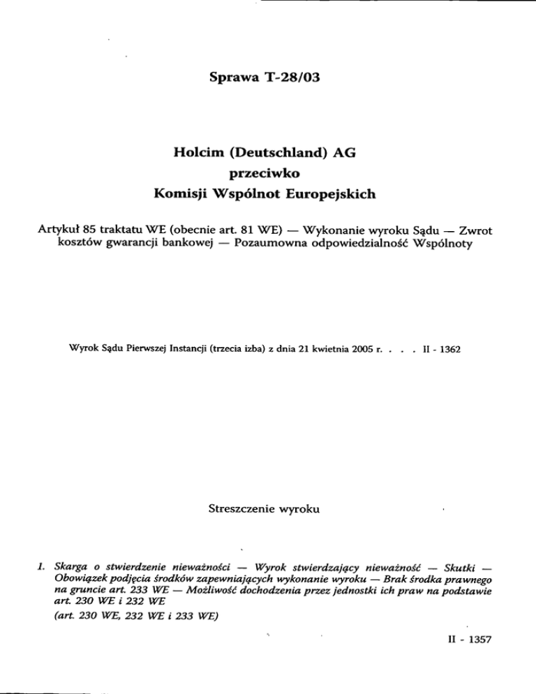 Sprawa T-28/03 Holcim (Deutschland) AG przeciwko Komisji Wspólnot Europejskich Artykuł 85 traktatu WE (obecnie art. 81 WE) — Wykonanie wyroku Sądu — Zwrot kosztów gwarancji bankowej — Pozaumowna odpowiedzialność Wspólnoty Wyrok Sądu Pierwszej Instancji (trzecia izba) z dnia 21 kwietnia 2005 r. . . . II - 1362 Streszczenie wyroku 1. Skarga o stwierdzenie nieważności — Wyrok stwierdzający nieważność — Skutki — Obowiązek podjęcia środków zapewniających wykonanie wyroku — Brak środka prawnego na gruncie art 233 WE — Możliwość dochodzenia przez jednostki ich praw na podstawie art. 230 WE i 232 WE (art. 230 WE, 232 WE i 233 WE) II - 1357 STRESZCZENIE — SPRAWA T-28/03 2. Postępowanie — Skarga wszczynająca postępowanie — Wymagania formalne Określenie przedmiotu sporu — Zwięzłe przedstawienie powołanych zarzutów (regulamin Sądu, art. 44 § 1 lit. c)) — 3. Skarga o odszkodowanie — Termin przedawnienia — Rozpoczęcie biegu terminu — Skarżący, który oceniał w chwili wniesienia skargi, że nie dysponował wszystkimi dowodami, które umożliwiłyby wykazanie odpowiedzialności Wspólnoty — Brak wpływu (art. 288 akapit drugi WE) 4. Skarga o odszkodowanie — Termin przedawnienia — Rozpoczęcie biegu terminu — Data, którą należy wziąć pod uwagę (art. 230 WE, 232 akapit drugi WE i art. 288 akapit drugi WE; statut Trybunału Sprawiedliwości, art. 46) 5. Odpowiedzialność pozaumowna — Przesłanki — Wystarczająco istotne naruszenie prawa wspólnotowego — Uwzględnienie granic swobodnego uznania przysługującego instytucji będącej autorem aktu (art. 288 akapit drugi WE) 6. Skarga o stwierdzenie nieważności — Decyzja Komisji wydana na podstawie art. 85 ust. 1 traktatu — Złożona ocena ekonomiczna — Kontrola sądowa — Granice (traktat WE, art. 85 ust. 1 (obecnie art. 81 ust. 1 WE) i art. 173 (obecnie, po zmianie, art. 230 WE)) 7. Odpowiedzialność pozaumowna — Przesłanki — Bezprawność — Szkoda — Związek przyczynowy — Pojęcie — Koszty gwarancji bankowej wynikającej z decyzji przedsiębior stwa, by nie płacić grzywny nałożonej przez Komisję — Brak bezpośredniego związku przyczynowego (traktat WE, art. 185 i 192 akapit pierwszy (obecnie art 242 WE i 256 akapit pierwszy WE); art. 288 akapit drugi WE) 1. Traktat w sposób enumeratywny wymie nia rodzaje skarg dostępnych podmio tom celem dochodzenia ich praw. Z uwagi na to, że art. 233 WE nie przewiduje odrębnego środka zaskarże nia, sam w sobie nie może stanowić podstawy żądania zwrotu kosztów usta nowienia gwarancji bankowej poniesio nych przez spółkę w następstwie nało żenia przez Komisję grzywny na mocy II - 1358 decyzji dotyczącej postępowania na pod stawie art. 85 traktatu (obecnie art. 81 WE), której nieważność została stwierdzona przez Sąd. Nie oznacza to jednak, by dany podmiot nie miał możliwości zwrócenia się do HOLCIM (DEUTSCHLAND) PRZECIWKO KOMISJI Sądu w sytuacji, w której nie doszło jego zdaniem do podjęcia środków zapewnia jących wykonanie wyroku. Obowiązek wynikający z art. 233 WE może zostać wyegzekwowany, w szczególności w drodze sądowej w postępowaniu na podstawie art. 230 WE i 232 WE. zwięźle, lecz w sposób spójny i zrozu miały, w samym tekście skargi. (por. pkt 43, 44) W tej sytuacji sądy wspólnotowe nie są powołane do zastępowania wspólnoto wych organów stanowiących prawo i zmieniania systemu środków zaskarże nia i procedur ustanowionych traktatem. 3. Termin przedawnienia roszczeń z tytułu odpowiedzialności pozaumownej Wspólnoty nie rozpoczyna swojego biegu do czasu kumulatywnego spełnie nia wszystkich przesłanek powstania obowiązku naprawienia szkody. (por. pkt 31-34) 2. Zgodnie z art 21 statutu Trybunału Sprawiedliwości oraz art. 44 § 1 lit. c) regulaminu Sądu każda skarga powinna zawierać oznaczenie przedmiotu sporu oraz zwięzłe przedstawienie zarzutów. Oznaczenie to powinno być wystarcza jąco jasne i precyzyjne, by strona pozwana mogła przygotować się do obrony oraz by Sąd mógł orzec w przedmiocie skargi, w stosownych przypadkach, bez konieczności pozyski wania dodatkowych informacji. Celem zapewnienia przestrzegania zasady pew ności prawa oraz zasady właściwego sprawowania wymiaru sprawiedliwości, dla dopuszczalności skargi konieczne jest, by istotne elementy stanu faktycz nego i prawnego, na których się ona opiera, przedstawione były chociażby Wobec tego okoliczność, iż w opinii skarżącego nie dysponował on jeszcze wszystkimi dowodami, przy pomocy których mógłby w dostateczny sposób wykazać odpowiedzialność Wspólnoty w ramach postępowania sądowego, nie powoduje wstrzymania biegu przedaw nienia. W przeciwnym razie doszłoby do pomieszania proceduralnego kryterium dotyczącego rozpoczęcia okresu przed awnienia i ustalenia, że spełnione zostały warunki odpowiedzialności, które może być ostatecznie dokonane jedynie przez sąd, przed którym toczy się postępowa nie co do istoty sprawy. (por. pkt 59, 64) II - 1359 STRESZCZENIE — SPRAWA T-28/03 4. Jeżeli szkoda nie została wyrządzona jednorazowo, lecz ma charakter ciągły, przedawnienie, o którym mowa w art. 46 statutu Trybunału Sprawiedliwości, sto suje się, biorąc za punkt odniesienia dzień, w którym wystąpiło zdarzenie przerywające jego bieg, do okresu sprzed ponad pięciu lat poprzedzających ten dzień, bez uszczerbku dla praw, które powstały w czasie późniejszym. między innymi złożoność sytuacji, które podlegają uregulowaniu, trudności w stosowaniu czy wykładni określonych aktów, a w szczególności zakres swo bodnego uznania przysługującego pod miotowi, który wydał zaskarżony akt. Rozstrzygającym kryterium pozwalają cym uznać, że nastąpiło wystarczająco istotne naruszenie, jest oczywiste i poważne wykroczenie przez daną instytucję Wspólnoty poza przysługujący jej zakres swobodnej oceny. W sy