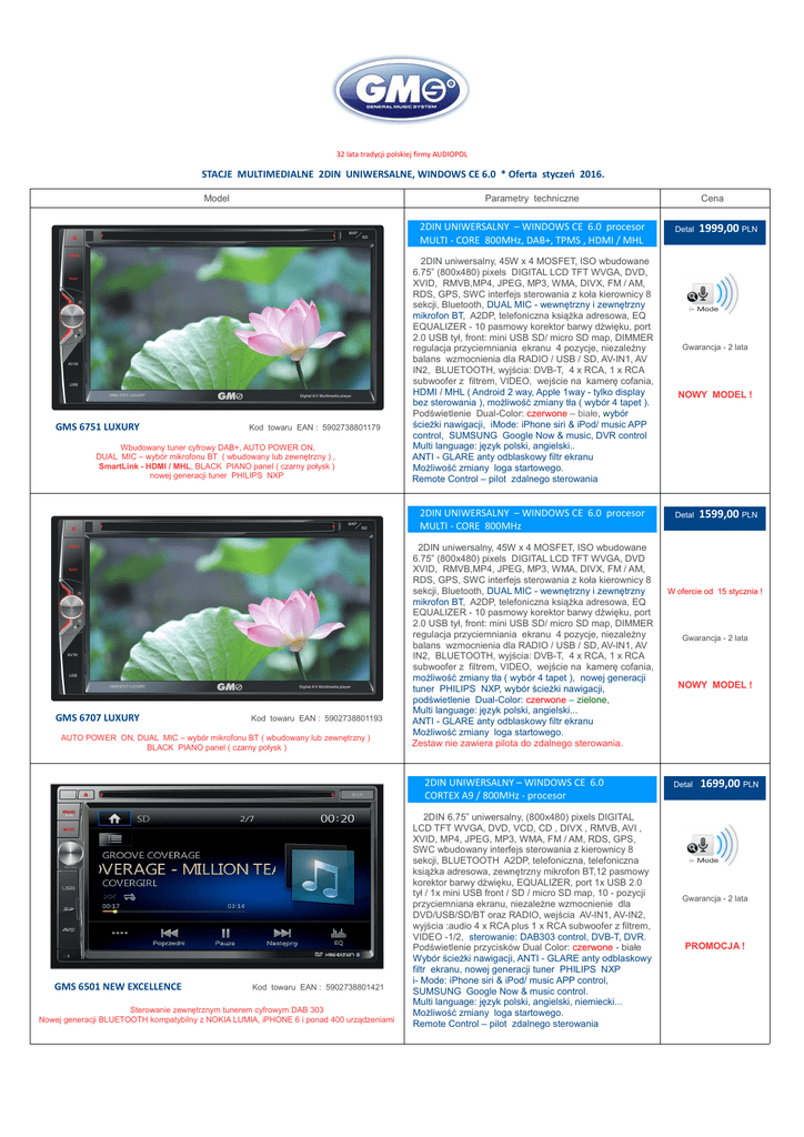 32 lata tradycji polskiej firmy AUDIOPOL STACJE MULTIMEDIALNE 2DIN UNIWERSALNE, WINDOWS CE 6.0 * Oferta styczeń 2016. Model Parametry techniczne 2DIN UNIWERSALNY – WINDOWS CE 6.0 procesor MULTI - CORE 800MHz, DAB+, TPMS , HDMI / MHL GMS 6751 LUXURY Kod towaru EAN : 5902738801179 Wbudowany tuner cyfrowy DAB+, AUTO POWER ON, DUAL MIC – wybór mikrofonu BT ( wbudowany lub zewnętrzny ) , SmartLink - HDMI / MHL, BLACK PIANO panel ( czarny połysk ) nowej generacji tuner PHILIPS NXP 2DIN uniwersalny, 45W x 4 MOSFET, ISO wbudowane 6.75” (800x480) pixels DIGITAL LCD TFT WVGA, DVD, XVID, RMVB,MP4, JPEG, MP3, WMA, DIVX, FM / AM, RDS, GPS, SWC interfejs sterowania z koła kierownicy 8 sekcji, Bluetooth, DUAL MIC - wewnętrzny i zewnętrzny mikrofon BT, A2DP, telefoniczna książka adresowa, EQ EQUALIZER - 10 pasmowy korektor barwy dźwięku, port 2.0 USB tył, front: mini USB SD/ micro SD map, DIMMER regulacja przyciemniania ekranu 4 pozycje, niezależny balans wzmocnienia dla RADIO / USB / SD, AV-IN1, AV IN2, BLUETOOTH, wyjścia: DVB-T, 4 x RCA, 1 x RCA subwoofer z filtrem, VIDEO, wejście na kamerę cofania, HDMI / MHL ( Android 2 way, Apple 1way - tylko display bez sterowania ), możliwość zmiany tła ( wybór 4 tapet ). Podświetlenie Dual-Color: czerwone – białe, wybór ścieżki nawigacji, iMode: iPhone siri & iPod/ music APP control, SUMSUNG Google Now & music, DVR control Multi language: język polski, angielski.. ANTI - GLARE anty odblaskowy filtr ekranu Możliwość zmiany loga startowego. Remote Control – pilot zdalnego sterowania 2DIN UNIWERSALNY – WINDOWS CE 6.0 procesor MULTI - CORE 800MHz GMS 6707 LUXURY Kod towaru EAN : 5902738801193 AUTO POWER ON, DUAL MIC – wybór mikrofonu BT ( wbudowany lub zewnętrzny ) BLACK PIANO panel ( czarny połysk ) 2DIN uniwersalny, 45W x 4 MOSFET, ISO wbudowane 6.75” (800x480) pixels DIGITAL LCD TFT WVGA, DVD XVID, RMVB,MP4, JPEG, MP3, WMA, DIVX, FM / AM, RDS, GPS, SWC interfejs sterowania z koła kierownicy 8 sekcji, Bluetooth, DUAL MIC - wewnętrzny i zewnętrzny mikrofon BT, A2DP, telefoniczna książka adresowa, EQ EQUALIZER - 10 pasmowy korektor barwy dźwięku, port 2.0 USB tył, front: mini USB SD/ micro SD map, DIMMER regulacja przyciemniania ekranu 4 pozycje, niezależny balans wzmocnienia dla RADIO / USB / SD, AV-IN1, AV IN2, BLUETOOTH, wyjścia: DVB-T, 4 x RCA, 1 x RCA subwoofer z filtrem, VIDEO, wejście na kamerę cofania, możliwość zmiany tła ( wybór 4 tapet ), nowej generacji tuner PHILIPS NXP, wybór ścieżki nawigacji, podświetlenie Dual-Color: czerwone – zielone, Multi language: język polski, angielski... ANTI - GLARE anty odblaskowy filtr ekranu Możliwość zmiany loga startowego. Zestaw nie zawiera pilota do zdalnego sterowania. 2DIN UNIWERSALNY – WINDOWS CE 6.0 CORTEX A9 / 800MHz - procesor GMS 6501 NEW EXCELLENCE Kod towaru EAN : 5902738801421 Sterowanie zewnętrznym tunerem cyfrowym DAB 303 Nowej generacji BLUETOOTH kompatybilny z NOKIA LUMIA, iPHONE 6 i ponad 400 urządzeniami 2DIN 6.75” uniwersalny, (800x480) pixels DIGITAL LCD TFT WVGA, DVD, VCD, CD , DIVX , RMVB, AVI , XVID, MP4, JPEG, MP3, WMA, FM / AM, RDS, GPS, SWC wbudowany interfejs sterowania z kierownicy 8 sekcji, BLUETOOTH A2DP, telefoniczna, telefoniczna książka adresowa, zewnętrzny mikrofon BT,12 pasmowy korektor barwy dźwięku, EQUALIZER, port 1x USB 2.0 tył / 1x mini USB front / SD / micro SD map, 10 - pozycji przyciemniana ekranu, niezależne wzmocnienie dla DVD/USB/SD/BT oraz RADIO, wejścia AV-IN1, AV-IN2, wyjścia :audio 4 x RCA plus 1 x RCA subwoofer z filtrem, VIDEO -1/2, sterowanie: DAB303 control, DVB-T, DVR. Podświetlenie przycisków Dual Color: czerwone - białe Wybór ścieżki nawigacji, ANTI - GLARE anty odblaskowy filtr ekranu, nowej generacji tuner PHILIPS NXP i- Mode: iPhone siri & iPod/ music APP control, SUMSUNG Google Now & music control. Multi language: język polski, angielski, niemiecki... Możliwość zmiany loga startowego. Remote Control – pilot zdalnego sterowania Cena Detal 1999,00 PLN Gwarancja - 2 lata NOWY MODEL ! Detal 1599,00 PLN W ofercie od 15 stycznia ! Gwarancja - 2 lata NOWY MODEL ! Detal 1699,00 PLN Gwarancja - 2 lata PROMOCJA ! 2DIN UNIWERSALNY – WINDOWS CE 6.0 CORTEX A9 / 800MHz - procesor GMS 6401 NEW EXCELLENCE Kod towaru EAN: 5902738801407 Sterowanie zewnętrznym tunerem cyfrowym DAB 303 6.2” (800x480) pixels DIGITAL LCD TFT WVGA, DVD VCD, CD , DIVX , RMVB, AVI , XVID, MP4, JPEG, MP3, WMA, FM / AM, RDS, GPS, SWC interfejs sterowania z kierownicy 8 sekcji, BLUETOOTH A2DP, telefoniczna książka adresowa plus zewnętrzny mikrofon,12 pasmowy korektor barwy dźwięku, EQUALIZER, port 1x USB 2.0 tył / 1x mini USB front / SD / micro SD map, 10 - pozycji przyciemniana ekranu, niezależne wzmocnienie dla DVD/USB/SD/BT oraz RADIO, wejścia AV-IN1, AV-IN2, wyjścia :audio 4 x RCA plus 1 x RCA subwoofer z filtrem, VIDEO -1/2, sterowanie : tunerem DAB, DVB-T, DVR. Podświetlenie przycisków Dual Color: czerwone - białe Wybór ścieżki nawigacji, ANTI - GLARE anty odblaskowy filtr ekranu, nowej generacji tuner PHILIPS NXP i- Mode: iPhone siri & iPod/ music APP control, SUMSUNG Google Now & music control Multi language: język polski, angielski, niemiecki, francuski, hiszpański, holenderski, duński, szwedzki. Możliwość zmiany loga startowego. Remote Control – pilot zdalnego sterowania 2DIN UNIWERSALNY – WINDOWS CE 6.0 CORTEX A9 / 800MHz - procesor GMS 6401 SMART 2 Kod towaru EAN : 5902738801322 Sterowanie zewnętrznym tunerem cyfrowym DAB 303 2DIN uniwersalny, 45W x 4 MOSFET, ISO kable 6.2” (800x480) pixels DIGITAL LCD TFT WVGA, DVD VCD, CD , DIVX , RMVB, AVI , XVID, MP4, JPEG, MP3, WMA, FM / AM, RDS, GPS, SWC interfejs sterowania z kierownicy 8 sekcji, BLUETOOTH A2DP, telefoniczna książka adresowa plus zewnętrzny mikrofon,12 pasmowy korektor barwy dźwięku, EQUALIZER, port 1x USB 2.0 tył / 1x mini USB front / SD / micro SD map, 10 - pozycji przyciemniana ekranu, niezal