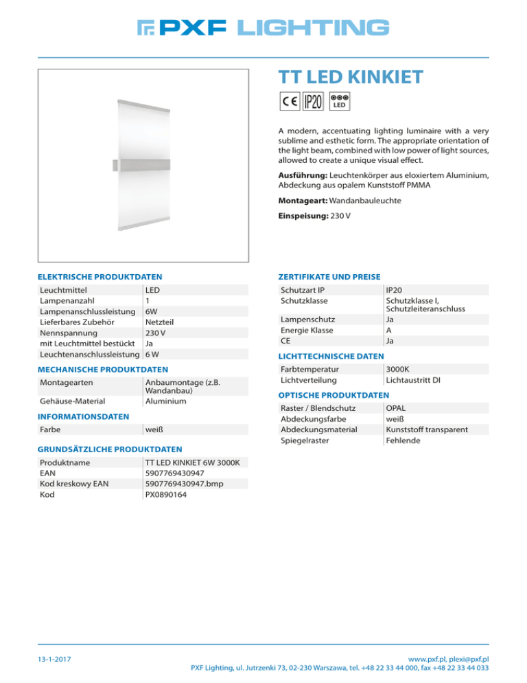 TT LED KINKIET LED A modern, accentuating lighting luminaire with a very sublime and esthetic form. The appropriate orientation of the light beam, combined with low power of light sources, allowed to create a unique visual effect. Ausführung: Leuchtenkörper aus eloxiertem Aluminium, Abdeckung aus opalem Kunststoff PMMA Montageart: Wandanbauleuchte Einspeisung: 230 V ELEKTRISCHE PRODUKTDATEN ZERTIFIKATE UND PREISE Leuchtmittel Lampenanzahl Lampenanschlussleistung Lieferbares Zubehör Nennspannung mit Leuchtmittel bestückt Leuchtenanschlussleistung Schutzart IP Schutzklasse LED 1 6W Netzteil 230 V Ja 6 W Lampenschutz Energie Klasse CE LICHTTECHNISCHE DATEN MECHANISCHE PRODUKTDATEN Montagearten Gehäuse-Material Anbaumontage (z.B. Wandanbau) Aluminium INFORMATIONSDATEN Farbe weiß GRUNDSÄTZLICHE PRODUKTDATEN Produktname EAN Kod kreskowy EAN Kod 13-1-2017 IP20 Schutzklasse I, Schutzleiteranschluss Ja A Ja Farbtemperatur Lichtverteilung 3000K Lichtaustritt DI OPTISCHE PRODUKTDATEN Raster / Blendschutz Abdeckungsfarbe Abdeckungsmaterial Spiegelraster OPAL weiß Kunststoff transparent Fehlende TT LED KINKIET 6W 3000K 5907769430947 5907769430947.bmp PX0890164 www.pxf.pl, [email protected] PXF Lighting, ul. Jutrzenki 73, 02-230 Warszawa, tel. +48 22 33 44 000, fax +48 22 33 44 033 W H ABMESSUNGEN L [mm] W [mm] H [mm] 410 250 45 L = Länge | W = Breite | H = Höhe / Einbautiefe L 13-1-2017 www.pxf.pl, [email protected] PXF Lighting, ul. Jutrzenki 73, 02-230 Warszawa, tel. +48 22 33 44 000, fax +48 22 33 44 033