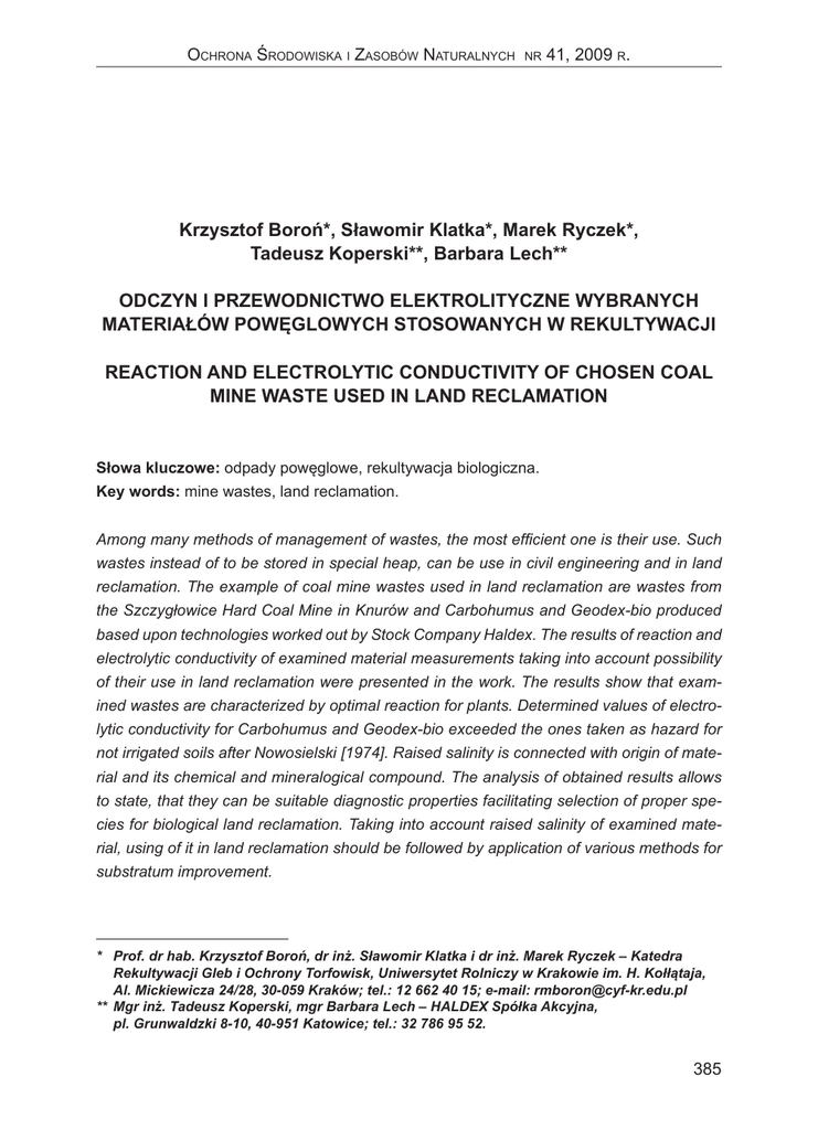 Ochrona Środowiska i Zasobów Naturalnych nr 41, 2009 r. Krzysztof Boroń*, Sławomir Klatka*, Marek Ryczek*, Tadeusz Koperski**, Barbara Lech** ODCZYN I PRZEWODNICTWO ELEKTROLITYCZNE WYBRANYCH MATERIAŁÓW POWĘGLOWYCH STOSOWANYCH W REKULTYWACJI REACTION AND ELECTROLYTIC CONDUCTIVITY OF CHOSEN COAL MINE WASTE USED IN LAND RECLAMATION Słowa kluczowe: odpady powęglowe, rekultywacja biologiczna. Key words: mine wastes, land reclamation. Among many methods of management of wastes, the most efficient one is their use. Such wastes instead of to be stored in special heap, can be use in civil engineering and in land reclamation. The example of coal mine wastes used in land reclamation are wastes from the Szczygłowice Hard Coal Mine in Knurów and Carbohumus and Geodex-bio produced based upon technologies worked out by Stock Company Haldex. The results of reaction and electrolytic conductivity of examined material measurements taking into account possibility of their use in land reclamation were presented in the work. The results show that examined wastes are characterized by optimal reaction for plants. Determined values of electrolytic conductivity for Carbohumus and Geodex-bio exceeded the ones taken as hazard for not irrigated soils after Nowosielski [1974]. Raised salinity is connected with origin of material and its chemical and mineralogical compound. The analysis of obtained results allows to state, that they can be suitable diagnostic properties facilitating selection of proper species for biological land reclamation. Taking into account raised salinity of examined material, using of it in land reclamation should be followed by application of various methods for substratum improvement. * Prof. dr hab. Krzysztof Boroń, dr inż. Sławomir Klatka i dr inż. Marek Ryczek – Katedra Rekultywacji Gleb i Ochrony Torfowisk, Uniwersytet Rolniczy w Krakowie im. H. Kołłątaja, Al. Mickiewicza 24/28, 30-059 Kraków; tel.: 12 662 40 15; e-mail: [email protected] ** Mgr inż. Tadeusz Koperski, mgr Barbara Lech – HALDEX Spółka Akcyjna, pl. Grunwaldzki 8-10, 40-951 Katowice; tel.: 32 786 95 52. 385 Krzysztof Boroń, Sławomir Klatka, Marek Ryczek... 1. Wprowadzenie Koncentracja przemysłu wydobywczego na Górnym Śląsku oraz to, że węgiel kamienny stanowi podstawowe paliwo energetyczne w kraju sprawia, że ilość odpadów wytwarzanych przez sektor wydobywczy będzie nadal głównym i dominującym strumieniem odpadów przemysłowych w tym regionie [Boroń, Klatka 1999, Boroń i in. 2007]. W ustawie o odpadach wydobywczych [Ustawa... 2008] określono zasady wydobywania i składowania odpadów wydobywczych oraz procedury uzyskiwania zezwoleń na prowadzenie takiej działalności. Zgodnie z przywołaną ustawą każdy wytwórca odpadów został zobowiązany do stosowania takich sposobów poszukiwania i wydobywania rud i innych kopalin, które zapobiegną lub zminimalizują ilość powstających odpadów oraz ograniczą ich negatywne oddziaływanie na środowisko i zdrowie oraz życie ludzi. Przedsiębiorcy wydobywający kopaliny przed rozpoczęciem prac muszą mieć opracowany program gospodarowania odpadami wydobywczymi. Materiały odpadowe powstające w wyniku działalności przemysłu wydobywczego oraz powstałe na bazie odpadów powęglowych są coraz częściej wykorzystywane w budownictwie drogowym i hydrotechnicznym oraz w rekultywacji terenów zdegradowanych. Na możliwość stosowania odpadów powęglowych, a zwłaszcza mułów węglowych, w rekultywacji zwraca uwagę Strzyszcz i Łukasik [2008]. Według tych autorów muły te mogą być wykorzystywane do rekultywacji zwałowisk odpadów skalnych i przeróbczych górnictwa węgla kamiennego. Aby możliwe było wykorzystanie materiałów powęglowych w rekultywacji technicznej i biologicznej, konieczna jest wiedza na temat ich oddziaływania na środowisko przyrodnicze. Do tego celu niezbędne jest przede wszystkim rozpoznanie składu chemicznego materiałów, ich właściwości fizycznych i fizykochemicznych oraz parametrów geotechnicznych. Do czynników fitochemicznych, mających wpływ na proces rekultywacji biologicznej z wykorzystaniem materiałów powęglowych zalicza się między innymi: odczyn i zasolenie [Boroń, Klatka 1999]. Przykładowymi materiałami wykorzystywanymi do rekultywacji są odpady powęglowe Kopalni Węgla Kamiennego „Szczygłowice” w Knurowie oraz Carbohumus i Geodex-bio. Dwa ostatnie, wytwarzane za pomocą specyficznych technologii opracowanych przez Spółkę Akcyjną HALDEX, stanowią przykład przekształcania odpadów węglowych w produkty wykorzystywane gospodarczo [Koperski i in. 2008]. Celem pracy była analiza odczynu i przewodnictwa elektrolitycznego właściwego materiałów powęglowych Kopalni „Szczygłowice” oraz Geodexu-bio i Carbohumusu pod kątem ich rekultywacyjnego wykorzystania. 386 Odczyn i przewodnictwo elektrolityczne wybranych materiałów powęglowych... 2. ZAKRES I METODY BADAŃ Badaniami objęto trzy typy materiałów stosowanych w rekultywacji: ● materiały wykorzystywane na terenach rekultywacyjnych Kopalni „Szczygłowice” w Knurowie, wśród których dominują odpady powstające przy poszukiwaniu i wydobywaniu kopalin oraz odpady z flotacyjnego wzbogacania węgla; w ich składzie występują głównie iłowce, w mniejszej ilości mułowce i piaskowce karbońskie [Klatka i in. 2007]; aktualnie odpady przeróbcze i poflotacyjne Kopalni są poddawane odzyskowi oraz wykorzystywane do rekultywacji terenów zdegradowanych eksploatacją górniczą; ● Carbohumus, który stanowią muły popłuczkowe przetworzone w łatwo transportowalny granulat według technologii „Haldex S.A” [Koperski i in. 2008]; ● Geodex-bio, wytwarzany na bazie kruszyw powęglowych z dodatkiem stabilizowanych osadów ściekowych według opatentowanej technologii Haldex S.A. [2008]. Badania terenowe na obszarze Kopalni „Szczygłowice” prowadzono na czterech obszarach zwałowisk pogórnic