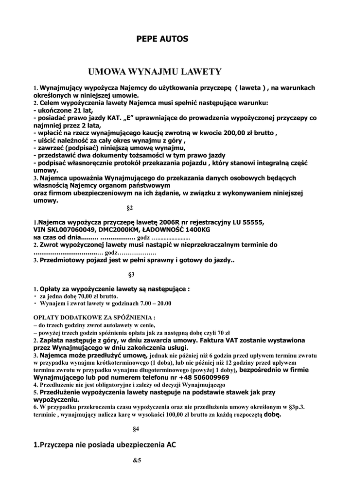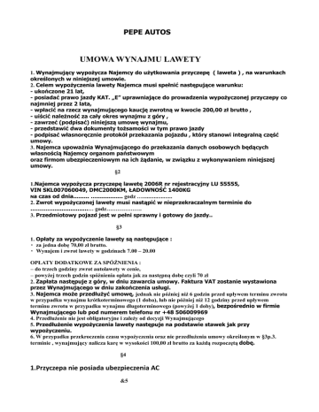 PEPE AUTOS UMOWA WYNAJMU LAWETY 1. Wynajmujący wypożycza Najemcy do użytkowania przyczepę ( laweta ) , na warunkach określonych w niniejszej umowie. 2. Celem wypożyczenia lawety Najemca musi spełnić następujące warunku: - ukończone 21 lat, - posiadać prawo jazdy KAT. „E” uprawniające do prowadzenia wypożyczonej przyczepy co najmniej przez 2 lata, - wpłacić na rzecz wynajmującego kaucję zwrotną w kwocie 200,00 zł brutto , - uiścić należność za cały okres wynajmu z góry , - zawrzeć (podpisać) niniejszą umowę wynajmu, - przedstawić dwa dokumenty tożsamości w tym prawo jazdy - podpisać własnoręcznie protokół przekazania pojazdu , który stanowi integralną część umowy. 3. Najemca upoważnia Wynajmującego do przekazania danych osobowych będących własnością Najemcy organom państwowym oraz firmom ubezpieczeniowym na ich żądanie, w związku z wykonywaniem niniejszej umowy. §2 1.Najemca wypożycza przyczepę lawetę 2006R nr rejestracyjny LU 55555, VIN SKL007060049, DMC2000KM, ŁADOWNOŚĆ 1400KG Na czas od dnia......... …............... godz …..................... 2. Zwrot wypożyczonej lawety musi nastąpić w nieprzekraczalnym terminie do …………....................… godz………………. 3. Przedmiotowy pojazd jest w pełni sprawny i gotowy do jazdy.. §3 1. Opłaty za wypożyczenie lawety są następujące : za jedna dobę 70,00 zł brutto. Wynajem i zwrot lawety w godzinach 7.00 – 20.00 OPŁATY DODATKOWE ZA SPÓŹNIENIA : − do trzech godziny zwrot autolawety w cenie, − powyżej trzech godzin spóźnienia opłata jak za następną dobę czyli 70 zł 2. Zapłata następuje z góry, w dniu zawarcia umowy. Faktura VAT zostanie wystawiona przez Wynajmującego w dniu zakończenia usługi. 3. Najemca może przedłużyć umowę, jednak nie później niż 6 godzin przed upływem terminu zwrotu w przypadku wynajmu krótkoterminowego (1 doba), lub nie później niż 12 godziny przed upływem terminu zwrotu w przypadku wynajmu długoterminowego (powyżej 1 doby), bezpośrednio w firmie Wynajmującego lub pod numerem telefonu nr +48 506009969 4. Przedłużenie nie jest obligatoryjne i zależy od decyzji Wynajmującego 5. Przedłużenie wypożyczenia lawety następuje na podstawie stawek jak przy wypożyczeniu. 6. W przypadku przekroczenia czasu wypożyczenia oraz nie przedłużenia umowy określonym w §3p.3. terminie , wynajmujący nalicza karę w wysokości 100,00 zł brutto za każdą rozpoczętą dobę. §4 1.Przyczepa nie posiada ubezpieczenia AC &5 1. W przypadku nie zwrócenia lawety we wskazanym terminie i nie przedłużenia umowy, Wynajmujący zgłasza na Policję kradzież lawety. 2. Najemca zwraca lawete w terminie określonym umową. Samowolne przedłużenie okresu wypożyczenia powyżej 1 godziny powoduje pobranie dodatkowej opłaty karnej za każdą dodatkową dobę wypożyczenia , określonej w §3p.5,6. §6 1. Najemca wpłaca kaucję w kwocie 200,00 zł jako zabezpieczenie na pokrycie ewentualnych kosztów spowodowanych przez Najemcę. 2. Kaucja podlega całkowitemu lub częściowemu zwrotowi przy zwrocie pojazdu. 3. Utrata kaucji lub jej części jest uzależniona od następujących zdarzeń: - uszkodzenie wypożyczonej lawety (koszty naprawy w autoryzowanym serwisie), - brakujące lub podmienione części (wycena według cen dealera wraz z kosztami robocizny), - w przypadku przekroczenia czasu wypożyczenia oraz nie przedłużenia umowy w określonym terminie. - kradzież lawety w związku z nie wywiązaniem się z obowiązku jej zabezpieczenia zgodnie z zapisem określonym w§7 p. 3 niniejszej umowy (zwrot kwoty lawety 6000zł ) - użycie lawety niezgodne z zapisami określonymi w §7 p1,2, (całkowity przepadek kaucji), 4. W przypadku uszkodzenia lub utraty lawety Najemca jest zobowiązany do natychmiastowego powiadomienia Policji i Wynajmującego o zaistniałym fakcie. 5. Jeżeli uszkodzenie nastąpiło w wyniku kolizji drogowej , Najemca zobowiązany jest do jak najszybszego skontaktowania się z wynajmującym , powiadomienia Policji , uzyskania oświadczenia sprawy , jeśli kolizja nastąpiła z winy osób trzecich i zabezpieczenia lawety. §7 1. Najemca zobowiązuje się do pełnej odpowiedzialności oraz pokrycia ewentualnych szkód wynikłych z prowadzenia pojazdu w stanie nietrzeźwym, lub pod wpływem narkotyków oraz środków farmakologicznych uniemożliwiających prawne prowadzenie pojazdu. 2. Najemca jest zobowiązany do każdorazowego zabezpieczania , oraz do parkowania lawety na parkingu strzeżonym. 3.W razie awarii lawety w okresie najmu, Najemca ma obowiązek powiadomić wynajmującego. Jeżeli usterka może zagrażać bezpieczeństwu w ruchu drogowym, zabrania się kontynuowania jazdy do czasu jej usunięcia. 5.W razie awarii lawety poza terytorium RP, najemca zobowiązany jest usunąć usterkę lub z holować lawety wynajmowany do granic RP na własny koszt. 6. Najemca zobowiązuje się do zwrotu pełnej wartości lawety (wartości określonej w $6 pkt 3 w przypadku kradzieży. 7. Wynajmujący nie ponosi odpowiedzialności za szkody poniesione przez Najemce na skutek awarii lawety. §8 1.Opłaty w związku z zdarzeniem i kary umowne : * brak dowodu rejestracyjnego , polisy ubezpieczeniowej , tablicy rejestracyjnej–400,00 zł * każdy dzień postoju spowodowany uzupełnieniem w/w rzeczy - 50 zł * demontaż części wyposażenia lawety lub dokonanie innych przeróbek czy zmiana bez zgody Wynajmującego – zgodnie z wyceną autoryzowanego serwisu. * brak części wyposażenia lawety nie wymienionych w cenniku opłat wg cennika producenta + marża 15 % • udostępnianie pojazdu osobie nieuprawnionej do kierowania 250,00 zł kara umowna §9 1. W przypadku nie wywiązania się z warunków niniejszej umowy i powstania zobowiązania po stronie Najemcy, Najemca ponosi koszty windykacji roszczenia prowadzonej przez wynajętą przez Wynajmującego Kancelarię. 2. W sprawach nieuregulowanych niniej