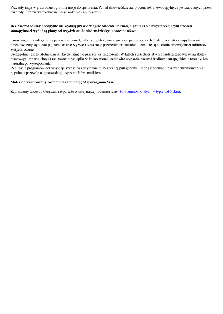Pszczoły mają w przyrodzie ogromną misję do spełnienia. Ponad dziewięćdziesiąt procent roślin owadopylnych jest zapylanych przez pszczoły. Czemu warto chronić nasze rodzime rasy pszczół? Bez pszczół rośliny obcopylne nie wydają prawie w ogóle owoców i nasion, a gatunki o niewystarczającym stopniu samopylności wydadzą plony od trzydziestu do siedemdziesięciu procent niższe. Coraz więcej zawdzięczamy pszczołom: miód, mleczko, pyłek, wosk, pierzga, jad, propolis. Jednakże korzyści z zapylania roślin przez pszczoły są ponad piętnastokrotnie wyższe niż wartość pszczelich produktów i oceniane są na około dziewięciuset milionów złotych rocznie. Szczególnie jest to istotne dzisiaj, kiedy istnienie pszczół jest zagrożone. W latach sześćdziesiątych dwudziestego wieku na skutek masowego importu obcych ras pszczół, nastąpiło w Polsce niemal całkowite wyparcie pszczół środkowoeuropejskich z terenów ich naturalnego występowania. Realizacja programów ochrony daje szanse na utrzymanie tej bezcennej puli genowej. Jedną z populacji pszczół chronionych jest populacja pszczoły augustowskiej - Apis mellifera mellifera. Materiał zrealizowany został przez Fundację Wspomagania Wsi. Zapraszamy także do obejrzenia reportażu o innej naszej rodzimej rasie: koni zimnokrwistych w typie sokólskim. Powered by TCPDF (www.tcpdf.org)