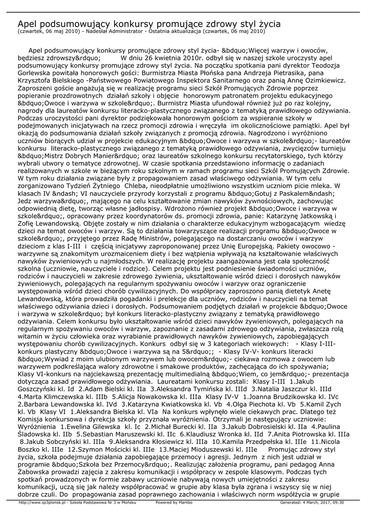 Apel podsumowujący konkursy promujące zdrowy styl życia (czwartek, 06 maj 2010) - Nadesłał Administrator - Ostatnia aktualizacja (czwartek, 06 maj 2010) Apel podsumowujący konkursy promujące zdrowy styl życia- „Więcej warzyw i owoców, będziesz zdrowszy” W dniu 26 kwietnia 2010r. odbył się w naszej szkole uroczysty apel podsumowujący konkursy promujące zdrowy styl życia. Na początku spotkania pani dyrektor Teodozja Gorlewska powitała honorowych gości: Burmistrza Miasta Płońska pana Andrzeja Pietrasika, pana Krzysztofa Bielskiego -Państwowego Powiatowego Inspektora Sanitarnego oraz panią Annę Ozimkiewicz. Zaproszeni goście angażują się w realizację programu sieci Szkół Promujących Zdrowie poprzez popieranie prozdrowotnych działań szkoły i objęcie honorowym patronatem projektu edukacyjnego „Owoce i warzywa w szkole”. Burmistrz Miasta ufundował również już po raz kolejny, nagrody dla laureatów konkursu literacko-plastycznego związanego z tematyką prawidłowego odżywiania. Podczas uroczystości pani dyrektor podziękowała honorowym gościom za wspieranie szkoły w podejmowanych inicjatywach na rzecz promocji zdrowia i wręczyła im okolicznościowe pamiątki. Apel był okazją do podsumowania działań szkoły związanych z promocją zdrowia. Nagrodzono i wyróżniono uczniów biorących udział w projekcie edukacyjnym „Owoce i warzywa w szkole”- laureatów konkursu literacko-plastycznego związanego z tematyką prawidłowego odżywiania, zwycięzców turnieju „Mistrz Dobrych Manier” oraz laureatów szkolnego konkursu recytatorskiego, tych którzy wybrali utwory o tematyce zdrowotnej. W czasie spotkania przedstawiono informację o zadaniach realizowanych w szkole w bieżącym roku szkolnym w ramach programu sieci Szkól Promujących Zdrowie. W tym roku działania związane były z propagowaniem zasad właściwego odżywiania. W tym celu zorganizowano Tydzień Żytniego Chleba, nieodpłatnie umożliwiono wszystkim uczniom picie mleka. W klasach IV – VI nauczyciele przyrody korzystali z programu „Gotuj z Paskalem– Jedz warzywa”, mającego na celu kształtowanie zmian nawyków żywnościowych, zachowując odpowiednią dietę, tworząc własne jadłospisy. Wdrożono również projekt „Owoce i warzywa w szkole”, opracowany przez koordynatorów ds. promocji zdrowia, panie: Katarzynę Jatkowską i Zofię Lewandowską. Objęte zostały w nim działania o charakterze edukacyjnym wzbogacającym wiedzę dzieci na temat owoców i warzyw. Są to działania towarzyszące realizacji programu „Owoce w szkole”, przyjętego przez Radę Ministrów, polegającego na dostarczaniu owoców i warzyw dzieciom z klas I-III i częścią inicjatywy zaproponowanej przez Unię Europejską. Pakiety owocowo warzywne są znakomitym urozmaiceniem diety i bez wątpienia wpływają na kształtowanie właściwych nawyków żywieniowych u najmłodszych. W realizację projektu zaangażowana jest cała społeczność szkolna (uczniowie, nauczyciele i rodzice). Celem projektu jest podniesienie świadomości uczniów, rodziców i nauczycieli w zakresie zdrowego żywienia, ukształtowanie wśród dzieci i dorosłych nawyków żywieniowych, polegających na regularnym spożywaniu owoców i warzyw oraz ograniczenie występowania wśród dzieci chorób cywilizacyjnych. Do współpracy zaproszono panią dietetyk Anetę Lewandowską, która prowadziła pogadanki i prelekcje dla uczniów, rodziców i nauczycieli na temat właściwego odżywiania dzieci i dorosłych. Podsumowaniem podjętych działań w projekcie „Owoce i warzywa w szkole” był konkurs literacko-plastyczny związany z tematyką prawidłowego odżywiania. Celem konkursu było ukształtowanie wśród dzieci nawyków żywieniowych, polegających na regularnym spożywaniu owoców i warzyw, zapoznanie z zasadami zdrowego odżywiania, zwłaszcza rolą witamin w życiu człowieka oraz wyrabianie prawidłowych nawyków żywieniowych, zapobiegających występowaniu chorób cywilizacyjnych. Konkurs odbył się w 3 kategoriach wiekowych: - Klasy I-IIIkonkurs plastyczny „Owoce i warzywa są na 5”; - Klasy IV-V- konkurs literacki „Wywiad z moim ulubionym warzywem lub owocem”- ciekawa rozmowa z owocem lub warzywem podkreślająca walory zdrowotne i smakowe produktów, zachęcająca do ich spożywania; Klasy VI-konkurs na najciekawszą prezentację multimedialną „Wiem, co jem”- prezentacja dotycząca zasad prawidłowego odżywiania. Laureatami konkursu zostali: Klasy I-III 1.Jakub Goszczyński kl. Id 2.Adam Bielski kl. IIa 3.Aleksandra Tymińska kl. IIId 3.Natalia Jaszczur kl. IIId 4.Marta Klimczewska kl. IIIb 5.Alicja Nowakowska kl. IIIa Klasy IV-V 1.Joanna Brudzikowska kl. IVc 2.Barbara Lewandowska kl. IVd 3.Katarzyna Kwiatkowska kl. Vb 4.Olga Piechota kl. Vb 5.Kamil Zych kl. Vb Klasy VI 1.Aleksandra Bielska kl. VIa Na konkurs wpłynęło wiele ciekawych prac. Dlatego też Komisja konkursowa i dyrekcja szkoły przyznała wyróżnienia. Otrzymali je następujący uczniowie: Wyróżnienia 1.Ewelina Gilewska kl. Ic 2.Michał Burecki kl. IIa 3.Jakub Dobrosielski kl. IIa 4.Paulina Śladowska kl. IIb 5.Sebastian Maruszewski kl. IIc 6.Klaudiusz Wronka kl. IId 7.Anita Piotrowska kl. IIIa 8.Jakub Sobczyński kl. IIIa 9.Aleksandra Kłosiewicz kl. IIIa 10.Kamila Przedpełska kl. IIIe 11.Nicola Boszko kl. IIIe 12.Szymon Mościcki kl. IIIe 13.Maciej Mioduszewski kl. IIIe Promując zdrowy styl życia, szkoła podejmuje działania zapobiegające przemocy i agresji. Jednym z nich jest udział w programie „Szkoła bez Przemocy”. Realizując założenia programu, pani pedagog Anna Żabowska prowadzi zajęcia z zakresu komunikacji i współpracy w zespole klasowym. Podczas tych spotkań prowadzonych w formie zabawy uczniowie nabywają nowych umiejętności z zakresu komunikacji, uczą się jak należy współpracować w grupie aby klasa była zgrana i wszyscy się w niej dobrze czuli. Do propagowania zasad pop
