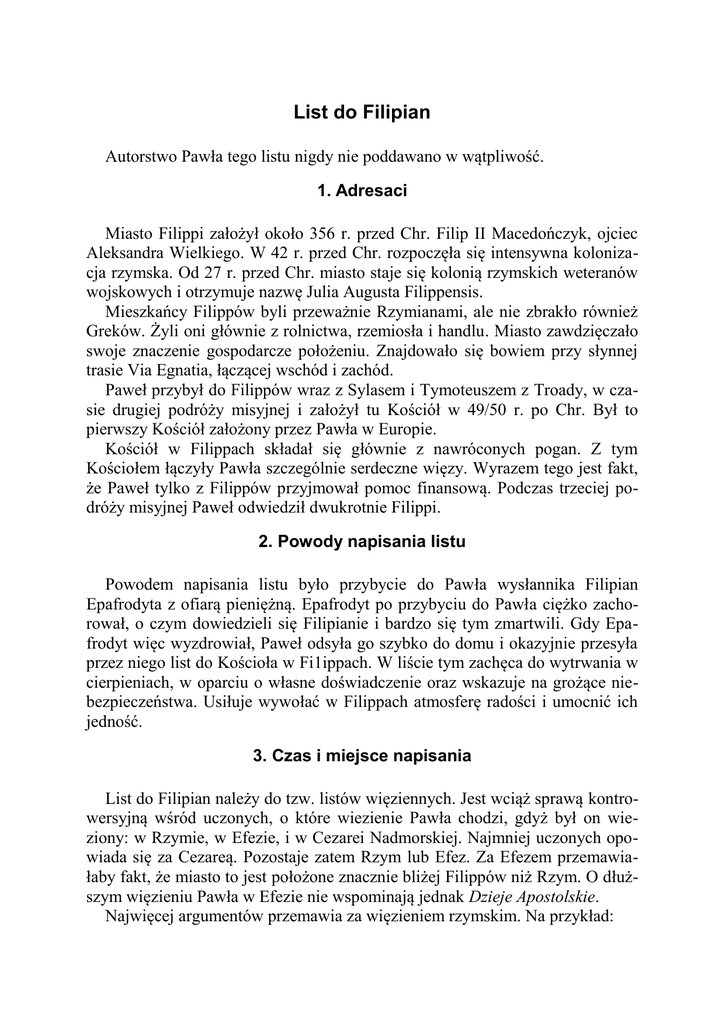 List do Filipian Autorstwo Pawła tego listu nigdy nie poddawano w wątpliwość. 1. Adresaci Miasto Filippi założył około 356 r. przed Chr. Filip II Macedończyk, ojciec Aleksandra Wielkiego. W 42 r. przed Chr. rozpoczęła się intensywna kolonizacja rzymska. Od 27 r. przed Chr. miasto staje się kolonią rzymskich weteranów wojskowych i otrzymuje nazwę Julia Augusta Filippensis. Mieszkańcy Filippów byli przeważnie Rzymianami, ale nie zbrakło również Greków. Żyli oni głównie z rolnictwa, rzemiosła i handlu. Miasto zawdzięczało swoje znaczenie gospodarcze położeniu. Znajdowało się bowiem przy słynnej trasie Via Egnatia, łączącej wschód i zachód. Paweł przybył do Filippów wraz z Sylasem i Tymoteuszem z Troady, w czasie drugiej podróży misyjnej i założył tu Kościół w 49/50 r. po Chr. Był to pierwszy Kościół założony przez Pawła w Europie. Kościół w Filippach składał się głównie z nawróconych pogan. Z tym Kościołem łączyły Pawła szczególnie serdeczne więzy. Wyrazem tego jest fakt, że Paweł tylko z Filippów przyjmował pomoc finansową. Podczas trzeciej podróży misyjnej Paweł odwiedził dwukrotnie Filippi. 2. Powody napisania listu Powodem napisania listu było przybycie do Pawła wysłannika Filipian Epafrodyta z ofiarą pieniężną. Epafrodyt po przybyciu do Pawła ciężko zachorował, o czym dowiedzieli się Filipianie i bardzo się tym zmartwili. Gdy Epafrodyt więc wyzdrowiał, Paweł odsyła go szybko do domu i okazyjnie przesyła przez niego list do Kościoła w Fi1ippach. W liście tym zachęca do wytrwania w cierpieniach, w oparciu o własne doświadczenie oraz wskazuje na grożące niebezpieczeństwa. Usiłuje wywołać w Filippach atmosferę radości i umocnić ich jedność. 3. Czas i miejsce napisania List do Filipian należy do tzw. listów więziennych. Jest wciąż sprawą kontrowersyjną wśród uczonych, o które wiezienie Pawła chodzi, gdyż był on wieziony: w Rzymie, w Efezie, i w Cezarei Nadmorskiej. Najmniej uczonych opowiada się za Cezareą. Pozostaje zatem Rzym lub Efez. Za Efezem przemawiałaby fakt, że miasto to jest położone znacznie bliżej Filippów niż Rzym. O dłuższym więzieniu Pawła w Efezie nie wspominają jednak Dzieje Apostolskie. Najwięcej argumentów przemawia za więzieniem rzymskim. Na przykład: 1) relacja Dziejów Apostolskich; 2) List do Filipian wskazuje na dłuższe więzienie Pawła; 3) warunki, w jakich przebywa Paweł we więzieniu, wskazują, że nie założył on Kościoła w miejscu swego uwięzienia (Flp 1, 12-18). Dziś zatem przyjmuje się, że list został napisany we więzieniu rzymskim około 60 r. po Chr. 4. Struktura listu Wstęp: 1, 1-30 Wezwanie do jedności: 2, 1-4 Hymn o kenozie Chrystusa: 2, 5-11 Różne napomnienia: 2, 12-18 Polecenie Tymoteusza: 2, 19-24 Wiadomości o chorobie Epafrodyta: 2, 25-30 Ostrzeżenie przed głosicielami błędnej nauki: 3-4, 1 Zakończenie wraz z parenezą końcową: 4, 2-23 5. Problem jedności listu W badaniach naukowych wielu uczonych kwestionuje jedność listu. Niektórzy wyodrębniają w Flp trzy listy: 1) List A: 4, 1-20 – krótki list z podziękowaniem za pomoc; 2) List B: 1, 1-3, 1 + 4, 4-7 + 4, 21-23 – relacja o sytuacji apostoła; 3) List C: 3, 2-4 + 4, 8-9 – polemika z głosicielami błędnej nauki. Jest wprawdzie możliwe, że pomiędzy Pawłem a Filipianami istniała wcześniejsza korespondencja, ale za jednością literacką i teologiczną przemawiają: 1) płynne powiązanie poszczególnych części (np. Flp 3, 1 i 3, 2); 2) jedność myśli teologicznej (np. w Flp 3, 20-21 nawiązuje do 2, 6-11). 3) analiza retoryczna. 6. Analiza retoryczna List do Filipian ma formę tekstu o charakterze retorycznym. Jako gatunek retoryki deliberatywnej1. Według D. WATSONA analiza retoryczna wykazuje następujące fazy retoryki Pawła: exordium narratio probatio (argumentatio) peroratio Flp 1, 3-26 Flp 1, 27-30 Flp 2, 1-3, 21 Flp4, 1-20 Exordium jest wstępem do przemówienia. We wstępie autor koncentruje się na uczuciach i stara się zainteresować słuchaczy. Narratio, czyli opowiadanie – przedstawienie faktów, zreferowanie tezy. Opowiadanie powinno być rzeczowe, jasne, krótkie i zrozumiałe. Przygotowuje ono argumentację, która zostanie rozwinięta w następnej części. Probatio (argumentatio) – to dowodzenie. W tej części mowy przytacza się argumenty oraz uzasadnia przedstawione w narratio fakty i tezy, aby przekonać słuchaczy (czytelników). Peroratio lub konkluzja kończy przemówienie i ma podwójne zadanie do spełnienia: 1) podsumować treści zawarte w narratio i argumentatio oraz 2) poruszyć uczucia słuchaczy, wywołać ich emocje. 6. Główne myśli teologiczne 1. Tematem wiodącym listu jest egzystencja chrześcijańska. Chrześcijanin opiera swoją egzystencję na Jezusie Chrystusie (Flp 2, 1-5. 6-11. 12-18). Chrystus sprawia, strzeże i dopełnia zbawienie każdego. Chrystus jest najwyższą wartością (Flp 1, 21). Przykład życia Chrystusa jest dla chrześcijanina modelem postępowania. W życiu należy więc kierować się tylko tym, co odpowiada Chrystusowi (Flp 1, 27-30). Podobnie jak Chrystus zrezygnował z przywilejów, które mu przysługiwały i uniżył się aż do śmierci na krzyżu, tak samo chrześcijanin powinien zrezygnować z egoizmu oraz przyjąć postawę pokory i jedności ze wszystkimi. Egzystencja chrześcijańska zmierza ku doskonałości, dopełnieniu, które dokona się po powtórnym przyjściu Chrystusa, sądzie i zmartwychwstaniu (Flp 3, 12-14). Na tak pojętej egzystencji bazuje etyka. Nie jest ona jednak tylko serią trudnych do spełnienia postulatów, lecz współpracą z łaską Boga (Flp 4, 12-14) i mocą Ducha Świętego, który w nas działa (Flp 1, 19). Gatunek deliberatywny przedstawia punkt widzenia autora w tym celu, aby zyskać poparcie czytelników, czy też słuchaczy. 1 2. List ukazuje również model idealnego Kościoła. Podstawą i