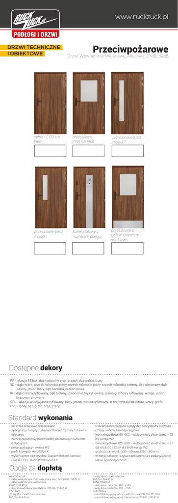 www.ruckzuck.pl DRZWI TECHNICZNE I OBIEKTOWE Przeciwpożarowe Drzwi Wewnętrzne Wejściowe, Akustyka, 27dB, 32dB pełne - EI30 lub EI60 przeszklone EI30 lub EI60 przeszklone EI60 model 1 panel stalowy z numerem pokoju przeszklone EI30 model 1 przeszklone z dolnym panelem stalowym Dostępne dekory PR - akacja ST,buk, dąb naturalny pion, orzech, dąb polski, biały 3D - dąb riviera, orzech kolumbia jasny, orzech kolumbia jasny, orzech kolumbia ciemny, dąb olejowany, dąb palony, jesion biały, dąb sonoma, orzech rossa IR - dąb cimeny ryflowany, dąb bielony, jesion śnieżny ryflowany, jesion grafitowy ryflowany, wenge, jesion brązowy ryflowany CPL - akacja, akacja jasna ryflowany, biały, jesion mocca ryflowany, orzech włoski struktura, szary, grafit HPL - biały, beż, grafit, brąz, szary. Standard wykonania - skrzydło drzwiowe okleinowane - specjalistyczna płyta dwuwarstwowa/ramiak z drewna iglastego - zamek zapadkowy pod wkładkę patentową z wkładem izolacyjnym - próg opadający - wersja W2 - profil krawędzi Hard Edge K - wykończenie powierzchni: Classen Iridium, laminat Classen CPL, laminat Classen HPL - uszczelka pęczniejąca w przyldze skrzydła drzwiowego - cztery srebrne zawiasy czopowe - jednoskrzydłowe 80’-100’ - izolacyjność akustyczna = 32 dB wersja W2 - dwuskrzydłowe 120’-200’ - izolacyjność akustyczna = 27 dB dla EI30 i 32 dB dla EI60 wersja W2 - grubość skrzydeł: EI30 - 50 mm, EI60 - 60 mm - w wersji szklonej: szyba transparentna o podwyższonej klasie ognioodporności Opcje za dopłatą WENTYLACJA - kratka wentylacyjna PVC: biały, szary, brąz, beż: 25,00 / 30,75 zł - kratka wentylacyjna, aluminiowa: 89,00 / 109,47 zł - panel stalowy dolny z wentylacją: 255,00 / 313,65 zł SZKLENIE - bulaj 35 tr - szkło transparentne: 280,00 / 344,00 zł - bulaj 35 ml - szkło mleczne: 280,00 / 344,00 zł KONSTRUKCJA - skrzydło o szerokości 100’: + 10% - skrzydło o szerokości 110’: + 15% AKCESORIA - panel stalowy pełny, górny - jednostronny: 139,00 / 171,00 zł - panel stalowy pełny, górny - dwustronny: 229,00 / 281,67 zł