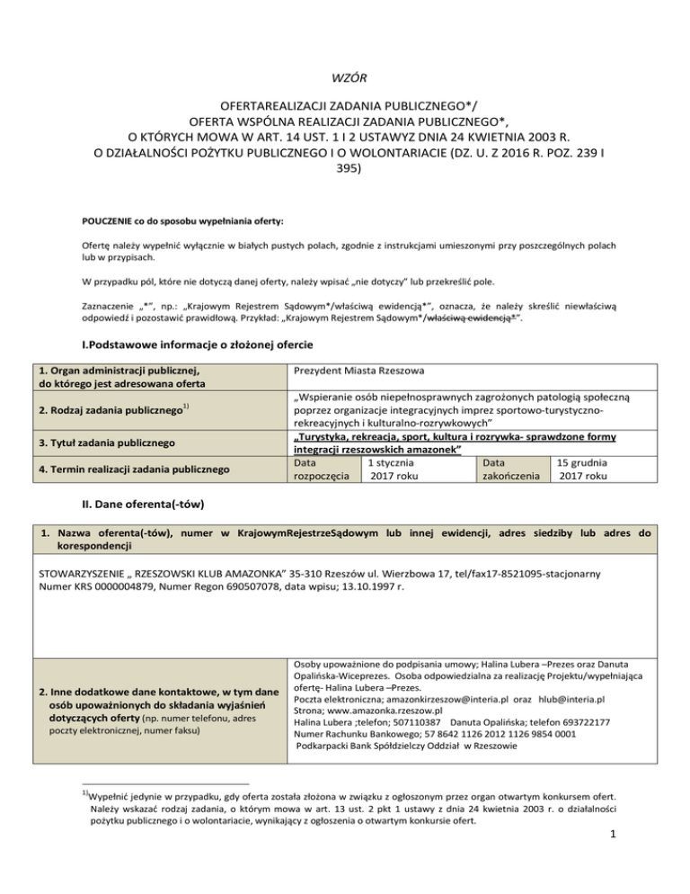 WZÓR OFERTAREALIZACJI ZADANIA PUBLICZNEGO*/ OFERTA WSPÓLNA REALIZACJI ZADANIA PUBLICZNEGO*, O KTÓRYCH MOWA W ART. 14 UST. 1 I 2 USTAWYZ DNIA 24 KWIETNIA 2003 R. O DZIAŁALNOŚCI POŻYTKU PUBLICZNEGO I O WOLONTARIACIE (DZ. U. Z 2016 R. POZ. 239 I 395) POUCZENIE co do sposobu wypełniania oferty: Ofertę należy wypełnić wyłącznie w białych pustych polach, zgodnie z instrukcjami umieszonymi przy poszczególnych polach lub w przypisach. W przypadku pól, które nie dotyczą danej oferty, należy wpisać „nie dotyczy” lub przekreślić pole. Zaznaczenie „*”, np.: „Krajowym Rejestrem Sądowym*/właściwą ewidencją*”, oznacza, że należy skreślić niewłaściwą odpowiedź i pozostawić prawidłową. Przykład: „Krajowym Rejestrem Sądowym*/właściwą ewidencją*”. I.Podstawowe informacje o złożonej ofercie 1. Organ administracji publicznej, do którego jest adresowana oferta 2. Rodzaj zadania publicznego1) 3. Tytuł zadania publicznego 4. Termin realizacji zadania publicznego Prezydent Miasta Rzeszowa „Wspieranie osób niepełnosprawnych zagrożonych patologią społeczną poprzez organizacje integracyjnych imprez sportowo-turystycznorekreacyjnych i kulturalno-rozrywkowych” „Turystyka, rekreacja, sport, kultura i rozrywka- sprawdzone formy integracji rzeszowskich amazonek” Data 1 stycznia Data 15 grudnia rozpoczęcia 2017 roku zakończenia 2017 roku II. Dane oferenta(-tów) 1. Nazwa oferenta(-tów), numer w KrajowymRejestrzeSądowym lub innej ewidencji, adres siedziby lub adres do korespondencji STOWARZYSZENIE „ RZESZOWSKI KLUB AMAZONKA” 35-310 Rzeszów ul. Wierzbowa 17, tel/fax17-8521095-stacjonarny Numer KRS 0000004879, Numer Regon 690507078, data wpisu; 13.10.1997 r. 2. Inne dodatkowe dane kontaktowe, w tym dane osób upoważnionych do składania wyjaśnień dotyczących oferty (np. numer telefonu, adres poczty elektronicznej, numer faksu) Osoby upoważnione do podpisania umowy; Halina Lubera –Prezes oraz Danuta Opalińska-Wiceprezes. Osoba odpowiedzialna za realizację Projektu/wypełniająca ofertę- Halina Lubera –Prezes. Poczta elektroniczna; [email protected] oraz [email protected] Strona; www.amazonka.rzeszow.pl Halina Lubera ;telefon; 507110387 Danuta Opalińska; telefon 693722177 Numer Rachunku Bankowego; 57 8642 1126 2012 1126 9854 0001 Podkarpacki Bank Spółdzielczy Oddział w Rzeszowie 1) Wypełnić jedynie w przypadku, gdy oferta została złożona w związku z ogłoszonym przez organ otwartym konkursem ofert. Należy wskazać rodzaj zadania, o którym mowa w art. 13 ust. 2 pkt 1 ustawy z dnia 24 kwietnia 2003 r. o działalności pożytku publicznego i o wolontariacie, wynikający z ogłoszenia o otwartym konkursie ofert. 1 3. Nazwa, adres i dane kontaktowe jednostki organizacyjnej bezpośrednio wykonującej zadanie publiczne, o którym mowa w ofercie(należy wypełnić, jeżeli zadanie ma być realizowane przez oddział terenowy, placówkę lub inną jednostkę organizacyjną oferenta) Nie dotyczy 4. Przedmiot działalności pożytku publicznego: 1) działalność nieodpłatna pożytku publicznego: Klub Amazonka realizuje swoje cele poprzez; nieodpłatną działalność pożytku publicznego 1. Wzajemne wspieranie się w trudnej sytuacji życiowej, w jakiej postawiła nas choroba. 2. Organizacja prelekcji o tematyce współczesnego leczenia raka piersi i rehabilitacji. 3. Propagowanie i organizacja zajęć rehabilitacyjnych i terapii psychologicznej. 4. Przygotowanie się do roli „ ochotniczek”, aby służyć kobietom, które znajdą się w analogicznej sytuacji. 5. Działalność związana z problemami zdrowotnymi członkiń, np. zaopatrzenie rehabilitacyjne, sanatoria itp. 6. Działania integrujące środowisko kobiet po leczeniu raka piersi - spotkania oraz wyjazdy i wycieczki integracyjne. 7. Propagowanie ; rekreacji, sportu, turystyki. 8. Upowszechnianie kultury i sztuki wśród Amazonek 9. Promocję i organizację wolontariatu. 10. Organizowanie akcji charytatywnych. 11. Organizowanie grup wsparcia i samopomocy. 12. Ochronę i promocję zdrowia; profilaktyka wczesnego wykrywania raka piersi. 13. Działalność wydawnicza; materiały informacyjno-edukacyjne 14. Pielęgnowanie tradycji narodowych, kulturowych oraz patriotyzmu wśród Amazonek, 15. Kształtowanie wymiany dobrych praktyk poprzez współpracę z organizacjami pozarządowymi Unii Europejskiej, 16. Pozyskiwanie środków unijnych i spoza Unii Europejskiej na działania statutowe Klubu, 17. Wdrażanie nowych technologii; zakup sprzętu rehabilitacyjnego, sprzętu rekreacyjno- sportowego, sprzętu komputerowego, 18. Działalności na rzecz osób niepełnosprawnych, 19. Przeciwdziałania uzależnieniom i patologiom społecznym, 20. Pomocy społecznej, w tym osobom w trudnej sytuacji życiowej. 2 2)działalność odpłatna pożytku publicznego: Klub Amazonka realizuje również swoje cele poprzez; odpłatną działalność pożytku publicznego. 1. Wzajemne wspieranie się w trudnej sytuacji życiowej, w jakiej postawiła nas choroba. 2. Organizacja prelekcji o tematyce współczesnego leczenia raka piersi i rehabilitacji. 3. Propagowanie i organizacja zajęć rehabilitacyjnych i terapii psychologicznej. 4. Przygotowanie się do roli „ ochotniczek”, aby służyć kobietom, które znajdą się w analogicznej sytuacji. 5. Działalność związana z problemami zdrowotnymi członkiń, np. zaopatrzenie rehabilitacyjne, sanatoria itp. 6. Działania integrujące środowisko kobiet po leczeniu raka piersi - spotkania oraz wyjazdy i wycieczki integracyjne. 7. Propagowanie: rekreacji, sportu, turystyki. 8. Upowszechnianie kultury i sztuki wśród Amazonek 9. Promocję i organizację wolontariatu. 10. Organizowanie akcji charytatywnych. 11. Organizowanie grup wsparcia i samopomocy. 12. Ochronę i promocję zdrowia; profilaktyka wczesnego wykrywania raka piersi. 13. Działalność wydawnicza; materiały informacyjno-edukacyjne 14. Pielęgnowanie tradycji narodowych, kulturo