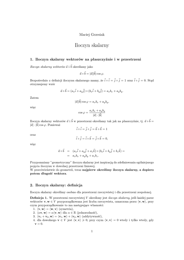 1. Iloczyn skalarny wektorów na płaszczyźnie i w przestrzeni