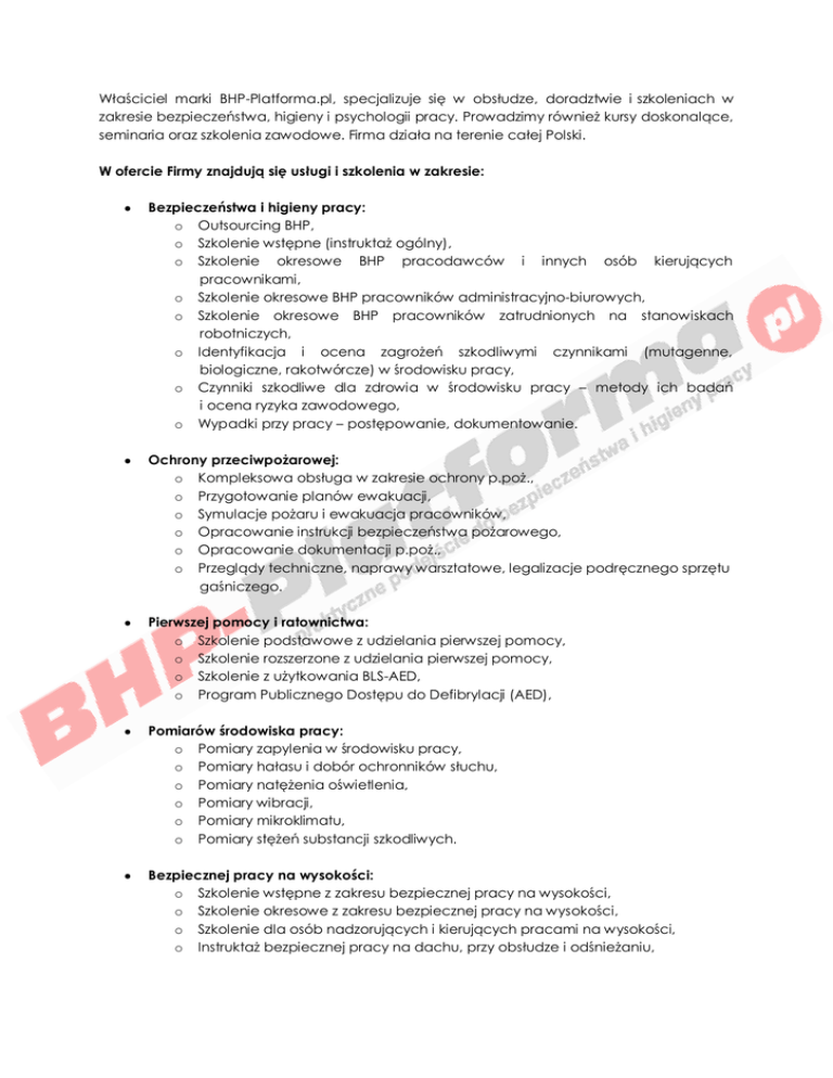 Właściciel marki BHP-Platforma.pl, specjalizuje się w obsłudze, doradztwie i szkoleniach w zakresie bezpieczeństwa, higieny i psychologii pracy. Prowadzimy również kursy doskonalące, seminaria oraz szkolenia zawodowe. Firma działa na terenie całej Polski. W ofercie Firmy znajdują się usługi i szkolenia w zakresie: Bezpieczeństwa i higieny pracy: o Outsourcing BHP, o Szkolenie wstępne (instruktaż ogólny), o Szkolenie okresowe BHP pracodawców i innych osób kierujących pracownikami, o Szkolenie okresowe BHP pracowników administracyjno-biurowych, o Szkolenie okresowe BHP pracowników zatrudnionych na stanowiskach robotniczych, o Identyfikacja i ocena zagrożeń szkodliwymi czynnikami (mutagenne, biologiczne, rakotwórcze) w środowisku pracy, o Czynniki szkodliwe dla zdrowia w środowisku pracy – metody ich badań i ocena ryzyka zawodowego, o Wypadki przy pracy – postępowanie, dokumentowanie. Ochrony przeciwpożarowej: o Kompleksowa obsługa w zakresie ochrony p.poż., o Przygotowanie planów ewakuacji, o Symulacje pożaru i ewakuacja pracowników, o Opracowanie instrukcji bezpieczeństwa pożarowego, o Opracowanie dokumentacji p.poż., o Przeglądy techniczne, naprawy warsztatowe, legalizacje podręcznego sprzętu gaśniczego. Pierwszej pomocy i ratownictwa: o Szkolenie podstawowe z udzielania pierwszej pomocy, o Szkolenie rozszerzone z udzielania pierwszej pomocy, o Szkolenie z użytkowania BLS-AED, o Program Publicznego Dostępu do Defibrylacji (AED), Pomiarów środowiska pracy: o Pomiary zapylenia w środowisku pracy, o Pomiary hałasu i dobór ochronników słuchu, o Pomiary natężenia oświetlenia, o Pomiary wibracji, o Pomiary mikroklimatu, o Pomiary stężeń substancji szkodliwych. Bezpiecznej pracy na wysokości: o Szkolenie wstępne z zakresu bezpiecznej pracy na wysokości, o Szkolenie okresowe z zakresu bezpiecznej pracy na wysokości, o Szkolenie dla osób nadzorujących i kierujących pracami na wysokości, o Instruktaż bezpiecznej pracy na dachu, przy obsłudze i odśnieżaniu, Naszym celem jest profesjonalna obsługa Firm, Instytucji, Inwestorów w celu efektywnego podnoszenia ich standardów bezpieczeństwa. Cel ten jest realizowany poprzez zachowanie jak najwyższego poziomu świadczonych usług, mając na uwadze spełnienie wszystkich wymogów prawnych w dziedzinie bhp, p.poż. i ochrony środowiska, z jednoczesnym uwzględnieniem uwarunkowań rynkowych. Zaufali nam m.in.: Polimex – Mostostal S.A., Miejskie Przedsiębiorstwo Wodociągów i Kanalizacji w m.st. Warszawie S.A., Danone - Nutricia Zakłady Produkcyjne Sp. z o.o., Iglotex S.A., Kopalnia Węgla Brunatnego Bełchatów S.A. Okręgowy Inspektorat Pracy w Łodzi, Politechnika Łódzka, Kaszubskie Centrum Sportowo-Rekreacyjne Sp. z o.o., Pfeifer & Langen Polska S.A., Ośrodek Szkoleń Specjalistycznych Straży Granicznej, ELSTER – PKP Sp. z o.o., PHARMGAS S.A., Katowickie Wodociągi S.A., Saur Neptun Gdańsk S.A., Aquanet Poznań, Centrum Medyczne „Bazarowa” N.Z.O.Z., Veolia Water Systems sp. z o.o., WUPRINŻ S.A., BINŻ S.A., BP Techem S.A., i wiele innych. ORGANIZACJA FIRMY Biuro Firmy znajduje się w Łodzi, przy ul. Łąkowej 11. Znajdują się tam również w pełni multimedialne sale szkoleniowe, w których prowadzone są szkolenia i seminaria otwarte. Ponadto Firma zatrudnia specjalistów ds. BHP i ppoż. w całej Polsce. ZAPYTAJ O SZKOLENIE! Chcesz wiedzieć więcej, zorganizować szkolenie lub powierzyć obsługę BHP Twojej firmy Specjalistom ds. BHP? Napisz: [email protected] lub zadzwoń na +48 501 401 620. Główny Koordynator ds. BHP Koordynator Regionalny ds. BHP Koordynator Lokalny ds. BHP