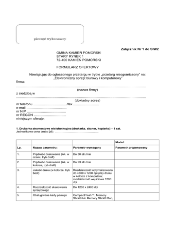 Załącznik Nr 1 do SIWZ GMINA KAMIEŃ POMORSKI STARY RYNEK 1 72-400 KAMIEŃ POMORSKI FORMULARZ OFERTOWY Nawiązując do ogłoszonego przetargu w trybie „przetarg nieograniczony” na: „Elektroniczny sprzęt biurowy i komputerowy” firma: ........................................................................................................................................ (nazwa firmy) z siedzibą w ........................................................................................................................................ (dokładny adres) nr telefonu .................................../fax ........................... e-mail .......................................... nr NIP ......................................... nr REGON .................................. niniejszym oferuje: 1. Drukarka atramentowa wielofunkcyjna (drukarka, skaner, kopiarka) – 1 szt. Jednostkowa cena brutto [zł] : ………………………………………. Model: Lp. Nazwa parametru: Parametr wymagany 1. Prędkość drukowania (A4, w czerni, tryb draft) Do 30 str./min 2. Prędkość drukowania (A4, w kolorze, tryb draft) Do 23 str./min 3. Jakość druku (w kolorze, tryb best) Rozdzielczość optymalizowana do 4800 x 1200 dpi przy druku w kolorze z komputera; rozdzielczość wejściowa 1200 dpi 4. Rozdzielczość skanowania sprzętowego Do 1200 x 2400 dpi 5. Obsługiwane karty pamięci CompactFlash™, Memory Stick® lub Memory Stick® Duo, Parametr proponowany Secure Digital (SD) lub MultiMediaCard (MMC), xDPicture Card 6 Druk dwustronny Ręczny (z obsługą przez sterownik) 7. Maksymalna pojemność podajnika (arkusze) Do 100 8. Normatywny cykl pracy (miesięcznie, format A4) Do 1000 stron 9. Prędkość druku (kolorowe zdjęcie, tryb roboczy) W ciągu 25 sekund 10. Prędkość drukowania (A4, w czerni, tryb normal) Do 8,9 str./min 11. Prędkość druku (w kolorze, z Do 5,3 str./min normalną jakością, format A4) 12. Jakość druku (w czerni, tryb best) Rozdzielczość do 1200 dpi w czerni przy druku z komputera 13. Jakość druku (w kolorze, tryb best) Rozdzielczość optymalizowana do 4800 x 1200 dpi przy druku w kolorze z komputera; rozdzielczość wejściowa 1200 dpi 14. Typ skanera Płaski 15. Optyczna rozdzielczość skanowania Do 1200 dpi 16. Rozdzielczość skanowania sprzętowego Do 1200 x 2400 dpi 17. Kodowanie koloru 48-bitowa 18. Poziomy skali szarości 256 19. Zakres skalowania lub powiększania obrazu od 50 do 400% 20. Prędkość kopiowania (w czerni, tryb draft, format A4) Do 30 kopii/min 21. Prędkość kopiowania (w kolorze, tryb draft, format A4) Do 23 kopii/min 22. Rozdzielczość kopii (tekst w czerni) Do 600 x 600 dpi 23. Gramatura nośników (wg ścieżki podawania papieru) A4: Od 75 do 90 g/m²; legal: Od 75 do 90 g/m²; koperty: Od 75 do 90 g/m²; karty: do 200 g/m²; zdjęcie 10 x 15 cm: do 280 g/m² 24. Standardowe rozwiązania komunikacyjne USB 2.0 25. Standardowa pamięć 32 MB 26. Obsługiwane systemy operacyjne Windows® 2000 (SP3), Windows® XP Home, Windows® XP Professional, Windows Vista® Ready, Mac OS X v10.3.9, Mac OS X v10.4 lub nowsze 27. Zużycie energii Maksymalnie 70 W (aktywne/drukowanie), maksymalnie 7,5 W (tryb gotowości) 28. Waga 5,09 kg 29. Gwarancja 1 rok 2. Laptop – 1 szt. Jednostkowa cena brutto [zł] : ………………………………………. Model laptopa: Lp. Nazwa parametru Parametr wymagany: 1. Procesor Intel Core 2 Duo T8100 / 2.1 GHz ( Dual-Core ) 3 MB - L2 Cache 2. Przekątna matrycy 15.4” 3. Matryca 1680 x 1050 ( WSXGA+ ) 4. Pamięć zainstalowana 1024 MB 5. Pamięć (zajęte sloty) 1 6. Pamięć (max. pojemność) 3 GB 7. Pamięć (technologia) SO-DIMM DDR2 667 MHz 8. Dysk twardy (pojemność) 160 GB 9. Dysk twardy (interfejs) SATA 10. Dysk twardy (prędkość) 5400 obr/min 11. Napęd optyczny (typ) DVD-Writer - integrated 12. Karta graficzna NVIDIA GeForce Go 7300 TurboCache - PCI Express x16 (256 MB) Parametr proponowany: 13. Karta dźwiękowa Zintegrowana 14. Karta sieciowa przewodowa 10/100 Mbps Ethernet 15. Karta sieciowa bezprzewodowa 802.11 a/b/g/n (draft) 16. Bluetooth Tak 17. Fax modem Tak 18. ExpressCard 54 Tak 19. Czytnik linii papilarnych Tak 20. display / video - VGA - 15 pin HD D-Sub (HD-15) Tak 21. S-video/TV-out Tak 22. Line-in Tak 23. Line-out Tak 24. Mikrofon zewnętrzny Nie 25. S/PDIF Nie 26. LPT (równoległy) Nie 27. RS232 (szeregowy) Nie 28. Moduł GPS Nie 29. Czytnik kart pamięci Tak 30. Fire-Wire (IEEE1394) Tak 31. USB 2.0 4 szt. 32. Urządzenie wskazujące TOUCHPAD 33. Zainstalowany system operacyjny MS Wndows XP Professional OEM PL 34. Zainstalowany pakiet biurowy Pełna wersja pakietu Microsoft Office Profesional 2007 W32 Polish OEM lub inny o równoważnej / wyższej funkcjonalności. Oprogramowanie musi edytować pliki w formacie docx. Pakiet oprogramowania musi być kompatybilny z systemem operacyjnym Windows XP Professional. Musi posiadać wbudowaną polską pomoc w strukturę oprogramowania. Polskie wsparcie techniczne musi być dostępne dla użytkownika oprogramowania. Z oprogramowaniem musi być dostarczona polska dokumentacja. W przypadku zaoferowania rozwiązania równoważnego oferent ma obowiązek szczegółowego udokumentowania funkcjonalności oferowanego oprogramowania. 35. Zainstalowane oprogramowanie do nagrywania płyt CD i DVD Tak 36. Dodatkowo dołączone 1.Bateria 2.Ładowarka 3.Oprogramowanie instalacyjne dostarczone na nośnikach elektronicznych lub na predefiniowanej partycji: a) do nagrywania płyt CD i DVD, b) system operacyjny MS Windows XP Professional OEM PL wraz z licencją i certyfikatem autentyczności. 4. Licencja wraz certyfikatem autentyczności dla pakietu biurowego Microsoft Office Profesional 2007 OEM PL lub innego o równoważnej / wyższej funkcjonalności. 37. Akumulator 6-cell Lithium Ion 38. Waga Max. 2,8 kg 39. Gwarancja 12 miesięcy 40. Gwarancja międzynarodowa Tak 41. Gwarancja baterii 12 miesięcy 42. Zintegrowana ochrona przed wszelkimi zagroż