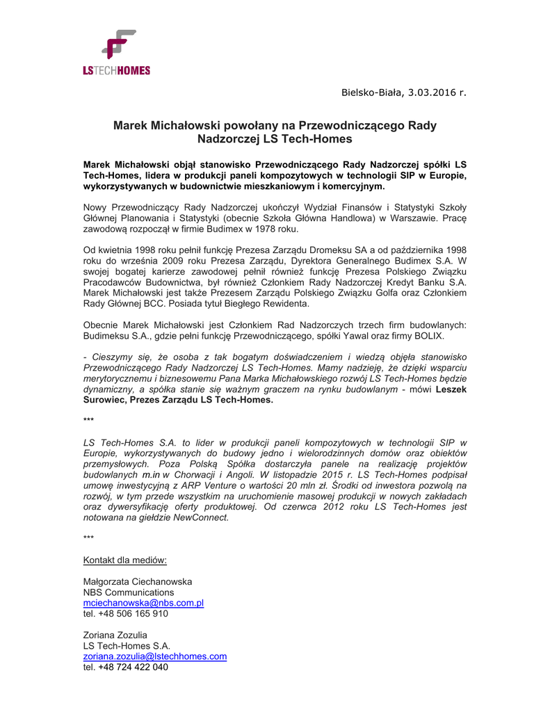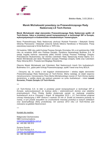 Bielsko-Biała, 3.03.2016 r. Marek Michałowski powołany na Przewodniczącego Rady Nadzorczej LS Tech-Homes Marek Michałowski objął stanowisko Przewodniczącego Rady Nadzorczej spółki LS Tech-Homes, lidera w produkcji paneli kompozytowych w technologii SIP w Europie, wykorzystywanych w budownictwie mieszkaniowym i komercyjnym. Nowy Przewodniczący Rady Nadzorczej ukończył Wydział Finansów i Statystyki Szkoły Głównej Planowania i Statystyki (obecnie Szkoła Główna Handlowa) w Warszawie. Pracę zawodową rozpoczął w firmie Budimex w 1978 roku. Od kwietnia 1998 roku pełnił funkcję Prezesa Zarządu Dromeksu SA a od października 1998 roku do września 2009 roku Prezesa Zarządu, Dyrektora Generalnego Budimex S.A. W swojej bogatej karierze zawodowej pełnił również funkcję Prezesa Polskiego Związku Pracodawców Budownictwa, był również Członkiem Rady Nadzorczej Kredyt Banku S.A. Marek Michałowski jest także Prezesem Zarządu Polskiego Związku Golfa oraz Członkiem Rady Głównej BCC. Posiada tytuł Biegłego Rewidenta. Obecnie Marek Michałowski jest Członkiem Rad Nadzorczych trzech firm budowlanych: Budimeksu S.A., gdzie pełni funkcję Przewodniczącego, spółki Yawal oraz firmy BOLIX. - Cieszymy się, że osoba z tak bogatym doświadczeniem i wiedzą objęła stanowisko Przewodniczącego Rady Nadzorczej LS Tech-Homes. Mamy nadzieję, że dzięki wsparciu merytorycznemu i biznesowemu Pana Marka Michałowskiego rozwój LS Tech-Homes będzie dynamiczny, a spółka stanie się ważnym graczem na rynku budowlanym - mówi Leszek Surowiec, Prezes Zarządu LS Tech-Homes. *** LS Tech-Homes S.A. to lider w produkcji paneli kompozytowych w technologii SIP w Europie, wykorzystywanych do budowy jedno i wielorodzinnych domów oraz obiektów przemysłowych. Poza Polską Spółka dostarczyła panele na realizację projektów budowlanych m.in w Chorwacji i Angoli. W listopadzie 2015 r. LS Tech-Homes podpisał umowę inwestycyjną z ARP Venture o wartości 20 mln zł. Środki od inwestora pozwolą na rozwój, w tym przede wszystkim na uruchomienie masowej produkcji w nowych zakładach oraz dywersyfikację oferty produktowej. Od czerwca 2012 roku LS Tech-Homes jest notowana na giełdzie NewConnect. *** Kontakt dla mediów: Małgorzata Ciechanowska NBS Communications [email protected] tel. +48 506 165 910 Zoriana Zozulia LS Tech-Homes S.A. [email protected] tel. +48 724 422 040
