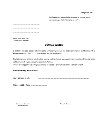 Załącznik Nr 2 do „Regulaminu wystawiania i przesyłania faktur w formie elektronicznej w Xella Polska Sp. z o.o." ……………………………………… ……………………………………… …………………………………….. Nazwa firmy, adres , NIP ( lub pieczątka firmowa ) OŚWIADCZENIE o zmianie adresu poczty elektronicznej wykorzystywanego do odbierania faktur elektronicznych z Xella Polska Sp. z o.o., ul. 17 Stycznia 48,02-146 Warszawa. Oświadczam, że zmianie uległ adres poczty elektronicznej wykorzystywany w celu odbierania faktur elektronicznych wystawianych przez Xella Polska. Proszę o uwzględnienie niniejszej zmiany w procesie przesyłania faktur elektronicznych : dotychczasowy adres e-mail: ………………………………………………………………………... nowy adres e-mail : ..................................................................................................... Miejscowość i data: …………………….. Osoba upoważniona do reprezentacji firmy Pieczątka firmowa