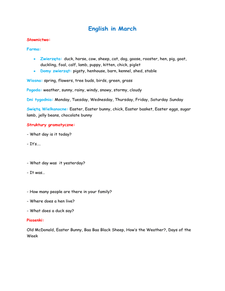 English in March Słownictwo: Farma: Zwierzęta: duck, horse, cow, sheep, cat, dog, goose, rooster, hen, pig, goat, duckling, foal, calf, lamb, puppy, kitten, chick, piglet Domy zwierząt: pigsty, henhouse, barn, kennel, shed, stable Wiosna: spring, flowers, tree buds, birds, green, grass Pogoda: weather, sunny, rainy, windy, snowy, stormy, cloudy Dni tygodnia: Monday, Tuesday, Wednesday, Thursday, Friday, Saturday Sunday Swiętą Wielkanocne: Easter, Easter bunny, chick, Easter basket, Easter eggs, sugar lamb, jelly beans, chocolate bunny Struktury gramatyczne: - What day is it today? - It’s…. - What day was it yesterday? - It was… - How many people are there in your family? - Where does a hen live? - What does a duck say? Piosenki: Old McDonald, Easter Bunny, Baa Baa Black Sheep, How’s the Weather?, Days of the Week