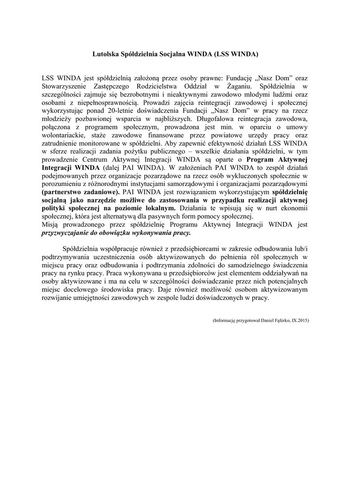 Lutolska Spółdzielnia Socjalna WINDA (LSS WINDA) LSS WINDA jest spółdzielnią założoną przez osoby prawne: Fundację „Nasz Dom” oraz Stowarzyszenie Zastępczego Rodzicielstwa Oddział w Żaganiu. Spółdzielnia w szczególności zajmuje się bezrobotnymi i nieaktywnymi zawodowo młodymi ludźmi oraz osobami z niepełnosprawnością. Prowadzi zajęcia reintegracji zawodowej i społecznej wykorzystując ponad 20-letnie doświadczenia Fundacji „Nasz Dom” w pracy na rzecz młodzieży pozbawionej wsparcia w najbliższych. Długofalowa reintegracja zawodowa, połączona z programem społecznym, prowadzona jest min. w oparciu o umowy wolontariackie, staże zawodowe finansowane przez powiatowe urzędy pracy oraz zatrudnienie monitorowane w spółdzielni. Aby zapewnić efektywność działań LSS WINDA w sferze realizacji zadania pożytku publicznego – wszelkie działania spółdzielni, w tym prowadzenie Centrum Aktywnej Integracji WINDA są oparte o Program Aktywnej Integracji WINDA (dalej PAI WINDA). W założeniach PAI WINDA to zespół działań podejmowanych przez organizacje pozarządowe na rzecz osób wykluczonych społecznie w porozumieniu z różnorodnymi instytucjami samorządowymi i organizacjami pozarządowymi (partnerstwo zadaniowe). PAI WINDA jest rozwiązaniem wykorzystującym spółdzielnię socjalną jako narzędzie możliwe do zastosowania w przypadku realizacji aktywnej polityki społecznej na poziomie lokalnym. Działania te wpisują się w nurt ekonomii społecznej, która jest alternatywą dla pasywnych form pomocy społecznej. Misją prowadzonego przez spółdzielnię Programu Aktywnej Integracji WINDA jest przyzwyczajanie do obowiązku wykonywania pracy. Spółdzielnia współpracuje również z przedsiębiorcami w zakresie odbudowania lub/i podtrzymywania uczestniczenia osób aktywizowanych do pełnienia ról społecznych w miejscu pracy oraz odbudowania i podtrzymania zdolności do samodzielnego świadczenia pracy na rynku pracy. Praca wykonywana u przedsiębiorców jest elementem oddziaływań na osoby aktywizowane i ma na celu w szczególności doświadczanie przez nich potencjalnych miejsc docelowego środowiska pracy. Daje również możliwość osobom aktywizowanym rozwijanie umiejętności zawodowych w zespole ludzi doświadczonych w pracy. (Informację przygotował Daniel Fąferko, IX.2015)