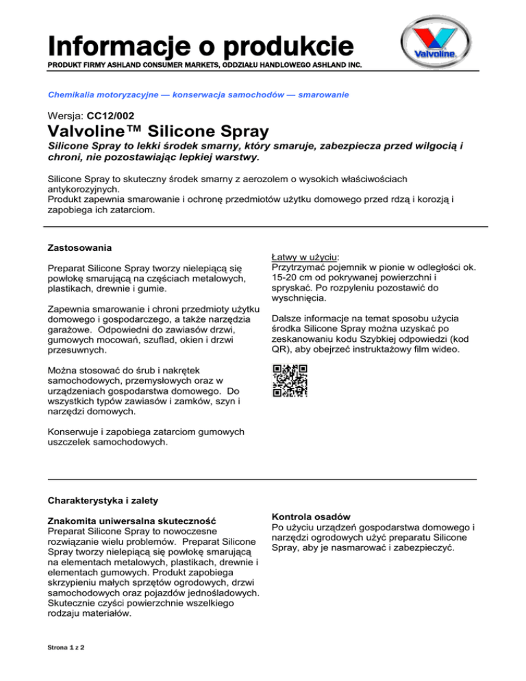 Informacje o produkcie PRODUKT FIRMY ASHLAND CONSUMER MARKETS, ODDZIAŁU HANDLOWEGO ASHLAND INC. Chemikalia motoryzacyjne — konserwacja samochodów — smarowanie Wersja: CC12/002 Valvoline™ Silicone Spray Silicone Spray to lekki środek smarny, który smaruje, zabezpiecza przed wilgocią i chroni, nie pozostawiając lepkiej warstwy. Silicone Spray to skuteczny środek smarny z aerozolem o wysokich właściwościach antykorozyjnych. Produkt zapewnia smarowanie i ochronę przedmiotów użytku domowego przed rdzą i korozją i zapobiega ich zatarciom. Zastosowania Preparat Silicone Spray tworzy nielepiącą się powłokę smarującą na częściach metalowych, plastikach, drewnie i gumie. Łatwy w użyciu: Przytrzymać pojemnik w pionie w odległości ok. 15-20 cm od pokrywanej powierzchni i spryskać. Po rozpyleniu pozostawić do wyschnięcia. Zapewnia smarowanie i chroni przedmioty użytku domowego i gospodarczego, a także narzędzia garażowe. Odpowiedni do zawiasów drzwi, gumowych mocowań, szuflad, okien i drzwi przesuwnych. Dalsze informacje na temat sposobu użycia środka Silicone Spray można uzyskać po zeskanowaniu kodu Szybkiej odpowiedzi (kod QR), aby obejrzeć instruktażowy film wideo. Można stosować do śrub i nakrętek samochodowych, przemysłowych oraz w urządzeniach gospodarstwa domowego. Do wszystkich typów zawiasów i zamków, szyn i narzędzi domowych. Konserwuje i zapobiega zatarciom gumowych uszczelek samochodowych. Charakterystyka i zalety Znakomita uniwersalna skuteczność Preparat Silicone Spray to nowoczesne rozwiązanie wielu problemów. Preparat Silicone Spray tworzy nielepiącą się powłokę smarującą na elementach metalowych, plastikach, drewnie i elementach gumowych. Produkt zapobiega skrzypieniu małych sprzętów ogrodowych, drzwi samochodowych oraz pojazdów jednośladowych. Skutecznie czyści powierzchnie wszelkiego rodzaju materiałów. Strona 1 z 2 Kontrola osadów Po użyciu urządzeń gospodarstwa domowego i narzędzi ogrodowych użyć preparatu Silicone Spray, aby je nasmarować i zabezpieczyć. Informacje o produkcie PRODUKT FIRMY ASHLAND CONSUMER MARKETS, ODDZIAŁU HANDLOWEGO ASHLAND INC. Bezpieczeństwo People Who Know Use Valvoline™ Niniejszy produkt prawdopodobnie nie stwarza znaczącego zagrożenia dla zdrowia lub bezpieczeństwa, o ile jest używany prawidłowo w odpowiednim zastosowaniu. Kartę charakterystyki (MSDS) można uzyskać na życzenie od lokalnego dystrybutora lub pobrać ją z witryny pod adresem http://msds.ashland.com Działając w ponad 100 krajach na całym świecie, firma Valvoline to wiodący sprzedawca, dystrybutor i producent wysokiej jakości produktów i usług samochodowych i przemysłowych. Do produktów tej firmy należą smary samochodowe, m. in. MaxLife™ — pierwszy olej silnikowy o formule przeznaczonej specjalnie do pojazdów o wyższym przebiegu; płyny przekładniowe, oleje przekładniowe, smary hydrauliczne, chemikalia motoryzacyjne, produkty specjalne; smary oraz produkty do układu chłodzenia. Ochrona środowiska Zużyte chemikalia należy oddawać do odpowiedniego punktu zbiórki. Nie spuszczać do ścieków, gleby lub cieków wodnych. Charakterystyczne właściwości Charakterystyka typowych właściwości jest oparta na aktualnie produkowanym preparacie. W przyszłości produkcja będzie zgodna ze specyfikacjami Valvoline, natomiast mogą wystąpić zmiany tej charakterystyki. Silicone Spray Wygląd Kolor Propelent Zapach Temperatura nakładania Ciężar właściwy w temperaturze 20°C. Przechowywanie Aby uzyskać więcej informacji na temat produktów i usług firmy Valvoline, odwiedź www.valvolineeurope.com Autor: AdG Zastępuje - Smar w aerozolu Biały Dwutlenek węgla Typowo 0-35ºC. 0.630 w suchym i chłodnym miejscu Niniejsze informacje dotyczą wyłącznie produktów wytwarzanych w następujących lokalizacjach: Europa *Znak towarowy będący własnością osoby trzeciej ™ Znak towarowy Ashland lub przedsiębiorstw zależnych, zarejestrowany w różnych krajach © 2012, Ashland Uważa się, że wszelkie informacje oraz dane przedstawione w niniejszym dokumencie są dokładne i wiarygodne, ale nie mogą być traktowane jako gwarancja, gwarancja wyraźna lub dorozumiana, gwarancja przydatności handlowej lub przydatności do określonego celu, lub reprezentacja, wyraźna lub dorozumiana, za którą Ashland Inc. i jej spółki zależne ponoszą odpowiedzialność prawną. Strona 2 z 2