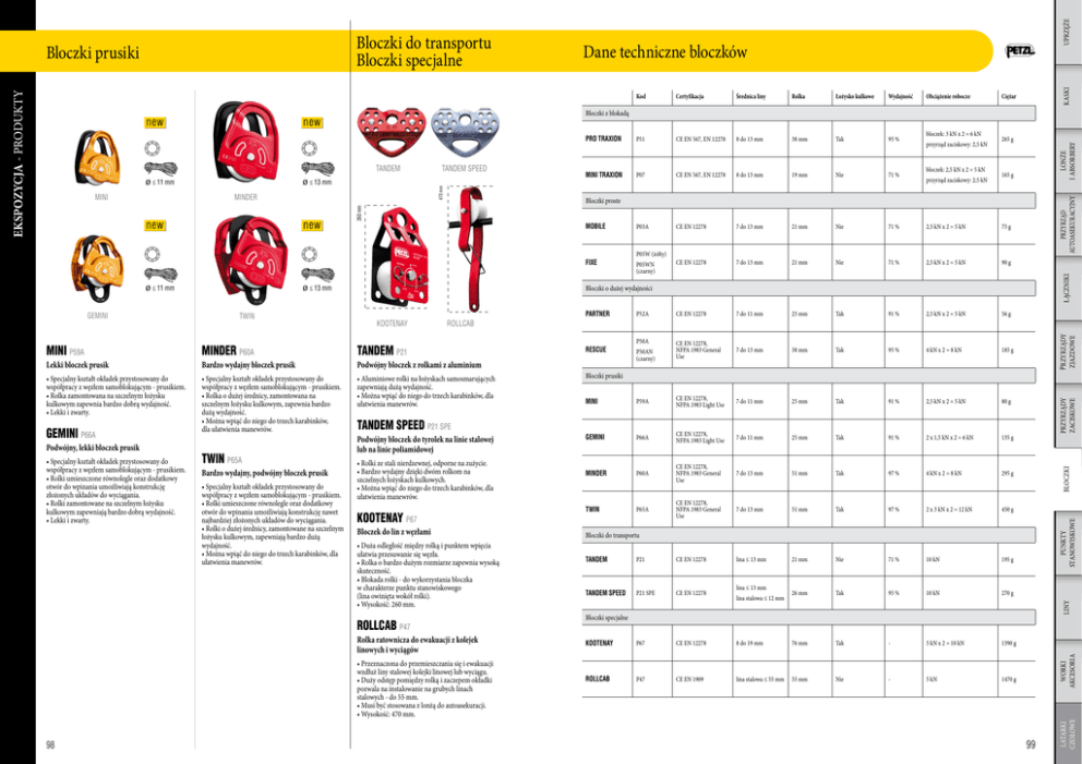 EKSPOZYCJA - PRODUKTY UPRZĘŻE Dane techniczne bloczków Kod Certyfikacja Średnica liny Rolka Łożysko kulkowe Wydajność Obciążenie robocze PRO TRAXION P51 CE EN 567, EN 12278 8 do 13 mm 38 mm Tak 95 % MINI TRAXION P07 CE EN 567, EN 12278 8 do 13 mm 19 mm Nie 71 % P03A CE EN 12278 7 do 13 mm 21 mm Nie 71 % 2,5 kN x 2 = 5 kN 75 g CE EN 12278 7 do 13 mm 21 mm Nie 71 % 2,5 kN x 2 = 5 kN 90 g P52A CE EN 12278 7 do 11 mm 25 mm Tak 91 % 2,5 kN x 2 = 5 kN 56 g P50A CE EN 12278, NFPA 1983 General Use 7 do 13 mm 38 mm Tak 95 % 4 kN x 2 = 8 kN 185 g KASKI Bloczki do transportu Bloczki specjalne Bloczki prusiki Ciężar Bloczki z blokadą FIXE ø ≤ 13 mm PARTNER ROLLCAB Lekki bloczek prusik Bardzo wydajny bloczek prusik Podwójny bloczek z rolkami z aluminium • Specjalny kształt okładek przystosowany do współpracy z węzłem samoblokującym - prusikiem. • Rolka zamontowana na szczelnym łożysku kulkowym zapewnia bardzo dobrą wydajność. • Lekki i zwarty. • Specjalny kształt okładek przystosowany do współpracy z węzłem samoblokującym - prusikiem. • Rolka o dużej średnicy, zamontowana na szczelnym łożysku kulkowym, zapewnia bardzo dużą wydajność. • Można wpiąć do niego do trzech karabinków, dla ułatwienia manewrów. • Aluminiowe rolki na łożyskach samosmarujących zapewniają dużą wydajność. • Można wpiąć do niego do trzech karabinków, dla ułatwienia manewrów. Podwójny, lekki bloczek prusik • Specjalny kształt okładek przystosowany do współpracy z węzłem samoblokującym - prusikiem. • Rolki umieszczone równolegle oraz dodatkowy otwór do wpinania umożliwiają konstrukcję złożonych układów do wyciągania. • Rolki zamontowane na szczelnym łożysku kulkowym zapewniają bardzo dobrą wydajność. • Lekki i zwarty. TWIN P65A Bardzo wydajny, podwójny bloczek prusik • Specjalny kształt okładek przystosowany do współpracy z węzłem samoblokującym - prusikiem. • Rolki umieszczone równolegle oraz dodatkowy otwór do wpinania umożliwiają konstrukcję nawet najbardziej złożonych układów do wyciągania. • Rolki o dużej średnicy, zamontowane na szczelnym łożysku kulkowym, zapewniają bardzo dużą wydajność. • Można wpiąć do niego do trzech karabinków, dla ułatwienia manewrów. TANDEM SPEED P21 SPE Podwójny bloczek do tyrolek na linie stalowej lub na linie poliamidowej • Rolki ze stali nierdzewnej, odporne na zużycie. • Bardzo wydajny dzięki dwóm rolkom na szczelnych łożyskach kulkowych. • Można wpiąć do niego do trzech karabinków, dla ułatwienia manewrów. KOOTENAY P67 Bloczek do lin z węzłami • Duża odległość między rolką i punktem wpięcia ułatwia przesuwanie się węzła. • Rolka o bardzo dużym rozmiarze zapewnia wysoką skuteczność. • Blokada rolki - do wykorzystania bloczka w charakterze punktu stanowiskowego (lina owinięta wokół rolki). • Wysokość: 260 mm. ROLLCAB P47 Rolka ratownicza do ewakuacji z kolejek linowych i wyciągów • Przeznaczona do przemieszczania się i ewakuacji wzdłuż liny stalowej kolejki linowej lub wyciągu. • Duży odstęp pomiędzy rolką i zaczepem okładki pozwala na instalowanie na grubych linach stalowych - do 55 mm. • Musi być stosowana z lonżą do autoasekuracji. • Wysokość: 470 mm. 98 RESCUE P50AN (czarny) LONŻE I ABSORBERY Bloczki prusiki MINI P59A CE EN 12278, NFPA 1983 Light Use 7 do 11 mm 25 mm Tak 91 % 2,5 kN x 2 = 5 kN 80 g GEMINI P66A CE EN 12278, NFPA 1983 Light Use 7 do 11 mm 25 mm Tak 91 % 2 x 1,5 kN x 2 = 6 kN 135 g MINDER P60A CE EN 12278, NFPA 1983 General Use 7 do 13 mm 51 mm Tak 97 % 4 kN x 2 = 8 kN 295 g TWIN P65A CE EN 12278, NFPA 1983 General Use 7 do 13 mm 51 mm Tak 97 % 2 x 3 kN x 2 = 12 kN 450 g lina ≤ 13 mm 21 mm Nie 71 % 10 kN 195 g 26 mm Tak 95 % 10 kN 270 g PRZYRZĄDY ZACISKOWE TANDEM P21 BLOCZKI MINDER P60A PUNKTY STANOWISKOWE KOOTENAY PRZYRZĄDY ZJAZDOWE Bloczki o dużej wydajności MINI P59A GEMINI P66A P05WN (czarny) Bloczki do transportu TANDEM P21 CE EN 12278 TANDEM SPEED P21 SPE CE EN 12278 KOOTENAY P67 CE EN 12278 8 do 19 mm 76 mm Tak - 5 kN x 2 = 10 kN 1390 g ROLLCAB P47 CE EN 1909 lina stalowa ≤ 55 mm 55 mm Nie - 5 kN 1470 g lina ≤ 13 mm lina stalowa ≤ 12 mm LINY TWIN P05W (żółty) Bloczki specjalne WORKI AKCESORIA GEMINI 165 g Bloczki proste MOBILE ø ≤ 11 mm przyrząd zaciskowy: 2,5 kN ŁĄCZNIKI MINDER bloczek: 2,5 kN x 2 = 5 kN 265 g PRZYRZĄD AUTOASEKURACYJNY 470 mm TANDEM SPEED 260 mm MINI ø ≤ 13 mm przyrząd zaciskowy: 2,5 kN 99 LATARKI CZOŁOWE TANDEM ø ≤ 11 mm bloczek: 3 kN x 2 = 6 kN