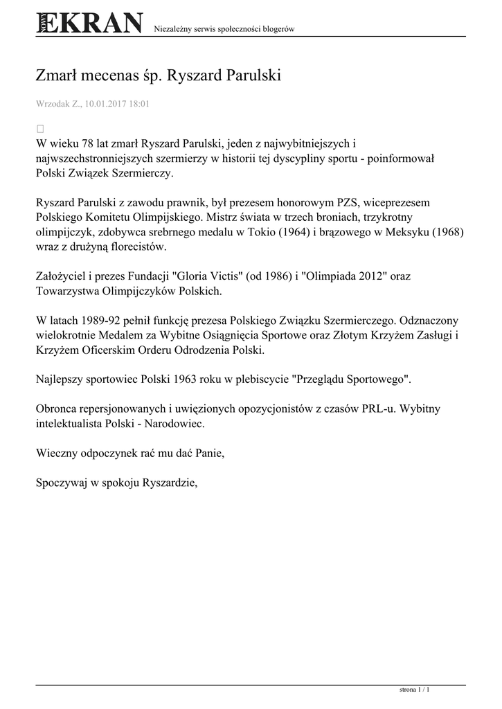 Niezależny serwis społeczności blogerów Zmarł mecenas śp. Ryszard Parulski Wrzodak Z., 10.01.2017 18:01 W wieku 78 lat zmarł Ryszard Parulski, jeden z najwybitniejszych i najwszechstronniejszych szermierzy w historii tej dyscypliny sportu - poinformował Polski Związek Szermierczy. Ryszard Parulski z zawodu prawnik, był prezesem honorowym PZS, wiceprezesem Polskiego Komitetu Olimpijskiego. Mistrz świata w trzech broniach, trzykrotny olimpijczyk, zdobywca srebrnego medalu w Tokio (1964) i brązowego w Meksyku (1968) wraz z drużyną florecistów. Założyciel i prezes Fundacji "Gloria Victis" (od 1986) i "Olimpiada 2012" oraz Towarzystwa Olimpijczyków Polskich. W latach 1989-92 pełnił funkcję prezesa Polskiego Związku Szermierczego. Odznaczony wielokrotnie Medalem za Wybitne Osiągnięcia Sportowe oraz Złotym Krzyżem Zasługi i Krzyżem Oficerskim Orderu Odrodzenia Polski. Najlepszy sportowiec Polski 1963 roku w plebiscycie "Przeglądu Sportowego". Obronca repersjonowanych i uwięzionych opozycjonistów z czasów PRL-u. Wybitny intelektualista Polski - Narodowiec. Wieczny odpoczynek rać mu dać Panie, Spoczywaj w spokoju Ryszardzie, strona 1 / 1 Powered by TCPDF (www.tcpdf.org)
