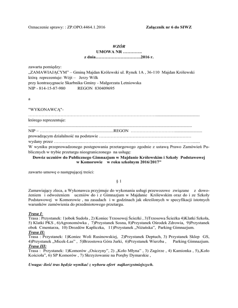 Załącznik nr 6 do SIWZ Oznaczenie sprawy: : ZP.OPO.4464.1.2016 WZÓR UMOWA NR …………. z dnia………………………….2016 r. zawarta pomiędzy: „ZAMAWIAJĄCYM” – Gminą Majdan Królewski ul. Rynek 1A , 36-110 Majdan Królewski którą reprezentuje: Wójt – Jerzy Wilk przy kontrasygnacie Skarbnika Gminy - Małgorzata Letniowska NIP - 814-15-87-980 REGON 830409695 a "WYKONAWCĄ"……………………………………………………………………………........................................ którego reprezentuje: ..................................................................................................................................................... NIP – ………………………………...................REGON …………………………......................... prowadzącym działalność na podstawie ……………………………………………………… wydany przez ………………..…………………………………………………………………....... W wyniku przeprowadzonego postępowania przetargowego zgodnie z ustawą Prawo Zamówień Publicznych w trybie przetargu nieograniczonego na usługę: Dowóz uczniów do Publicznego Gimnazjum w Majdanie Królewskim i Szkoły Podstawowej w Komorowie w roku szkolnym 2016/2017" zawarto umowę o następującej treści: §1 Zamawiający zleca, a Wykonawca przyjmuje do wykonania usługi przewozowe związane z dowożeniem i odwożeniem uczniów do i z Gimnazjum w Majdanie Królewskim oraz do i ze Szkoły Podstawowej w Komorowie , na zasadach i w godzinach jak określonych w specyfikacji istotnych warunków zamówienia do przedmiotowego przetargu. Trasa I: Trasa : Przystanek: 1)obok Sudoła , 2) Koniec Trzosowej Ścieżki , 3)Trzosowa Ścieżka 4)Klatki Szkoła, 5) Klatki PKS , 6)Agronomówka , 7)Przystanek Sosna, 8)Przystanek Ośrodek Zdrowia, 9)Przystanek obok Cmentarza, 10) Drozdów Kapliczka, 11)Przystanek „Niżańska”, Parking Gimnazjum. Trasa II: Trasa : Przystanek: 1)Koniec Woli Rusinowskiej, 2)Przystanek Deptuch, 3) Przystanek Sklep GS, 4)Przystanek „Micek-Las” , 5)Brzostowa Góra Jurki, 6)Przystanek Wierzba , Parking Gimnazjum. Trasa III: Trasa : Przystanek: 1)Komorów „Osiczyny”, 2) „Koło Młyna” , 3) Zagórze , 4) Kamionka , 5)„Koło Kościoła”, 6) SP Komorów , 7) Skrzyżowanie na Poręby Dymarskie , Uwaga: ilość tras będzie wynikać z wyboru ofert najkorzystniejszych. §2 Termin realizacji przedmiotu umowy: Rok szkolny 2016/2017 tj. od 01.09.2016r. do 30.06.2017 r. w dni nauki w szkole i inne wydarzenia szkolne. §3 1. Zleceniobiorca będzie wykonywał przedmiot umowy z zachowaniem szczególnych wymogów dotyczących warunków higieny i bezpieczeństwa przewożonych osób, ponadto: - w czasie wsiadania , wysiadania i realizacji przewozu Wykonawca zapewni bezpieczeństwo uczniów , - na czas realizacji przewozów Wykonawca zapewni sprawowanie opieki nad przewożonymi uczniami poprzez zatrudnienie opiekuna. 2. Wykonawca dokona ubezpieczenia przewożonych uczniów w zakresie odpowiedzialności cywilnej. 3. Usługi świadczone będą autobusami Wykonawcy sprawnymi technicznie, posiadającymi ważne badania techniczne oraz w okresie zimowym sprawnym i stosowanym ogrzewaniem. §4 1. Niniejsza umowa wchodzi w życie z dniem 1 września 2016 r. i obowiązuje do dnia 30 czerwca 2017r. 2. Zamawiający ma prawo rozwiązać niniejszą umowę za dwutygodniowym okresem wypowiedzenia w przypadku nienależytego wykonania przedmiotu umowy przez Wykonawcę, po uprzednim dwukrotnym, pisemnym upomnieniu wystosowanym przez Zamawiającego dotyczącym nienależytego wykonania przedmiotu umowy. §5 1. Strony ustalają, że obowiązującą je formą wynagrodzenia za wykonanie usługi , o której mowa w § 1 niniejszej umowy, będzie wynagrodzenie ryczałtowe brutto zawierające obowiązujący podatek VAT; za wykonanie przewozów w jednym dniu, tj. w wysokości Trasa 1 ……………. zł brutto słownie:………………………………………………… Trasa 1 ……………. zł brutto słownie:………………………………………………… Trasa 1 ……………. zł brutto słownie:………………………………………………… 2. Płatność za wykonane usługi będzie realizowana w okresach miesięcznych za okres jednego miesiąca , przelewem na podstawie wystawionego rachunku , w terminie 14 dni od daty jego wpływu do Zamawiającego na rachunek bankowy Wykonawcy o numerze …………………………… w banku …………………………………………………… 3. Faktury za usługę będą wystawiane na Gmina Majdan Królewski ul. Rynek 1a, 36-110 Majdan Królewski, NIP 814-15-87-980. 4. Faktury za wykonane usługi dowozowe winny być potwierdzone przez dyrektorów szkół do których dowożeni są uczniowie. §6 1. W przypadku odstąpienia przez Wykonawcę od umowy zapłaci on Zamawiającemu karę umowną w wysokości 5000 zł. Za każdą trasę. 2. W przypadku przewozu uczniów z opóźnieniem ponad 90 min z przyczyn leżących po stronie Wykonawcy, Wykonawca zapłaci karę w wysokości 50 % wynagrodzenia określonego w § 5 punk 1 § 7. 1. Zamawiający przewiduje możliwość dokonania zmiany zawartej umowy w przypadku zmiany trasy dowozu lub zmiany ilości dowożonych uczniów, powodującej możliwość lub konieczność zmiany pojazdu na mniejszy typu BUS lub większy typu Autobus. 2. W przypadku powierzenie realizacji przedmiotu umowy podwykonawcy, Wykonawca zobowiązany jest : a. Niezwłocznie po zawarciu umowy przekazać Zamawiającemu nazwę firm, adresy i telefony kontaktowe podwykonawców realizujących dowóz na poszczególnych trasach. b. Do każdej faktury miesięcznej złożyć oświadczenie podwykonawców na zgodę zapłaty należnego im wynagrodzenia przez Wykonawcę lub przedstawi stosowne cesje na bezpośrednią zapłatę dla podwykonawców przez zamawiającego. § 8. 1. W razie powsta