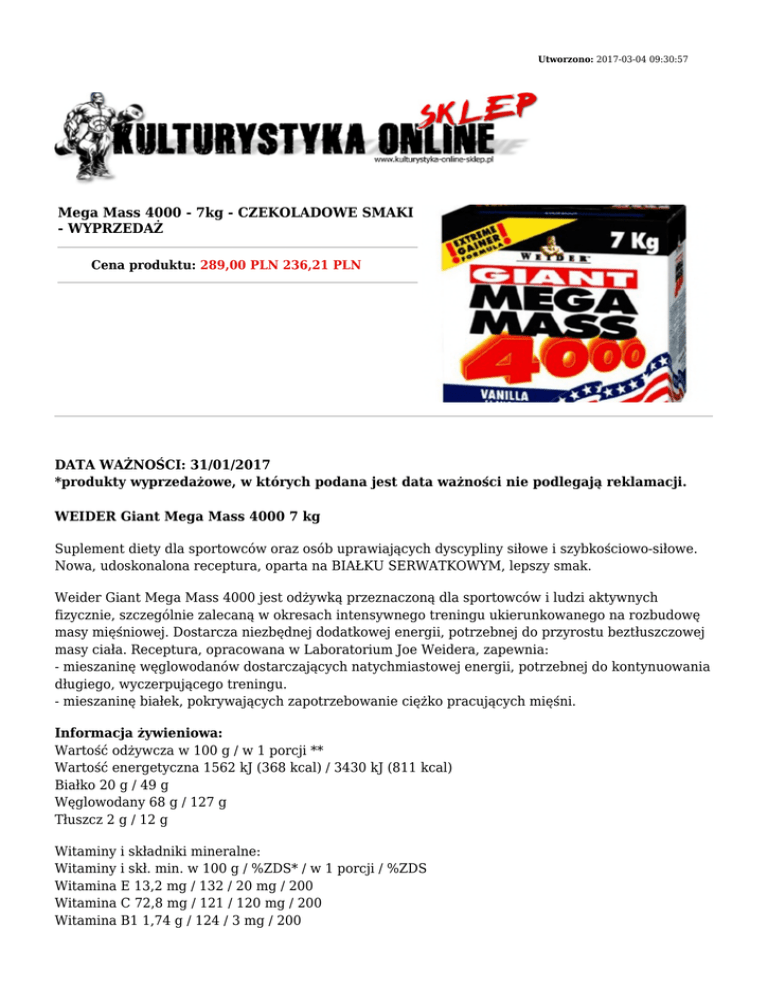 Utworzono: 2017-03-04 09:30:57 Mega Mass 4000 - 7kg - CZEKOLADOWE SMAKI - WYPRZEDAŻ Cena produktu: 289,00 PLN 236,21 PLN DATA WAŻNOŚCI: 31/01/2017 *produkty wyprzedażowe, w których podana jest data ważności nie podlegają reklamacji. WEIDER Giant Mega Mass 4000 7 kg Suplement diety dla sportowców oraz osób uprawiających dyscypliny siłowe i szybkościowo-siłowe. Nowa, udoskonalona receptura, oparta na BIAŁKU SERWATKOWYM, lepszy smak. Weider Giant Mega Mass 4000 jest odżywką przeznaczoną dla sportowców i ludzi aktywnych fizycznie, szczególnie zalecaną w okresach intensywnego treningu ukierunkowanego na rozbudowę masy mięśniowej. Dostarcza niezbędnej dodatkowej energii, potrzebnej do przyrostu beztłuszczowej masy ciała. Receptura, opracowana w Laboratorium Joe Weidera, zapewnia: - mieszaninę węglowodanów dostarczających natychmiastowej energii, potrzebnej do kontynuowania długiego, wyczerpującego treningu. - mieszaninę białek, pokrywających zapotrzebowanie ciężko pracujących mięśni. Informacja żywieniowa: Wartość odżywcza w 100 g / w 1 porcji ** Wartość energetyczna 1562 kJ (368 kcal) / 3430 kJ (811 kcal) Białko 20 g / 49 g Węglowodany 68 g / 127 g Tłuszcz 2 g / 12 g Witaminy i składniki mineralne: Witaminy i skł. min. w 100 g / %ZDS* / w 1 porcji / %ZDS Witamina E 13,2 mg / 132 / 20 mg / 200 Witamina C 72,8 mg / 121 / 120 mg / 200 Witamina B1 1,74 g / 124 / 3 mg / 200 Witamina B2 1,47 mg / 92 / 3 mg / 200 Niacyna 23,7 mg / 132 / 36 mg / 200 Witamina B6 2,5 mg / 125 / 4 mg / 200 Folacyna 248 mcg / 124 / 400 mcg / 200 Witamina B12 1 mg / 100 / 4 mcg / 381 Biotyna 200 mcg / 133 / 300 mcg / 200 Kwas pantotenowy 6,7 mg / 112 / 12 mg / 200 Wapń 305 mg / 38 / 1118 mg / 140 Fosfor 250 mg / 31 / 870 mg / 109 Żelazo 9,2 mg / 66 / 14 mg / 100 Cynk 8,6 mg / 57 / 15 mg / 100 Jod 89 mcg / 59 / 150 mcg / 100 *- Zalecane dzienne spożycie wg Ministerstwa Zdrowia (23.12.2002) ** - 150 g proszku wymieszane z 550 ml półtłustego mleka (1,5% tł.) Profil aminokwasowy: Aminokwas w 100 g białka / aminokwas w 100 g białka Histydyna* 2,1 g / Cysteina 1,6 g Izoleucyna* 5,8 g / Tyrozyna 3,7 g Leucyna* 10,0 g / Alanina 4,3 g Lizyna* 8,8 g / Arginina 1,5 g Metionina* 2,6 g / Walina* 6,1 g Fenyloalanina* 3,8 g / Glicyna 1,6 g Treonina* 5,7 g / Prolina 7,1 g Tryptofan* 1,4 g / Seryna 4,9 g Kwas asparaginowy 9,5 g Kwas glutaminowy / 19,5 g * - aminokwasy niezbędne Składniki: dekstroza, koncentrat białka serwatki , maltodekstryna, sproszkowana serwatka, izobat białka mlecznego, fruktoza, aromat, olej roślinny, albumina jaja, lecytyna sojowa (emulgator), beta-karoten (barwnik), witaminy [witamina E, witamina C, witamina B1, witamina B2, niacyna, witamina B6, folacyna, biotyna, kwas pantotenowy], składniki mineralne [trójfosforan żelazowy, tlenek cynku, jodek sodu]. Produkt zawiera co najmniej 4% laktozy. Ilość Adres: http://www.ko.sklep.pl/ - Telefon: kom. 782 010 880 Email: [email protected]