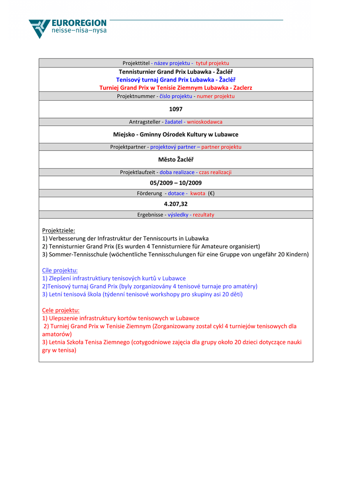 Projekttitel - název projektu - tytuł projektu Tennisturnier Grand Prix Lubawka - Žacléř Tenisový turnaj Grand Prix Lubawka - Žacléř Turniej Grand Prix w Tenisie Ziemnym Lubawka - Zaclerz Projektnummer - číslo projektu - numer projektu 1097 Antragsteller - žadatel - wnioskodawca Miejsko - Gminny Ośrodek Kultury w Lubawce Projektpartner - projektový partner – partner projektu Město Žacléř Projektlaufzeit - doba realizace - czas realizacji 05/2009 – 10/2009 Förderung - dotace - kwota (€) 4.207,32 Ergebnisse - výsledky - rezultaty Projektziele: 1) Verbesserung der Infrastruktur der Tenniscourts in Lubawka 2) Tennisturnier Grand Prix (Es wurden 4 Tennisturniere für Amateure organisiert) 3) Sommer-Tennisschule (wöchentliche Tennisschulungen für eine Gruppe von ungefähr 20 Kindern) Cíle projektu: 1) Zlepšení infrastruktiury tenisových kurtů v Lubawce 2)Tenisový turnaj Grand Prix (byly zorganizovány 4 tenisové turnaje pro amatéry) 3) Letní tenisová škola (týdenní tenisové workshopy pro skupiny asi 20 dětí) Cele projektu: 1) Ulepszenie infrastruktury kortów tenisowych w Lubawce 2) Turniej Grand Prix w Tenisie Ziemnym (Zorganizowany został cykl 4 turniejów tenisowych dla amatorów) 3) Letnia Szkoła Tenisa Ziemnego (cotygodniowe zajęcia dla grupy około 20 dzieci dotyczące nauki gry w tenisa)