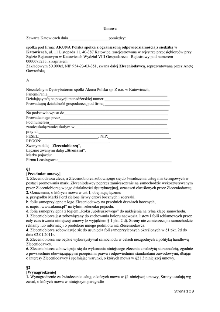 Umowa Zawarta Katowicach dnia____________________pomiędzy: spółką pod firmą: AKUNA Polska spółka z ograniczoną odpowiedzialnością z siedzibą w Katowicach, ul. 11 Listopada 11, 40-387 Katowice, zarejestrowana w rejestrze przedsiębiorców przy Sądzie Rejonowym w Katowicach Wydział VIII Gospodarczo - Rejestrowy pod numerem 0000075235, z kapitałem Zakładowym 50.000zł, NIP 954-23-03-351, zwana dalej Zleceniodawcą, reprezentowaną przez Anetę Gawrońską A NiezaleŜnym Dystrybutorem spółki Akuna Polska sp. Z o.o. w Katowicach, Panem/Panią___________________________________________________________ Działającym/ą na pozycji menadŜerskiej numer:________________________________ Prowadzącą działalność gospodarczą pod firmą:________________________________ ______________________________________________________________________ Na podstawie wpisu do___________________________________________________ Prowadzonego przez_____________________________________________________ Pod numerem__________________________________________________________ zamieszkałą/zamieszkałym w______________________________________________ przy ul.________________________________________________________________ PESEL:_____________________________, NIP:_______________________________ REGON:_________________________________, Zwanym dalej „Zleceniobiorcą“, Łącznie zwanymi dalej „Stronami“. Marka pojazdu:___________________________________________________________ Firma Leasingowa:________________________________________________________ §1 [Przedmiot umowy] 1. Zleceniodawca zleca, a Zleceniobiorca zobowiązuje się do świadczenia usług marketingowych w postaci promowania marki Zleceniodawcy poprzez zamieszczenie na samochodzie wykorzystywanym przez Zleceniobiorcę w jego działalności dystrybucyjnej, oznaczeń określonych przez Zleceniodawcę. 2. Oznaczenia, o których mowa w ust.1, obejmują łącznie: a. przypadku Marki Ford zielone listwy drzwi bocznych i zderzaki, b. folie samoprzylepne z logo Zleceniodawcy na przednich drzwiach bocznych, c. napis „www.akuna.pl” na tylnim zderzaku pojazdu. d. folia samoprzylepna z logiem „Roku Jubileuszowego” do naklejenia na tylna klapę samochodu. 3. Zleceniobiorca jest zobowiązany do zachowania koloru nadwozia, listew i folii reklamowych przez cały czas trwania niniejszej umowy (z wyjątkiem § 1 pkt. 2 d). Strony nie zamieszczą na samochodzie reklamy lub informacji o produkcie innego podmiotu niŜ Zleceniodawca. 4. Zleceniobiorca zobowiązuje się do usunięcia foli samoprzylepnych określonych w §1 pkt. 2d do dnia 02.01.2011r. 5. Zleceniobiorca nie będzie wykorzystywał samochodu w celach niezgodnych z polityką handlową Zleceniodawcy. 6. Zleceniobiorca zobowiązuje się do wykonania niniejszego zlecenia z naleŜytą starannością, zgodnie z powszechnie obowiązującymi przepisami prawa i odpowiednimi standardami zawodowymi, dbając o interesy Zleceniodawcy i spełniając warunki, o których mowa w §2 i 3 niniejszej umowy. §2 [Wynagrodzenie] 1. Wynagrodzenie za świadczenie usług, o których mowa w §1 niniejszej umowy, Strony ustalają wg zasad, o których mowa w niniejszym paragrafie Strona 1 z 3 2. Dla uzyskania wynagrodzenia konieczne jest spełnienie wszystkich poniŜszych warunków: a. podpisanie niniejszej umowy do dnia 31 grudnia 2010 roku; b. Kwalifikacja osobista (miesięczna) Zleceniobiorcy; c. Spełnienie warunków określonych w module Akuna Builder. W zaleŜności od rozmiarów posiadanej organizacji , wyróŜniamy trzy poziomy tego modułu : - Junior Builder - Senior Builder - Power Builder 3. Wysokość wynagrodzenia Zleceniobiorcy zaleŜna jest od wielkości organizacji miernikiem czego jest generowany przez nią obrót punktowy. Szczegółowe wartości wynagrodzenia określone są w Programie Benefit na dany rok. 4. Poza wynagrodzeniem określonym w punkcie 3 Zleceniobiorcy moŜe przysługiwać dodatkowe wynagrodzenie w kwocie netto odpowiadającej wartości początkowej leasingowanego samochodu, po spełnieniu warunków określonych w module Akuna Builder. Szczegółowe wartości wynagrodzenia określone są w Programie Benefit na dany rok. 5. Wynagrodzenie płatne jest na podstawie rachunku lub faktury VAT wystawionej przez Zleceniobiorcę. Wynagrodzenie płatne jest przelewem na rachunek bankowy wskazany przez Zleceniobiorcę, w terminie do końca miesiąca kalendarzowego następnego po miesiącu, którego dotyczy wykonywanie usługi. Dofinansowanie do opłaty wstępnej i dofinansowanie do raty leasingowej , o których mowa w §2 ust. 3,4 nie moŜe być łączone w ramach jednego miesiąca. 6. W przypadku kradzieŜy, kasacji samochodu, lub innych sytuacji, które powodują rozwiązanie umowy Leasingowej Zleceniobiorca zobowiązany jest do niezwłocznego poinformowania Zleceniodawcy o tym fakcie. Zleceniodawca ma prawo do zwrotu niesłusznie wypłaconego dofinansowania wraz z odsetkami ustawowymi. 7. W przypadku zdarzeń, o których mowa w §2 ust.6 dofinansowanie uznane jest za niesłuszne licząc od następnego miesiąca po miesiącu zaistnienia zdarzenia. §3 [Dodatkowe postanowienia umowne] 1. Zleceniobiorcą moŜe być kaŜdy współpracujący ze Zleceniodawcą podmiot gospodarczy posiadający w dniu podpisania niniejszej umowy pozycję „Lider“ lub wyŜszą, w punkcie menadŜerskim którego dotyczy niniejsza promocja. W czasie swojej dotychczasowej współpracy z Firmą Akuna Polska Sp. z o.o. nie świadczył usług marketingowych w postaci promowania marki Zleceniodawcy poprzez zamieszczenie na samochodzie oznaczeń określonych przez Zleceniodawcę, które wynikają z Umowy. 2. Oznaczenia, o których mowa w § 1 mogą być naniesione wyłącznie na fabrycznie nowym samochodzie marki Ford, Volvo, Subaru, BMW, Land Rover, Jaguar w kolorze białym lub srebrnym dla pozycji Junior i Senior Builder oraz białym , srebrnym lub czarnym dla pozycji Power Builder. Oznaczenia, o których mowa w § 1 mogą 
