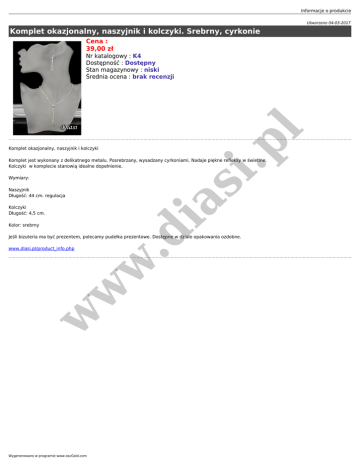 Informacje o produkcie Utworzono 04-03-2017 Komplet okazjonalny, naszyjnik i kolczyki. Srebrny, cyrkonie Cena : 39,00 zł Komplet okazjonalny, naszyjnik i kolczyki si .p l Nr katalogowy : K4 Dostępność : Dostępny Stan magazynowy : niski Średnia ocena : brak recenzji Komplet jest wykonany z delikatnego metalu. Posrebrzany, wysadzany cyrkoniami. Nadaje piękne refleksy w świetlne. Kolczyki w komplecie stanowią idealne dopełnienie. Wymiary: ia Naszyjnik Długość: 44 cm. regulacja Kolczyki Długość: 4,5 cm. w .d Kolor: srebrny Jeśli bizuteria ma być prezentem, polecamy pudełka prezentowe. Dostępne w dziale opakowania ozdobne. w w www.diasi.pl/product_info.php Wygenerowano w programie www.oscGold.com