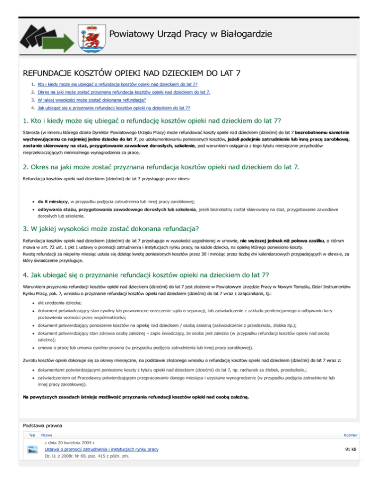 Powiatowy Urząd Pracy w Białogardzie REFUNDACJE KOSZTÓW OPIEKI NAD DZIECKIEM DO LAT 7 1. Kto i kiedy może się ubiegać o refundację kosztów opieki nad dzieckiem do lat 7? 2. Okres na jaki może zostać przyznana refundacja kosztów opieki nad dzieckiem do lat 7. 3. W jakiej wysokości może zostać dokonana refundacja? 4. Jak ubiegać się o przyznanie refundacji kosztów opieki na dzieckiem do lat 7? 1. Kto i kiedy może się ubiegać o refundację kosztów opieki nad dzieckiem do lat 7? Starosta (w imieniu którego działa Dyrektor Powiatowego Urzędu Pracy) może refundować koszty opieki nad dzieckiem (dziećmi) do lat 7 bezrobotnemu samotnie wychowującemu co najmniej jedno dziecko do lat 7, po udokumentowaniu poniesionych kosztów, jeżeli podejmie zatrudnienie lub inną pracę zarobkową, zostanie skierowany na staż, przygotowanie zawodowe dorosłych, szkolenie, pod warunkiem osiągania z tego tytułu miesięcznie przychodów nieprzekraczających minimalnego wynagrodzenia za pracę. 2. Okres na jaki może zostać przyznana refundacja kosztów opieki nad dzieckiem do lat 7. Refundacja kosztów opieki nad dzieckiem (dziećmi) do lat 7 przysługuje przez okres: do 6 miesięcy, w przypadku podjęcia zatrudnienia lub innej pracy zarobkowej; odbywania stażu, przygotowania zawodowego dorosłych lub szkolenia, jeżeli bezrobotny został skierowany na staż, przygotowanie zawodowe dorosłych lub szkolenie. 3. W jakiej wysokości może zostać dokonana refundacja? Refundacja kosztów opieki nad dzieckiem (dziećmi) do lat 7 przysługuje w wysokości uzgodnionej w umowie, nie wyższej jednak niż połowa zasiłku, o którym mowa w art. 72 ust. 1 pkt 1 ustawy o promocji zatrudnienia i instytucjach rynku pracy, na każde dziecko, na opiekę którego poniesiono koszty. Kwotę refundacji za niepełny miesiąc ustala się dzieląc kwotę poniesionych kosztów przez 30 i mnożąc przez liczbę dni kalendarzowych przypadających w okresie, za który świadczenie przysługuje. 4. Jak ubiegać się o przyznanie refundacji kosztów opieki na dzieckiem do lat 7? Warunkiem przyznania refundacji kosztów opieki nad dzieckiem (dziećmi) do lat 7 jest złożenie w Powiatowym Urzędzie Pracy w Nowym Tomyślu, Dział Instrumentów Rynku Pracy, pok. 7, wniosku o przyznanie refundacji kosztów opieki nad dzieckiem (dziećmi) do lat 7 wraz z załącznikami, tj.: akt urodzenia dziecka; dokument poświadczający stan cywilny lub prawomocne orzeczenie sądu o separacji, lub zaświadczenie z zakładu penitencjarnego o odbywaniu kary pozbawienia wolności przez współmałżonka; dokument potwierdzający ponoszenie kosztów na opiekę nad dzieckiem / osobą zależną (zaświadczenie z przedszkola, żłobka itp.); dokument potwierdzający stan zdrowia osoby zależnej – zapis świadczący, że osoba jest zależna (w przypadku refundacji kosztów opieki nad osobą zależną); umowa o pracę lub umowa cywilno-prawna (w przypadku podjęcia zatrudnienia lub innej pracy zarobkowej). Zwrotu kosztów opieki dokonuje się za okresy miesięczne, na podstawie złożonego wniosku o refundację kosztów opieki nad dzieckiem (dziećmi) do lat 7 wraz z: dokumentami potwierdzającymi poniesione koszty z tytułu opieki nad dzieckiem (dziećmi) do lat 7, np. rachunek za żłobek, przedszkole.; zaświadczeniem od Pracodawcy potwierdzającym przepracowanie danego miesiąca i uzyskane wynagrodzenie (w przypadku podjęcia zatrudnienia lub innej pracy zarobkowej). Na powyższych zasadach istnieje możliwość przyznania refundacji kosztów opieki nad osobą zależną. Podstawa prawna Typ Nazwa z dnia 20 kwietnia 2004 r. Ustawa o promocji zatrudnienia i instytucjach rynku pracy Dz. U. z 2008r. Nr 69, poz. 415 z późn. zm. Rozmiar 91 kB