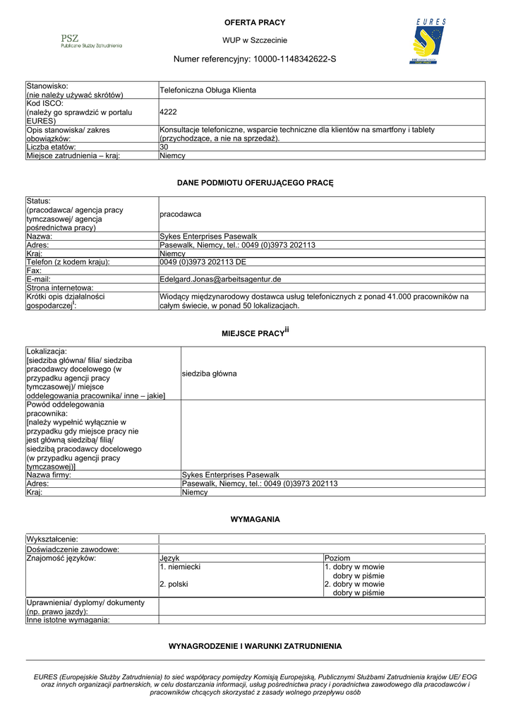 OFERTA PRACY WUP w Szczecinie Numer referencyjny: 10000-1148342622-S Stanowisko: (nie należy używać skrótów) Kod ISCO: (należy go sprawdzić w portalu EURES) Opis stanowiska/ zakres obowiązków: Liczba etatów: Miejsce zatrudnienia – kraj: Telefoniczna Obługa Klienta 4222 Konsultacje telefoniczne, wsparcie techniczne dla klientów na smartfony i tablety (przychodzące, a nie na sprzedaż). 30 Niemcy DANE PODMIOTU OFERUJĄCEGO PRACĘ Status: (pracodawca/ agencja pracy tymczasowej/ agencja pośrednictwa pracy) Nazwa: Adres: Kraj: Telefon (z kodem kraju): Fax: E-mail: Strona internetowa: Krótki opis działalności gospodarczeji: pracodawca Sykes Enterprises Pasewalk Pasewalk, Niemcy, tel.: 0049 (0)3973 202113 Niemcy 0049 (0)3973 202113 DE [email protected] Wiodący międzynarodowy dostawca usług telefonicznych z ponad 41.000 pracowników na całym świecie, w ponad 50 lokalizacjach. MIEJSCE PRACYii Lokalizacja: [siedziba główna/ filia/ siedziba pracodawcy docelowego (w przypadku agencji pracy tymczasowej)/ miejsce oddelegowania pracownika/ inne – jakie] Powód oddelegowania pracownika: [należy wypełnić wyłącznie w przypadku gdy miejsce pracy nie jest główną siedzibą/ filią/ siedzibą pracodawcy docelowego (w przypadku agencji pracy tymczasowej)] Nazwa firmy: Adres: Kraj: siedziba główna Sykes Enterprises Pasewalk Pasewalk, Niemcy, tel.: 0049 (0)3973 202113 Niemcy WYMAGANIA Wykształcenie: Doświadczenie zawodowe: Znajomość języków: Język 1. niemiecki 2. polski Poziom 1. dobry w mowie dobry w piśmie 2. dobry w mowie dobry w piśmie Uprawnienia/ dyplomy/ dokumenty (np. prawo jazdy): Inne istotne wymagania: WYNAGRODZENIE I WARUNKI ZATRUDNIENIA EURES (Europejskie Służby Zatrudnienia) to sieć współpracy pomiędzy Komisją Europejską, Publicznymi Służbami Zatrudnienia krajów UE/ EOG oraz innych organizacji partnerskich, w celu dostarczania informacji, usług pośrednictwa pracy i poradnictwa zawodowego dla pracodawców i pracowników chcących skorzystać z zasady wolnego przepływu osób Wysokość pensji brutto: Wysokość pensji netto: Waluta, w jakiej wypłacana jest pensja: Rodzaj stawki wynagrodzenia: (godzinowa/ tygodniowa/ miesięczna/ roczna/ inna) Premie: Dodatkowe świadczenia (zakwaterowanie, wyżywienie, koszty związane ze zmianą miejsca zamieszkania, koszty podróży itp.): Nazwa firmy, z którą zostanie podpisana umowa: Rodzaj umowy: (umowa o pracę, umowa zlecenia, wolontariat, praktyka zawodowa/ staż, praca zdalna, agencja pracy tymczasowej, inne): Wymiar czasu pracy (praca na pełen etat/ część etatu): Czas trwania umowy: (nieokreślony/ określony) 8,50 Liczba godzin tygodniowo: Zmiany i praca w dni wolne: Data rozpoczęcia: Inne informacje: 40,00 Praca 3 zmianowa (zakres od 7:00 do 23:00), również w weekendy. 2016-11-28 Praca na pełen etat. Euro Czasowy ze stawką godzinową Sykes Enterprises Pasewalk umowa o pracę Praca na pełen etat nieokreślony Data wygaśnięcia umowy (w przypadku umowy na czas określony): SPOSÓB SKŁADANIA WNIOSKU Wymagane dokumenty (list motywacyjny, CV itp.): Język, w którym muszą być sporządzone przedkładane dokumenty: Do kogo należy wysłać dokumenty: (do pracodawcy/ doradcy EURES) Gdzie należy wysłać dokumenty: (adres, adres e-mail, nr faksu z kodem kraju itp.) Dane teleadresowe doradcy EURES lub przedstawiciela pracodawcy: (nazwisko, adres, telefon, fax, e-mail itp.) list motywacyjny, CV angielski polski do pracodawcy email [email protected] DODATKOWE INFORMACJE WAŻNOŚĆ 2016-11-28 Data publikacji: Termin przedkładania podań o pracę / 2017-11-28 zakończenia ważności oferty: Uprzejmie informujemy, że skontaktujemy się wyłącznie z wybranymi kandydatami. UWAGA: 1. Umowa z zagranicznym pracodawcą jest zawierana, co do zasady, zgodnie z prawem kraju zatrudnienia. Oznacza to, że wszystkie roszczenia odnośnie warunków, które obejmuje umowa, można kierować wyłącznie do odpowiedniego sądu w kraju zatrudnienia. Publiczne służby zatrudnienia (EURES) nie mogą pośredniczyć ani reprezentować pracownika w sądzie kraju zatrudnienia w przypadku sporu z pracodawcą. 2. Publiczne służby zatrudnienia (EURES) dokładają wszelkich starań, aby zapewnić rzetelność i wiarygodność ofert pracy zgłoszonych w lokalnym urzędzie pracy. Należy wyjaśnić, że oferta pracy została zgłoszona przez stronę trzecią i EURES nie odpowiada za ewentualne rozbieżności między warunkami pracy określonymi w ofercie pracy i warunkami oferowanymi przez potencjalnego pracodawcę. 3. Publiczne służby zatrudnienia (EURES) informują, że będą zbierać, przetwarzać i przekazywać potencjalnym pracodawcom zgodnie z przepisami dotyczącymi ochrony danych osobowych wszystkie dane osobowe dostarczone przez osoby poszukujące pracy. iInformacje o firmie, takie jak: status prawny, sektor, typ działalności, rodzaj produktów lub świadczonych usług, data rozpoczęcia działalności gospodarczej, liczba pracowników itp. EURES (Europejskie Służby Zatrudnienia) to sieć współpracy pomiędzy Komisją Europejską, Publicznymi Służbami Zatrudnienia krajów UE/ EOG oraz innych organizacji partnerskich, w celu dostarczania informacji, usług pośrednictwa pracy i poradnictwa zawodowego dla pracodawców i pracowników chcących skorzystać z zasady wolnego przepływu osób iiMiejsce, w którym będzie wykonywana praca. Należy wypełnić w przypadku gdy: 1) miejsce wykonywania pracy jest inne niż siedziba podmiotu oferującego pracę, 2) pracę oferuje agencja pośrednictwa pracy/ agencja pracy tymczasowej. EURES (Europejskie Służby Zatrudnienia) to sieć współpracy pomiędzy Komisją Europejską, Publicznymi Służbami Zatrudnienia krajów UE/ EOG oraz innych organizacji partnerskich, w celu dostarczania informacji, usług pośrednictwa pracy i poradnictwa zawodowego dla pracodawców i pracowników chcących skorzystać z zasady wolnego przepływu osób