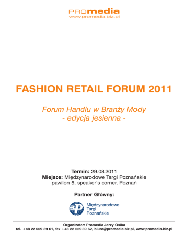 FASHION RETAIL FORUM 2011 Forum Handlu w Bran˝y Mody - edycja jesienna - Termin: 29.08.2011 Miejsce: Mi´dzynarodowe Targi Poznaƒskie pawilon 5, speaker’s corner, Poznaƒ Partner G∏ówny: Organizator: Promedia Jerzy Osika tel. +48 22 559 39 61, fax +48 22 559 39 62, [email protected], www.promedia.biz.pl Agenda Forum Od godz. Temat Wyk∏adowca 12:00 Facebook, czyli moda na social. Micha∏ WiÊniewski, Facebook NOW 13:00 Jak wykorzystaç mark´ w sklepach wielomarkowych? Tomasz Zgliczyƒski – Cuber, Stratec 14:00 Jak sobie radziç z obiekcjami klientów? Jerzy Osika, Promedia 14:30 Przerwa 15:00 Sposoby prezentacji produktów w mailingach z bran˝y odzie˝owej: Jak oczarowaç odbiorc´ i maksymalizowaç konwersj´? Maciej Górski, GetResponse 16:00 Transakcje handlowe i odpowiedzialnoÊç za ich prawid∏owe wykonanie. Kinga Jaêwicka, Kancelaria Prawna Integra Legis Uwaga: Organizator zastrzega sobie prawo do zmiany agendy. Wi´cej informacji na www.promedia.biz.pl. Poznaƒ, Mi´dzynarodowe Targi Poznaƒskie | 29.08.2011 | Fashion Retail Forum 2011 Temat prelekcji: Facebook, czyli moda na social. Zakres prelekcji: - Pokazanie bran˝y modowej na FB, case study. - Szanse i zagro˝enia. - Jak zdobywaç fanów? - Czy drzwi mogà byç modne? - Facebook w liczbach. Prelegent: Micha∏ WiÊniewski Senior Account Executive, ARBOinteractive – Facebook NOW. Z grupà ARBOinteractive zwiàzany od stycznia 2010 roku. Jako Senior Account Executive w dziale Facebook NOW, odpowiada za planowanie i realizacj´ dzia∏aƒ klientów bezpoÊrednich oraz agencji interaktywnych na serwisie Facebook. Specjalizuje si´ w know how dotyczàcym Facebooka oraz wprowadzaniu na serwis nowych klientów. Uczestnik i prelegent podczas spotkaƒ bran˝owych poÊwi´conych social mediom, m.in. szkoleƒ, konferencji i cyklicznych warsztatów Facebook NOW. Autor wypowiedzi eksperckich z zakresu wykorzystania spo∏ecznoÊci w dzia∏aniach marketingowych, m.in. dla Media i Marketing Polska, Marketer Plus czy tygodnika Wprost. Prywatnie od 10 lat zajmuje si´ produkcjà muzyki. Jest fanem czeskiej literatury pi´knej, architektury Europy Ârodkowej, niepasteryzowanego piwa i fotografii. Z za∏o˝enia si´ nie stresuje, a wszelkie absurdalne sytuacje t∏umaczy sobie s∏owami Bohumila Hrabala: „Kto ˝yje w Europie Ârodkowej nie mo˝e byç trzeêwy”. Firma: Facebook NOW Facebook NOW to dzia∏ sprzeda˝y serwisu Facebook – najwi´kszego serwisu spo∏ecznoÊciowego na Êwiecie. ARBOinteractive, jako strategiczny partner reklamowy Facebooka w Europie Ârodkowo – Wschodniej, odpowiada za sprzeda˝ i obs∏ug´ powierzchni reklamowej Facebooka dla agencji i kluczowych klientów w Polsce i Czechach. Facebook NOW jest odpowiedzialny tak˝e za promocj´ marketingu spo∏ecznoÊciowego i reklamy anga˝ujàcej na tutejszych rynkach. Facebook NOW stanowi cz´Êç ARBOinteractive – grupy dzia∏ajàcej w obszarze internetu i nowych mediów, specjalizujàcej si´ przede wszystkim w reklamie internetowej. ARBOinteractive rozwija komórki dedykowane poszczególnym formom marketingu online, jak reklama display, reklama behawioralna, wideo online, kampanie SEM, dzia∏ania w spo∏ecznoÊciach, reklama w grach, czy kreacja internetowa. Polski oddzia∏ ARBOinteractive, poza Facebook NOW, obejmuje: ARBOnetwork (sieç reklamy ogólnotematycznej), BizOn media (sieç reklamy biznesowej), V2Media (sieç reklamy wideo), sieç behavia (sieç reklamy behawioralnej), LOGICSEARCH (agencja zaawansowanych kampanii SEM), SmartContext (system reklamy intekstowej), AdAhead (agencja niestandardowych mediów interaktywnych), AdKing (agencja interaktywna) oraz NewMedia Labs (inkubator pomys∏ów internetowych). Poznaƒ, Mi´dzynarodowe Targi Poznaƒskie | 29.08.2011 | Fashion Retail Forum 2011 Temat prelekcji: Jak wykorzystaç mark´ w sklepach wielomarkowych? Zakres prelekcji: Ka˝dy w∏aÊciciel sklepu wie, ˝e lokalizacja decyduje o tym, jacy klienci do niego przyjdà. Takie samo dzia∏anie ma portfel oferowanych marek. Dobrze skonstruowany portfel marek przyciàga w∏aÊciwych klientów, pomagajàc w kierowaniu oferty do tych obszarów rynku, na których nam zale˝y. Klienci, wchodzàc do sklepu i widzàc szyldy marek z odpowiedniej pó∏ki, wiedzà gdzie sà i czego mogà si´ spodziewaç. Ale czy sprzedawcy wielomarkowych ofert mogà liczyç na zbudowanie czegoÊ tylko dla siebie? Tak. Skuteczne zarzàdzanie ofertà w sklepie wielomarkowym pozwala korzystaç z dwóch efektów: szybko zwi´kszaç zyski i budowaç wartoÊç w∏asnej firmy. Marki, sprzedawane w sklepie mo˝na dobraç nie tylko tak, ˝eby same dobrze si´ sprzedawa∏y, ale te˝ – ˝eby budowa∏y w∏aÊciwy wizerunek sklepu oraz pomaga∏y w sprzeda˝y pozosta∏ej cz´Êci oferty. Dobrze skonstruowana oferta tworzy synergie, a marki, które ze sobà „wspó∏pracujà”, generujà dodatkowe transakcje poprzez cross-selling i up-selling. Wtedy rosnà zyski. Najwa˝niejszà szansà jest jednak mo˝liwoÊç zbudowania wartoÊci w∏asnej firmy w oparciu o marki, sprzedawane w sklepach. Taki proces mo˝e trwaç wiele lat, ale zarówno wzrost sprzeda˝y, jak i budowanie wartoÊci firmy mo˝na kontrolowaç i przyspieszyç dzi´ki odpowiedniej strategii. Prelegent: Tomasz Zgliczyƒski-Cuber CEO Stratec – firmy doradczej, wyspecjalizowanej w budowaniu innowacyjnych strategii rynkowych i wprowadzaniu nowych marek. Twórca strategicznych koncepcji rozwoju wielu polskich i mi´dzynarodowych przedsi´biorstw. Posiada kompetencje w dziedzinie logiki systemów marketingowych, budowania ofert i zarzàdzania portfelami marek. Wyk∏adowca i autor wielu artyku∏ów z dziedziny strategii marki. Twórca autorskich narz´dzi strategicznych, wprowadzi∏ nowe rozwiàzania do strategii portfelowych. Filozof po Uniwersytecie Miko∏aja Kopernika w Toruniu. Absolwent MBA w Wy˝szej Szkole Zarzàdzania i Marketingu / University of Denver. Ukoƒczy∏ program Strategic Busines
