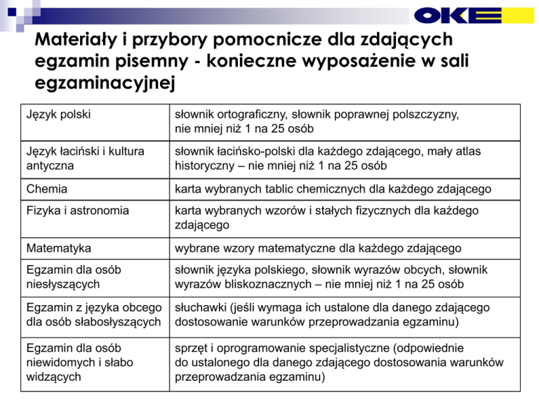 Materiały i przybory pomocnicze dla zdających egzamin pisemny