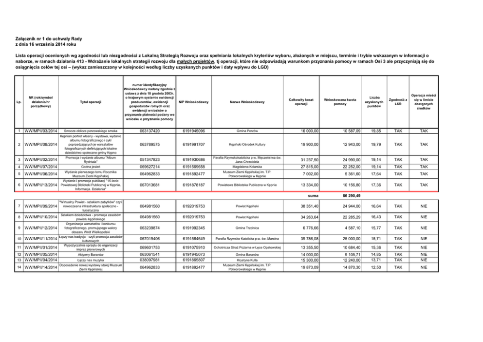 Załącznik nr 1 do uchwały Rady z dnia 16 września 2014 roku Lista operacji ocenionych wg zgodności lub niezgodności z Lokalną Strategią Rozwoju oraz spełniania lokalnych kryteriów wyboru, złożonych w miejscu, terminie i trybie wskazanym w informacji o naborze, w ramach działania 413 - Wdrażanie lokalnych strategii rozwoju dla małych projektów, tj operacji, które nie odpowiadają warunkom przyznania pomocy w ramach Osi 3 ale przyczyniają się do osiągnięcia celów tej osi – (wykaz zamieszczony w kolejności według liczby uzyskanych punktów i daty wpływu do LGD) Tytuł operacji numer identyfikacyjny Wnioskodawcy nadany zgodnie z ustawą z dnia 18 grudnia 2003r. o krajowym systemie ewidencji producentów, ewidencji gospodarstw rolnych oraz ewidencji wniosków o przyznanie płatności podany we wniosku o przyznanie pomocy NIP Wnioskodawcy Nazwa Wnioskodawcy Zgodność z LSR Operacja mieści się w limicie dostępnych środków 19,85 TAK TAK 12 943,00 19,79 TAK TAK 31 237,50 24 990,00 19,14 TAK TAK 27 815,00 22 252,00 19,14 TAK TAK 7 002,00 5 361,60 17,64 TAK TAK 13 334,00 10 156,80 17,36 TAK TAK suma 86 290,49 Lp. NR (rok/symbol działania/nr porządkowy) 1 WW/MPII/03/2014 Smocze oblicze perzowskiego smoka 063137420 6191945096 Gmina Perzów 16 000,00 10 587,09 2 WW/MPII/08/2014 Kępnian portret własny - wystawa, wydanie albumu fotograficznego i cykl poprzedzających je warsztatów fotograficznych definiujących lokalne dziedzictwo społeczne gminy Kępno 063789575 6191991707 Kępiński Ośrodek Kultury 19 900,00 3 WW/MPII/02/2014 Promocja i wydanie albumu "Album Rychtala" 051347823 6191930686 Parafia Rzymskokatolicka p.w. Męczeństwa św. Jana Chrzciciela 4 WW/MPII/07/2014 Godna jesień 069627214 6191569658 Magdalena Kolarska 5 WW/MPII/06/2014 064962833 6191892477 Muzeum Ziemi Kępińskiej im. T.P. Potworowskiego w Kępnie 6 WW/MPII/13/2014 067013681 6191878187 Powiatowa Biblioteka Publiczna w Kępnie 7 WW/MPII/09/2014 8 WW/MPII/10/2014 9 WW/MPII/12/2014 10 WW/MPII/11/2014 11 WW/MPII/01/2014 12 WW/MPII/05/2014 13 WW/MPII/04/2014 14 WW/MPII/14/2014 Wydanie pierwszego tomu Rocznika Muzeum Ziemi Kępińskiej Wydanie i promocja publikacji "15-lecie Powiatowej Biblioteki Publicznej w Kępnie. Informacja. Działania" "Wirtualny Powiat - szlakiem zabytków" czyli nowoczesna infrastruktura społeczno turystyczna Szlakiem dziedzictwa - promocja zasobów powiatu kępińskiego Organizacja warsztatów i konkursu fotograficznego, promującego walory obszaru Wrót Wielkopolski Łączy nas tradycja - czyli promocja zasobów kulturowych Wypożyczalnia sprzętu do organizacji imprez plenerowych Aktywny Baranów Łączy nas muzyka Doposażenie nowej wystawy stałej Muzeum Ziemi Kępińskiej Całkowity koszt operacji Wnioskowana kwota pomocy Liczba uzyskanych punktów 064981560 6192019753 Powiat Kępiński 38 351,40 24 944,00 16,64 TAK NIE 064981560 6192019753 Powiat Kępiński 34 263,64 22 285,29 16,43 TAK NIE 063239874 6191992345 Gmina Trzcinica 6 776,66 4 587,10 15,77 TAK NIE 067019406 6191564649 Parafia Rzymsko-Katolicka p.w. św. Marcina 39 786,08 25 000,00 15,71 TAK NIE 069601753 6191075910 Ochotnicza Straż Pożarna w Łęce Opatowskiej 13 355,50 10 684,40 15,36 TAK NIE 063061541 038097981 6191945073 6191865807 Gmina Baranów 14 000,00 15 300,00 9 105,71 12 240,00 14,85 13,71 TAK TAK NIE NIE 064962833 6191892477 19 873,09 14 870,30 12,50 TAK NIE Krystyna Kulla Muzeum Ziemi Kępińskiej im. T.P. Potworowskiego w Kępnie