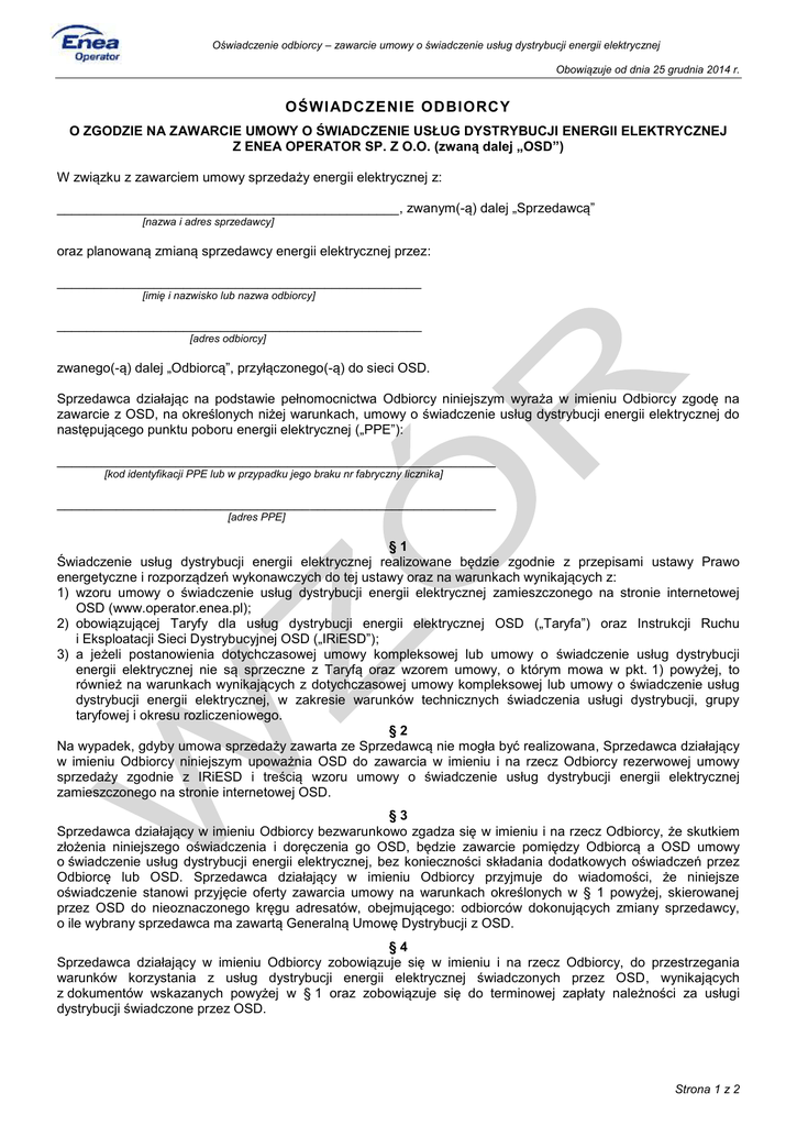 Oświadczenie odbiorcy – zawarcie umowy o świadczenie usług dystrybucji energii elektrycznej Obowiązuje od dnia 25 grudnia 2014 r. OŚWI ADCZENIE ODBIORCY O ZGODZIE NA ZAWARCIE UMOWY O ŚWIADCZENIE USŁUG DYSTRYBUCJI ENERGII ELEKTRYCZNEJ Z ENEA OPERATOR SP. Z O.O. (zwaną dalej „OSD”) W związku z zawarciem umowy sprzedaży energii elektrycznej z: ______________________________________________, zwanym(-ą) dalej „Sprzedawcą” [nazwa i adres sprzedawcy] oraz planowaną zmianą sprzedawcy energii elektrycznej przez: _________________________________________________ [imię i nazwisko lub nazwa odbiorcy] _________________________________________________ [adres odbiorcy] zwanego(-ą) dalej „Odbiorcą”, przyłączonego(-ą) do sieci OSD. Sprzedawca działając na podstawie pełnomocnictwa Odbiorcy niniejszym wyraża w imieniu Odbiorcy zgodę na zawarcie z OSD, na określonych niżej warunkach, umowy o świadczenie usług dystrybucji energii elektrycznej do następującego punktu poboru energii elektrycznej („PPE”): ___________________________________________________________ [kod identyfikacji PPE lub w przypadku jego braku nr fabryczny licznika] ___________________________________________________________ [adres PPE] §1 Świadczenie usług dystrybucji energii elektrycznej realizowane będzie zgodnie z przepisami ustawy Prawo energetyczne i rozporządzeń wykonawczych do tej ustawy oraz na warunkach wynikających z: 1) wzoru umowy o świadczenie usług dystrybucji energii elektrycznej zamieszczonego na stronie internetowej OSD (www.operator.enea.pl); 2) obowiązującej Taryfy dla usług dystrybucji energii elektrycznej OSD („Taryfa”) oraz Instrukcji Ruchu i Eksploatacji Sieci Dystrybucyjnej OSD („IRiESD”); 3) a jeżeli postanowienia dotychczasowej umowy kompleksowej lub umowy o świadczenie usług dystrybucji energii elektrycznej nie są sprzeczne z Taryfą oraz wzorem umowy, o którym mowa w pkt. 1) powyżej, to również na warunkach wynikających z dotychczasowej umowy kompleksowej lub umowy o świadczenie usług dystrybucji energii elektrycznej, w zakresie warunków technicznych świadczenia usługi dystrybucji, grupy taryfowej i okresu rozliczeniowego. §2 Na wypadek, gdyby umowa sprzedaży zawarta ze Sprzedawcą nie mogła być realizowana, Sprzedawca działający w imieniu Odbiorcy niniejszym upoważnia OSD do zawarcia w imieniu i na rzecz Odbiorcy rezerwowej umowy sprzedaży zgodnie z IRiESD i treścią wzoru umowy o świadczenie usług dystrybucji energii elektrycznej zamieszczonego na stronie internetowej OSD. §3 Sprzedawca działający w imieniu Odbiorcy bezwarunkowo zgadza się w imieniu i na rzecz Odbiorcy, że skutkiem złożenia niniejszego oświadczenia i doręczenia go OSD, będzie zawarcie pomiędzy Odbiorcą a OSD umowy o świadczenie usług dystrybucji energii elektrycznej, bez konieczności składania dodatkowych oświadczeń przez Odbiorcę lub OSD. Sprzedawca działający w imieniu Odbiorcy przyjmuje do wiadomości, że niniejsze oświadczenie stanowi przyjęcie oferty zawarcia umowy na warunkach określonych w § 1 powyżej, skierowanej przez OSD do nieoznaczonego kręgu adresatów, obejmującego: odbiorców dokonujących zmiany sprzedawcy, o ile wybrany sprzedawca ma zawartą Generalną Umowę Dystrybucji z OSD. §4 Sprzedawca działający w imieniu Odbiorcy zobowiązuje się w imieniu i na rzecz Odbiorcy, do przestrzegania warunków korzystania z usług dystrybucji energii elektrycznej świadczonych przez OSD, wynikających z dokumentów wskazanych powyżej w § 1 oraz zobowiązuje się do terminowej zapłaty należności za usługi dystrybucji świadczone przez OSD. Strona 1 z 2 Oświadczenie odbiorcy – zawarcie umowy o świadczenie usług dystrybucji energii elektrycznej Obowiązuje od dnia 25 grudnia 2014 r. §5 OSD na podstawie niniejszego oświadczenia, z zastrzeżeniem prawidłowego wypełnienia tego oświadczenia i podania właściwych danych, będzie zobowiązany do świadczenia na rzecz Odbiorcy usługi dystrybucji energii elektrycznej dla wskazanego punktu poboru energii elektrycznej, zgodnie z warunkami świadczenia tej usługi wskazanymi powyżej w § 1. §6 Poprzez złożenie niniejszego oświadczenia następuje zawarcie umowy o świadczenie usług dystrybucji energii elektrycznej pomiędzy Odbiorcą i OSD, bez konieczności składania dodatkowych oświadczeń. Umowa o świadczenie usług dystrybucji energii elektrycznej zostaje zawarta na czas nieoznaczony i wchodzi w życie w dniu rozpoczęcia sprzedaży energii elektrycznej przez Sprzedawcę lub w dniu rozpoczęcia sprzedaży rezerwowej, w przypadku gdy umowa sprzedaży zawarta ze Sprzedawcą nie będzie mogła być realizowana. Niezależnie od powyższego, w celu potwierdzenia zawarcia umowy o świadczenie usług dystrybucji energii elektrycznej, OSD zobowiązuje się do przesłania do Sprzedawcy, jako pełnomocnika Odbiorcy podpisanego przez OSD egzemplarza umowy. Odbiorca nie jest uprawniony do dokonywania zmian lub uzupełnień w potwierdzeniu umowy, a dokonanie takich zmian lub uzupełnień nie ma wpływu na treść zawartej umowy. §7 Sprzedawca działając w imieniu własnym oświadcza, że uzyskał pełnomocnictwo do złożenia w imieniu Odbiorcy niniejszego oświadczenia. Jednak gdyby okazało się, że Sprzedawca złożył niniejsze oświadczenie nie będąc do tego prawidłowo umocowany przez Odbiorcę lub gdyby Sprzedawca przekroczył zakres udzielonego mu umocowania, lub gdyby osoby składające to oświadczenie z upoważnienia Sprzedawcy nie zostały do tego prawidłowo umocowane, lub gdyby Sprzedawca nie przekazał OSD w terminie oryginału dokumentu, z którego wynika prawidłowość umocowania, to wówczas – bez względu na przyczynę tego stanu – Sprzedawca odpowiada za wszelką wynikającą stąd szkodę w pełnym zakresie. W szczególności w takim przypadku Sprzedawca zobowiązuje się do zapłaty na rzecz OSD wszelkich wynikających z Taryfy opł