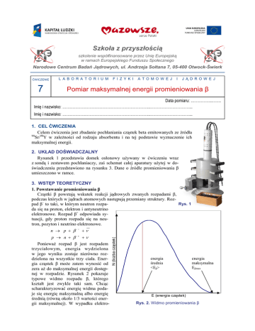 Szkoła z przyszłością szkolenie współfinansowane przez Unię Europejską w ramach Europejskiego Funduszu Społecznego Narodowe Centrum Badań Jądrowych, ul. Andrzeja Sołtana 7, 05-400 Otwock-Świerk ĆWICZENIE 7 L A B O R A T O R I U M F I Z Y K I A T O M O W E J I J Ą D R O W E J Pomiar maksymalnej energii promieniowania β Data pomiaru: ……………..……. Imię i nazwisko: …………………………………………………………...…………………………... Imię i nazwisko: …………………………………………………………...…………………………... 1. CEL ĆWICZENIA Celem ćwiczenia jest zbadanie pochłaniania cząstek beta emitowanych ze źródła 90 Sr/90Y w zależności od rodzaju absorbentu i na tej podstawie wyznaczenie ich maksymalnej energii. 2. UKŁAD DOŚWIADCZALNY Rysunek 1 przedstawia domek osłonowy używany w ćwiczeniu wraz z sondą i zestawem pochłaniaczy, zaś schemat całej aparatury użytej w doświadczeniu przedstawiono na rysunku 3. Dane o źródle promieniowania β umieszczono w ramce. n → p + β − +ν p → n + β + +ν Ponieważ rozpad β jest rozpadem trzyciałowym, energia wydzielona w jego wyniku zostaje nierówno rozdzielona na wszystkie trzy ciała. Energia cząstek β może zatem wynosić od zera aż do maksymalnej energii dostępnej w rozpadzie. Rysunek 2 pokazuje typowe widmo rozpadu β, którego kształt jest zwykle taki sam. Chcąc scharakteryzować energię widma podaje się energię maksymalną albo energię średnią (równą około 1/3 wartości energii maksymalnej). W wypadku elektro- N (liczba cząstek) 3. WSTĘP TEORETYCZNY 1. Powstawanie promieniowania β Cząstki β powstają wskutek reakcji jądrowych zwanych rozpadami β, podczas których w jądrach atomowych następują przemiany struktury. RozRys. 1 pad β– to taki, w którym neutron rozpada się na proton, elektron i antyneutrino elektronowe. Rozpad β+ odpowiada sytuacji, gdy proton rozpada się na neutron, pozyton i neutrino elektronowe. energia średnia <Eβ> energia maksymalna Eβmax E (energia cząstek) Rys. 2. Widmo promieniowania β „Szkoła z przyszłością” - szkolenie współfinansowane ze środków Europejskiego Funduszu Społecznego zasilacz wysokiego napięcia wzmacniacz impulsów dyskryminator przelicznik impulsów USB sonda scyntylacyjna domek osłonowy pochłaniacz komputer źródło promieniowania β Rys. 3. Schemat aparatury pomiarowej nów przyspieszanych w akceleratorze możemy uzyskiwać elektrony o jednej, zadanej wartości energii, zwanych monoenergetycznymi. Ich widmo ma kształt pojedynczego wąskiego piku. 2. Oddziaływanie promieniowania β z materią Mówiąc o promieniowaniu β myślimy o strumieniach elektronów lub pozytonów. Głównym procesem usuwającym z wiązki pozytony jest ich anihilacja. Elektrony, przechodząc przez materię, tracą swoją energię głównie w wyniku jednego z trzech zjawisk: zderzeń sprężystych, zderzeń niesprężystych i promieniowania hamowania. a) zderzenia sprężyste W zderzeniu sprężystym z atomami ośrodka zachowywana jest energia kinetyczna cząstki. Zmianie ulega tor, przy czym im mniejsza jest energia elektronu, tym średnie odchylenie, doznane w wyniku rozproszeń, jest większe. Na skutek częstych zderzeń tor elektronu jest linią łamaną o długości kilka razy większej niż grubość warstwy, przez którą przechodzi. b) zderzenia niesprężyste W zderzeniach elektronów (cząstki β−) z elektronami orbitalnymi atomów cząstki β− mogą przekazać część swojej energii na jonizację lub wzbudzenie tych atomów. Strata energii na jonizację, odniesiona do jednostki drogi, jest w przybliżeniu odwrotnie proporcjonalna do kwadratu prędkości cząstki: NZ Z 1 dE ∝ 2 = ρ ⋅ N Av ⋅ 2 (1) dx v A v j gdzie: A – średnia masa atomowa absorbentu, Z – średnia liczba atomowa absorbentu, NAv – liczba Avogadro, ρ – gęstość absorbentu, N – liczba atomów w cm3, v – prędkość cząstki. Tę samą stratę energii można również wyrazić w postaci: dE (2) = wI w dx j gdzie: w – ilość energii potrzebna do utworzenia jednej pary jonów (dla powietrza to około 32,5 eV), Iw – jonizacja właściwa (ilość par jonów powstałych na jednostkę drogi), której wielkość dla danego ośrodka zależna jest od energii padającego promieniowania β. c) promieniowanie hamowania Jest to zjawisko, którego wpływ jest istotny głównie dla elektronów o wysokiej energii. Polega ono na hamującym oddziaływaniu sił elektrostatycznych na elektron przechodzący w pobliżu jądra atomu. Energia, jaką traci elektron, emitowana jest w postaci promieniowania rentgenowskiego o ciągłym widmie. Wielkość tej straty na jednostkę drogi określa wzór: dE 2 ∝ Z NE (3) dx h gdzie E oznacza energię elektronów, a Z i N średnią liczbę atomową absorbentu i liczbę jego atomów przypadającą na 1 cm3. -2- „Szkoła z przyszłością” - szkolenie współfinansowane ze środków Europejskiego Funduszu Społecznego D ANE O ŹRÓDLE P RO MIE NIO TWÓ RCZYM 90 Sr/90Y Rozpad promieniotwórczy β− polega na emisji z jądra atomowego danego izotopu elektronu β− oraz antyneutrina ν̄. Źródłem promieniowania β− jest w naszym ćwiczeniu sukcesywny rozpad izotopów strontu i itru: 90 Sr → 90 Y → 90 Zr Dla rozpadu: 90 38 Sr → 90 39 Y + β − +ν T½ = 28,64 lat. Wynikiem spełnienia prawa zachowania energii i prawa zachowania pędu dla trzech ciał − w tym przypadku są to: jądro atomowe 90Y, elektron β− i antyneutrino ν̄ − jest ciągłe widmo energetyczne elektronów, kończące się na energii Eβmax = 0,546 MeV, wynikającej z różnicy mas jądra wyjściowego 90Sr i jądra końcowego 90Y. Dla rozpadu 90Sr Eβ ≤ 0,546 MeV, a energia średnia <Eβ > = 0,196 MeV. Jądro 90Y jest również promieniotwórcze: 90 39 Widmo ciągłe promieniowania β− z rozpadu 90Sr Energia elektronów % beta [keV] 0 – 10 2,88 1